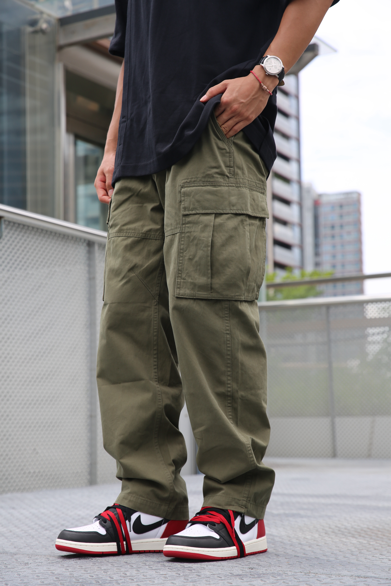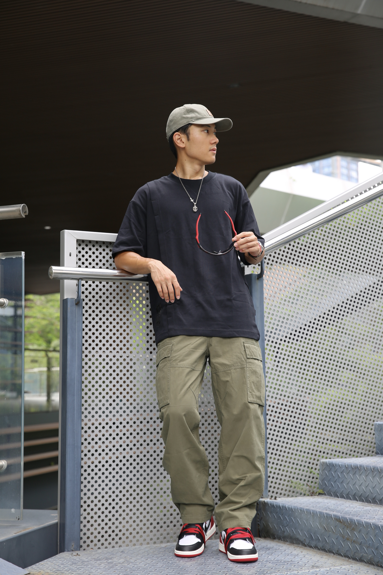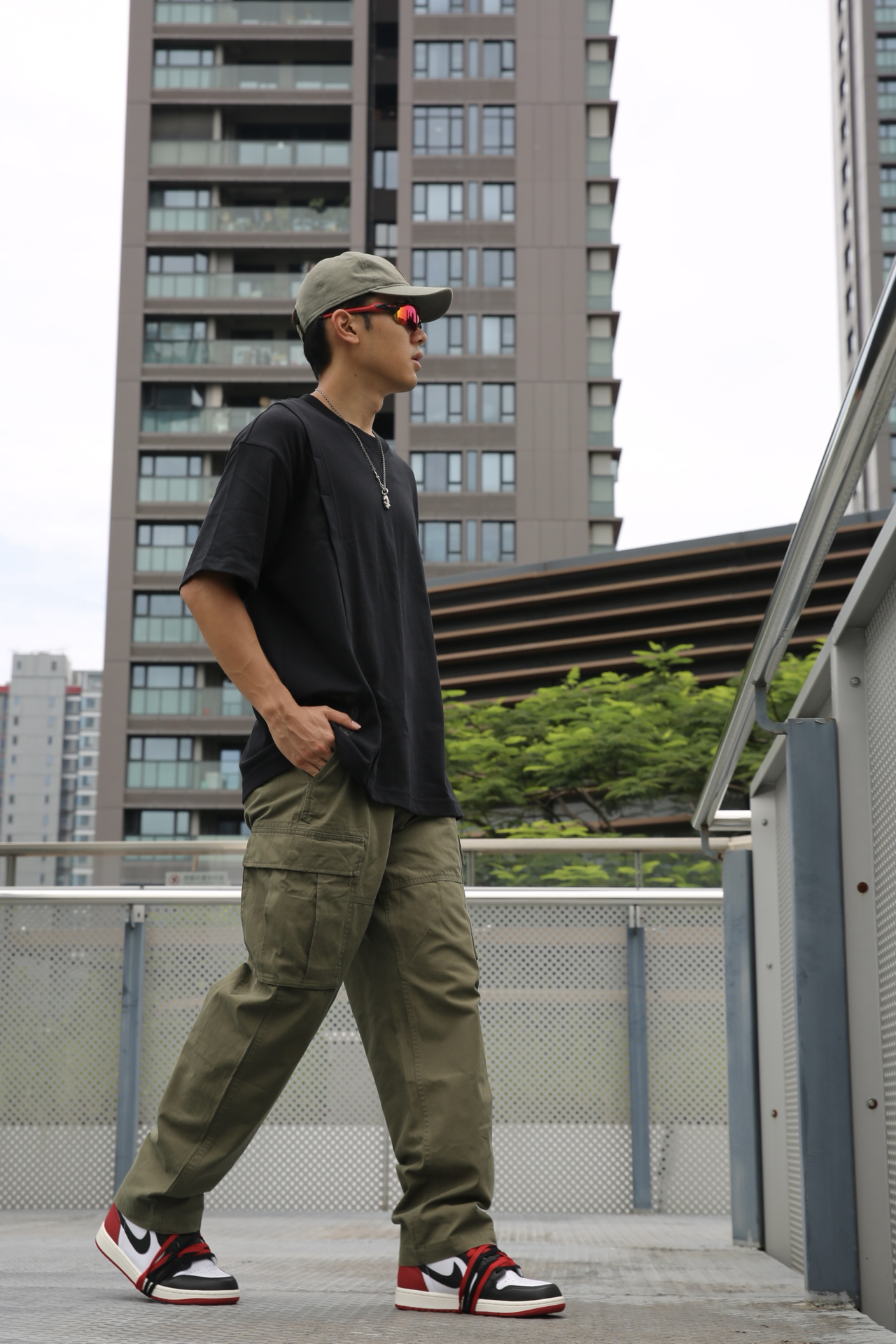 🔸夏天当然少不了工装元素,今天上身的深绿色的工装裤,更有点沉稳的气质。版型是直筒,不挑腿型。 🔸上身是纯黑T,干净简单,和裤子形成深色调的统一。脚上穿了AJ1黑脚趾,红色正好和墨镜呼应。 🔸这样一套,街头感和实穿性都拿捏了 #潮流直筒工装裤 #预热一下秋冬穿搭 #秋冬穿搭** #拯救丑衣服 #叛逆男孩ootd
