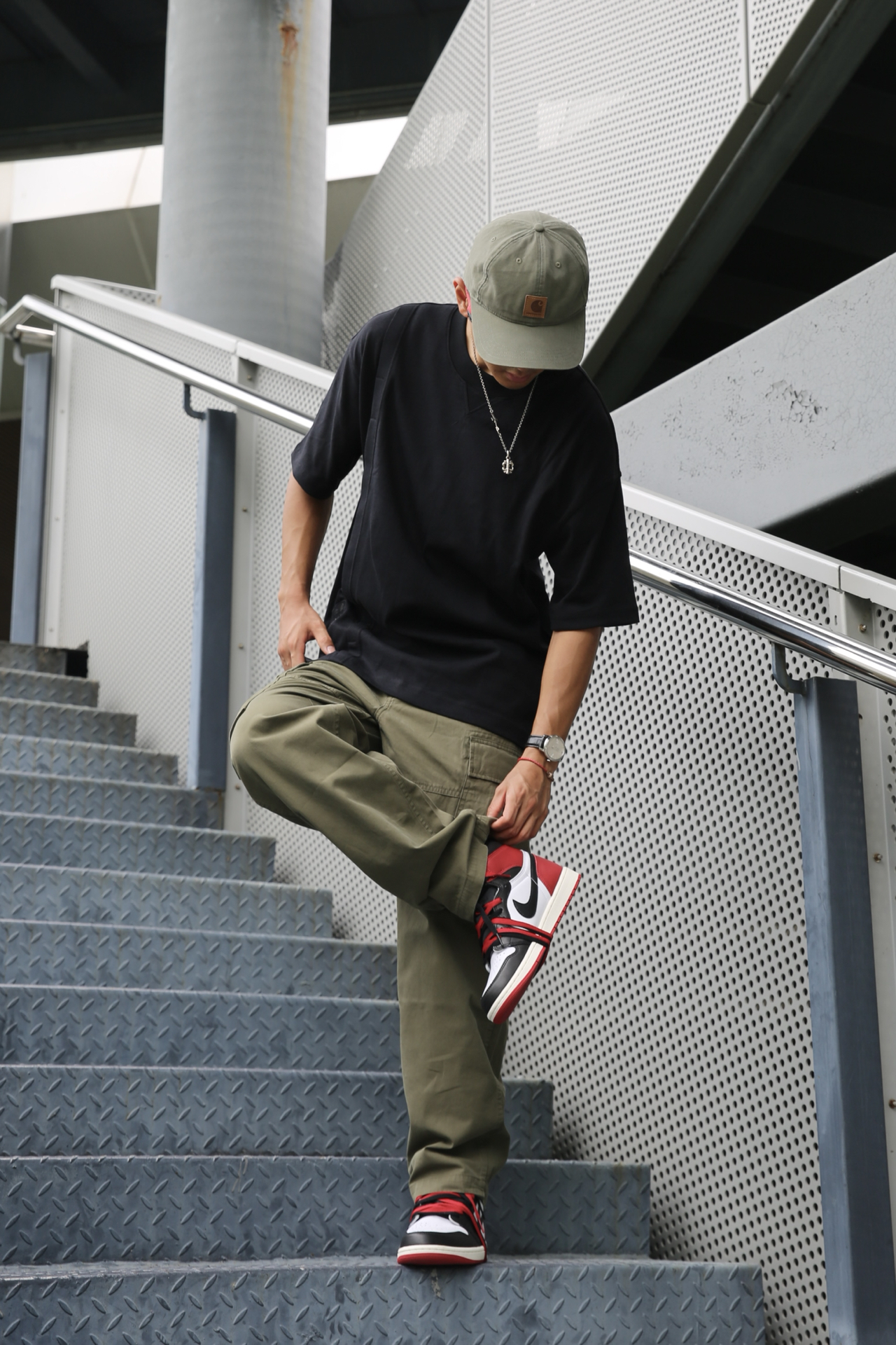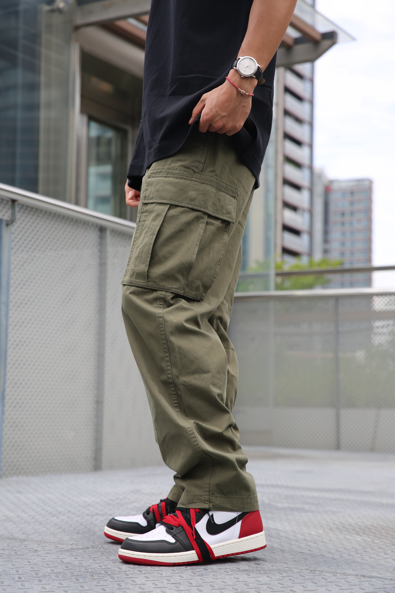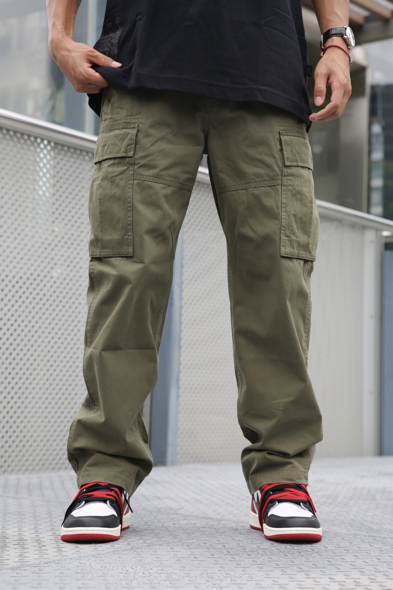 🔸夏天当然少不了工装元素,今天上身的深绿色的工装裤,更有点沉稳的气质。版型是直筒,不挑腿型。 🔸上身是纯黑T,干净简单,和裤子形成深色调的统一。脚上穿了AJ1黑脚趾,红色正好和墨镜呼应。 🔸这样一套,街头感和实穿性都拿捏了 #潮流直筒工装裤 #预热一下秋冬穿搭 #秋冬穿搭** #拯救丑衣服 #叛逆男孩ootd