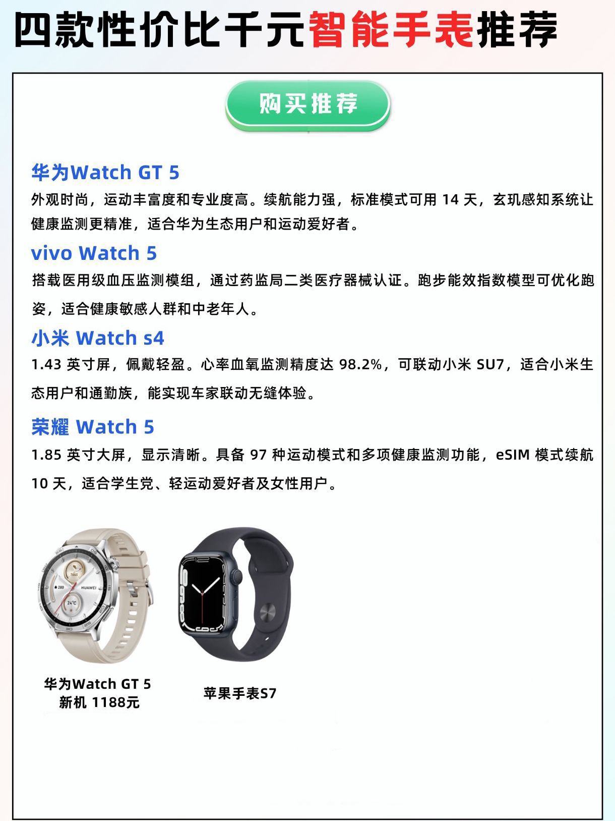 四款高性价比千元智能手表推荐 1. 华为Watch GT 5 时尚外观设计,配备专业运动监测功能。续航长达14天,搭载玄玑感知系统提升健康数据精准度,完美适配华为生态用户和运动爱好者需求。 2. vivo Watch 5 通过药监局认证的医用级血压监测功能是其亮点,跑步能效指数模型可智能优化跑步姿势,特别适合注重健康监测的中老年用户群体。 3. 小米Watch 54 配备1.43英寸显示屏,...