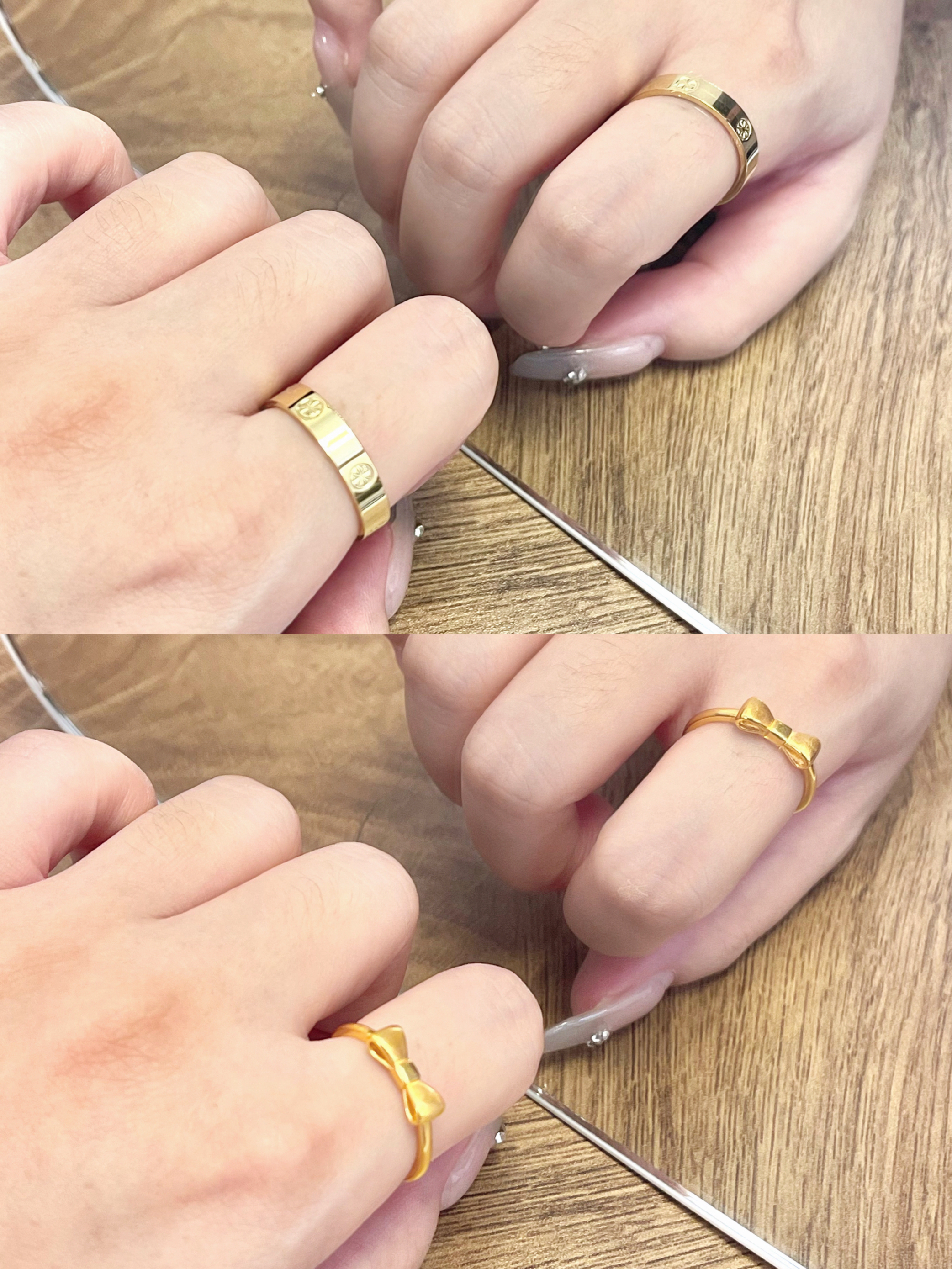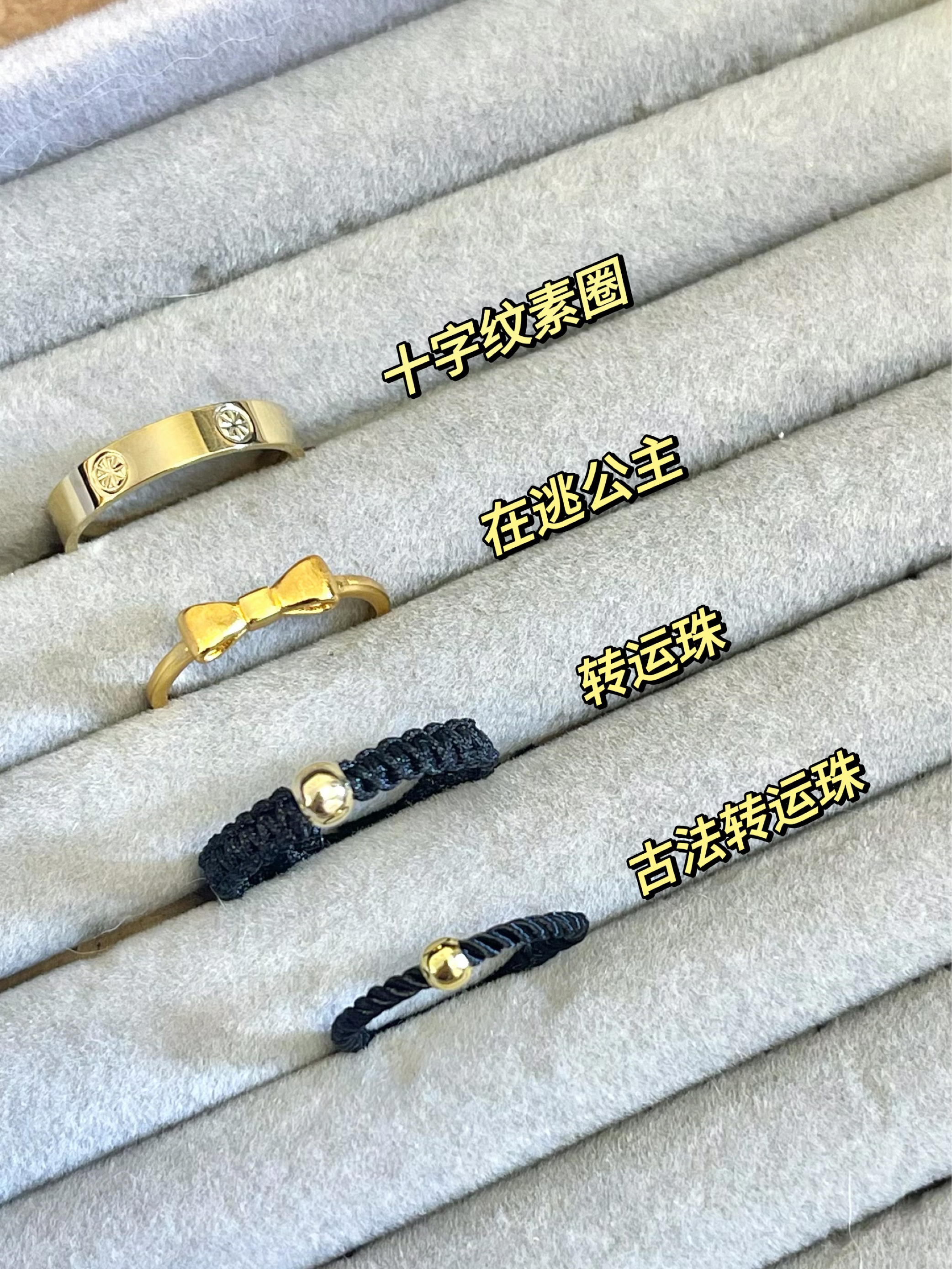 金灿灿的小戒指真的好好看 小克重的黄金戒指💍 日常通勤佩戴也不招摇还提气质 而且四款戒指 都很特别风格各异 蝴蝶结戒指 可可爱爱 很适合搭配小裙子👗 十字花纹戒指 大气又简约 搭配小西装酷酷的说 转运珠戒指 复古又精致 搭配旗袍嘎嘎有气质~ 每一款都很有特色✨