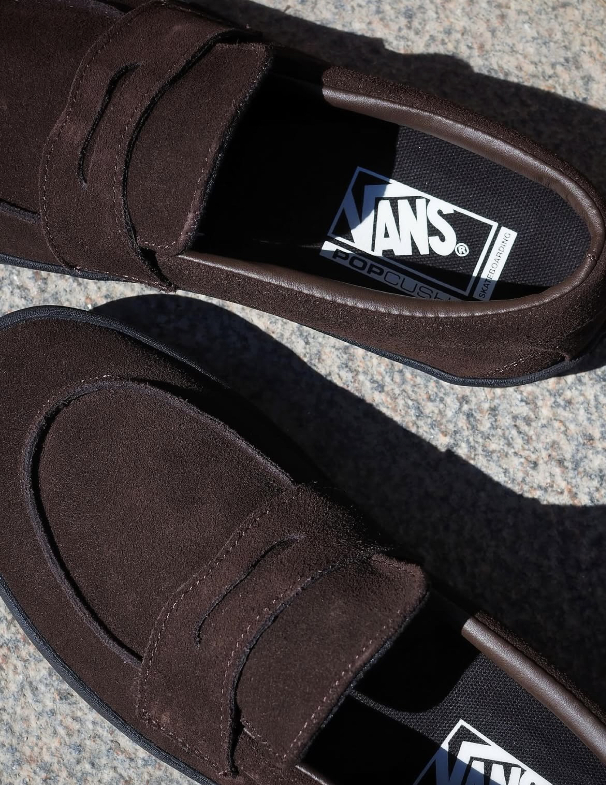 秋冬新品 Vans Loafer 乐福鞋,除了经典的黑色,这款复古的棕色也很不错,同样也是麂皮鞋面,搭配黑色包边,鞋垫是可拆卸的 popcush,脚感更好!