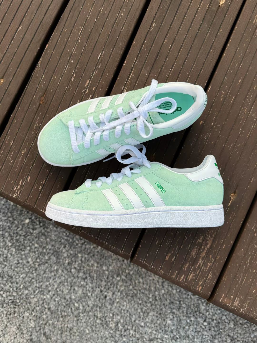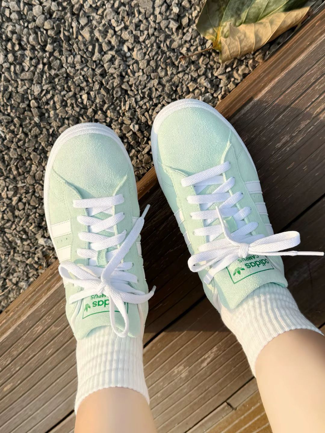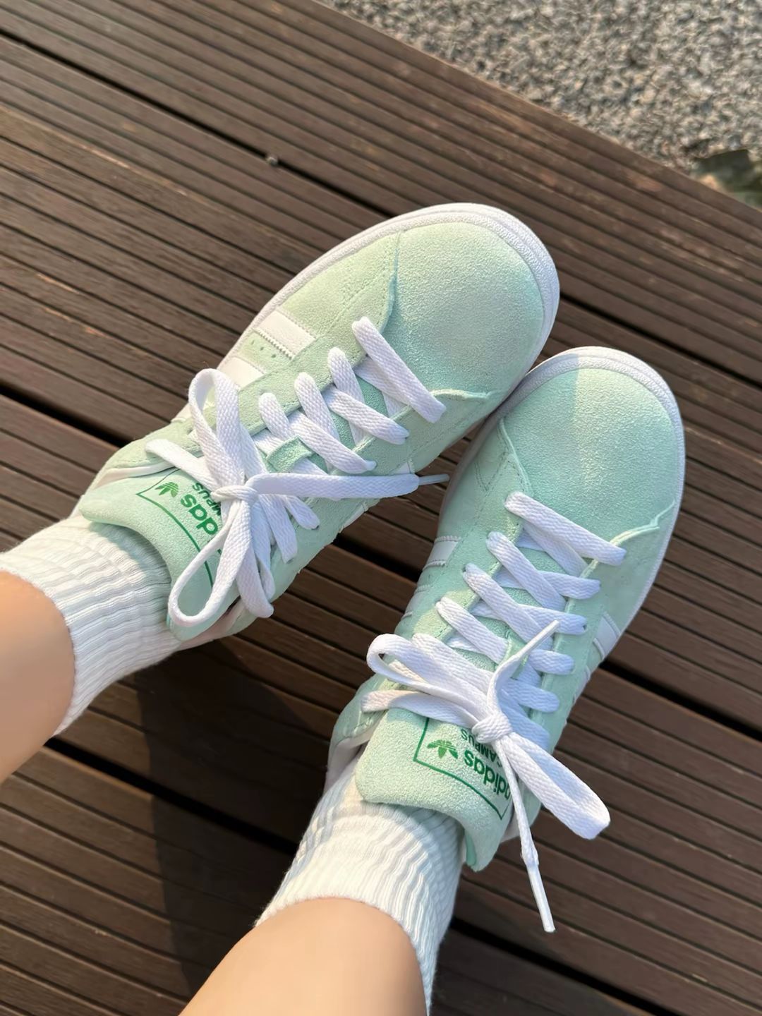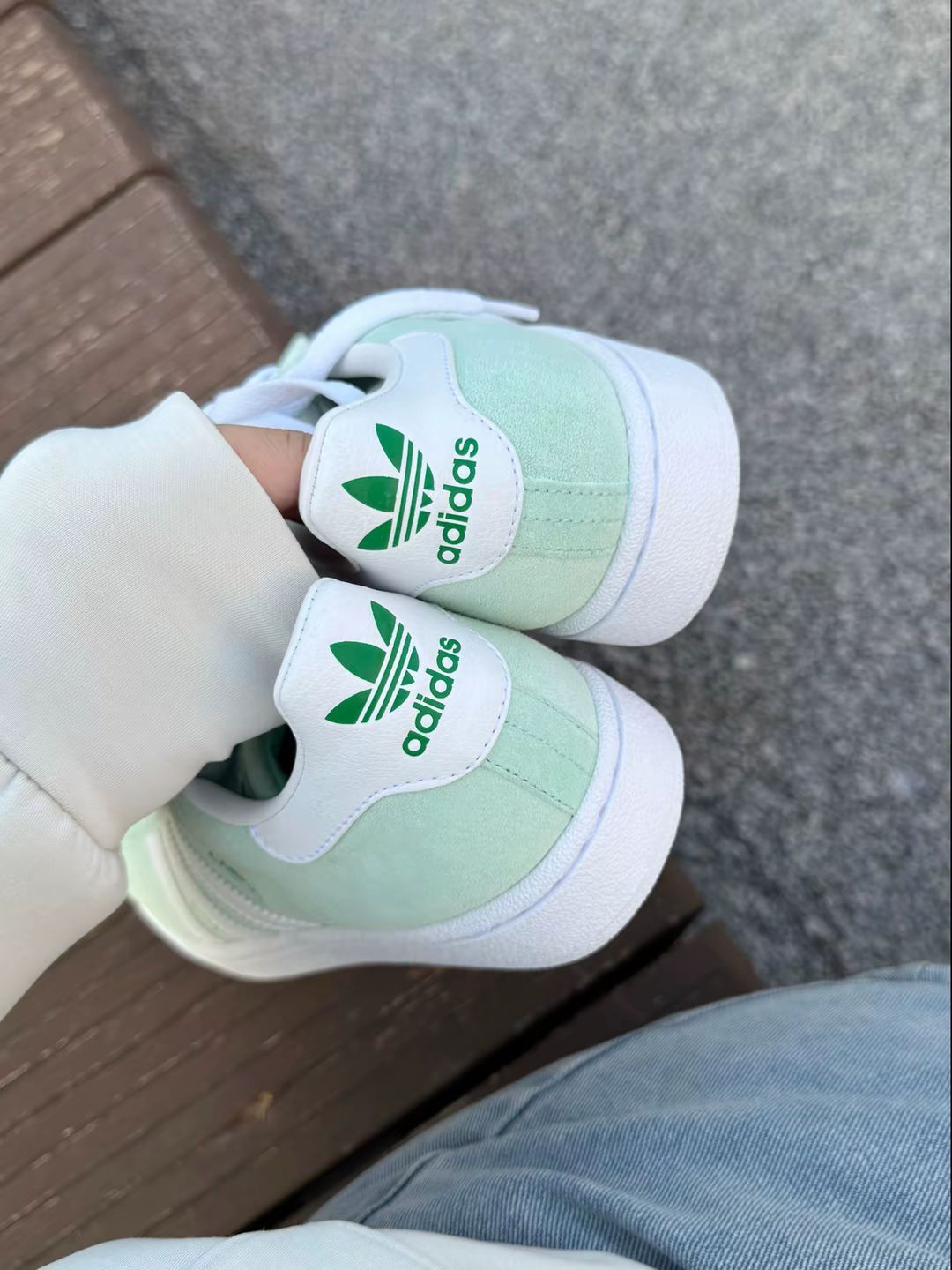 今天逛公园穿的绿色campus 颜色清清爽爽,搭配起来很吸睛 开学季了,这双真的蛮适合呀 不偏码 按正常尺码选择就好