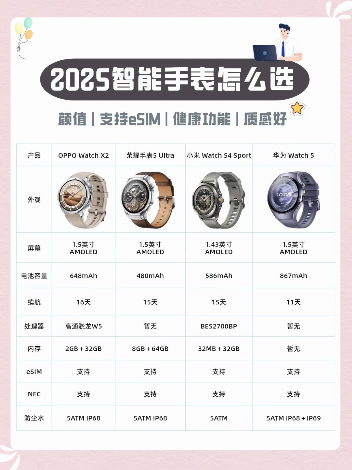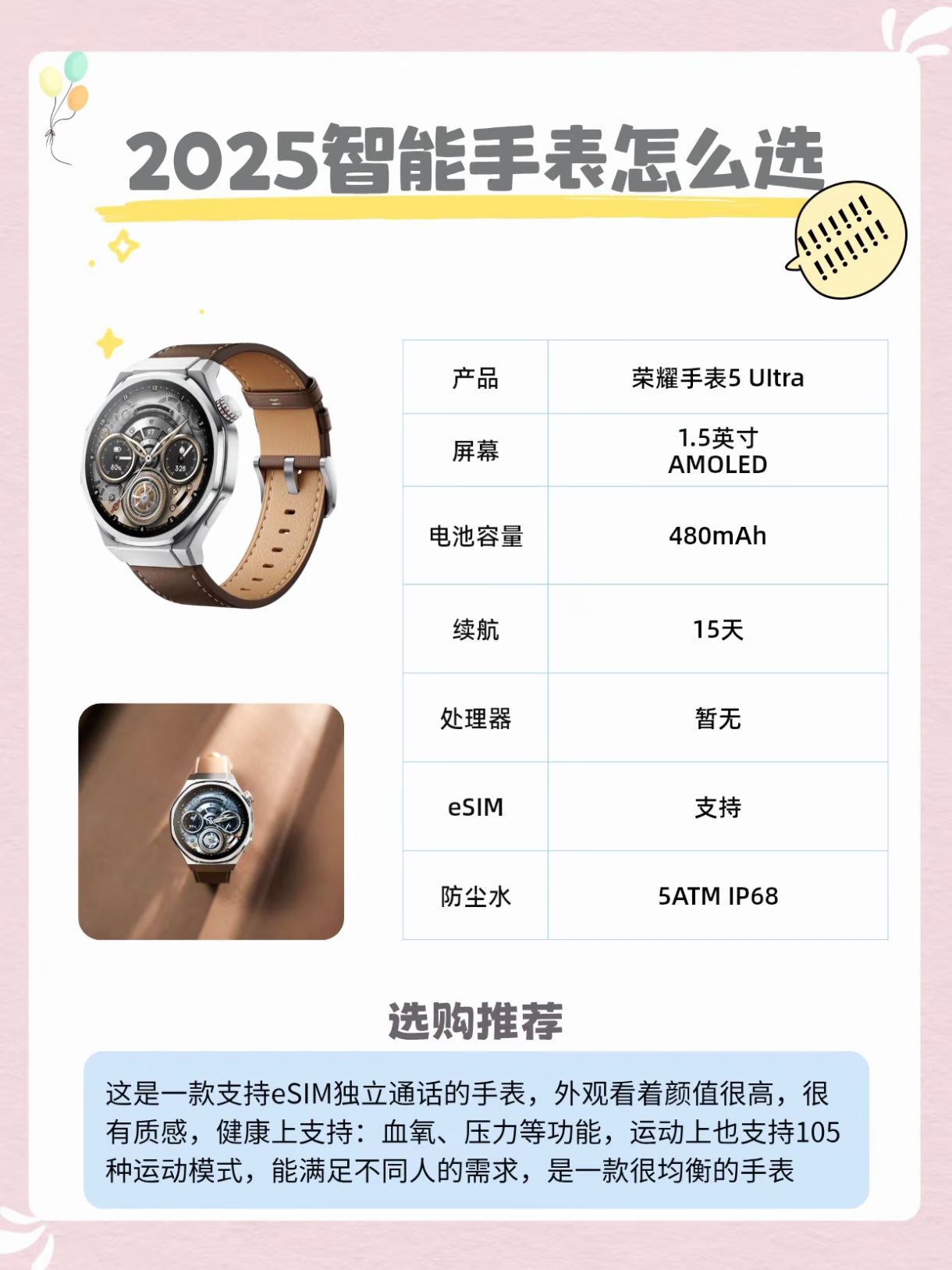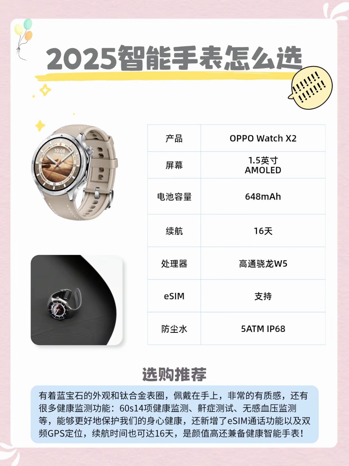 兄弟们,最近研究2025新出的智能手表看得眼花缭乱,挑出四款个人觉得最值得关注的分享一下真实感受: OPPO Watch X2 质感真绝了,上手那个钛合金和蓝宝石的feel不是盖的,戴半个月不用充是真舒服🤣。健康监测也卷,还能独立打电话,精致实用派。 荣耀手表5 Ultra 复古精英范,棕色皮表带配精致表盘太有腔调了!运动模式多到玩不过来,eSIM、健康该有的都有,实力很均衡。 小米 Wat...