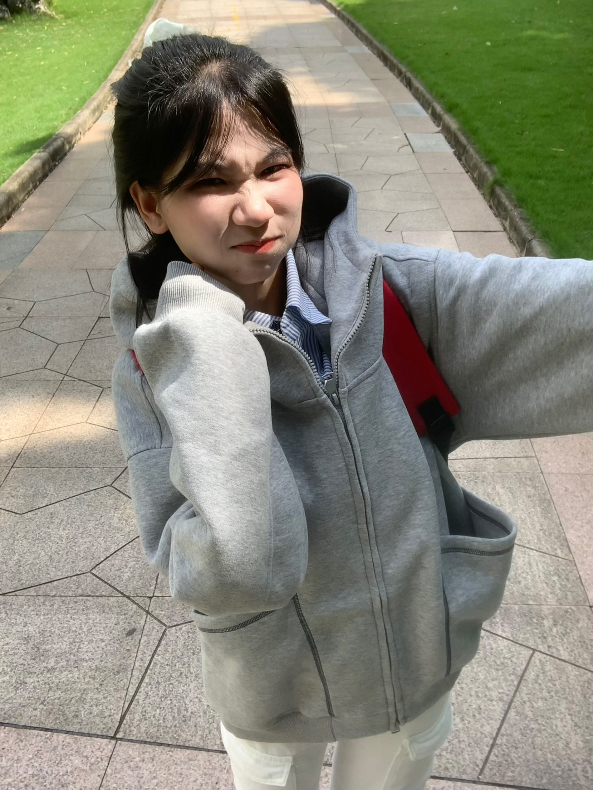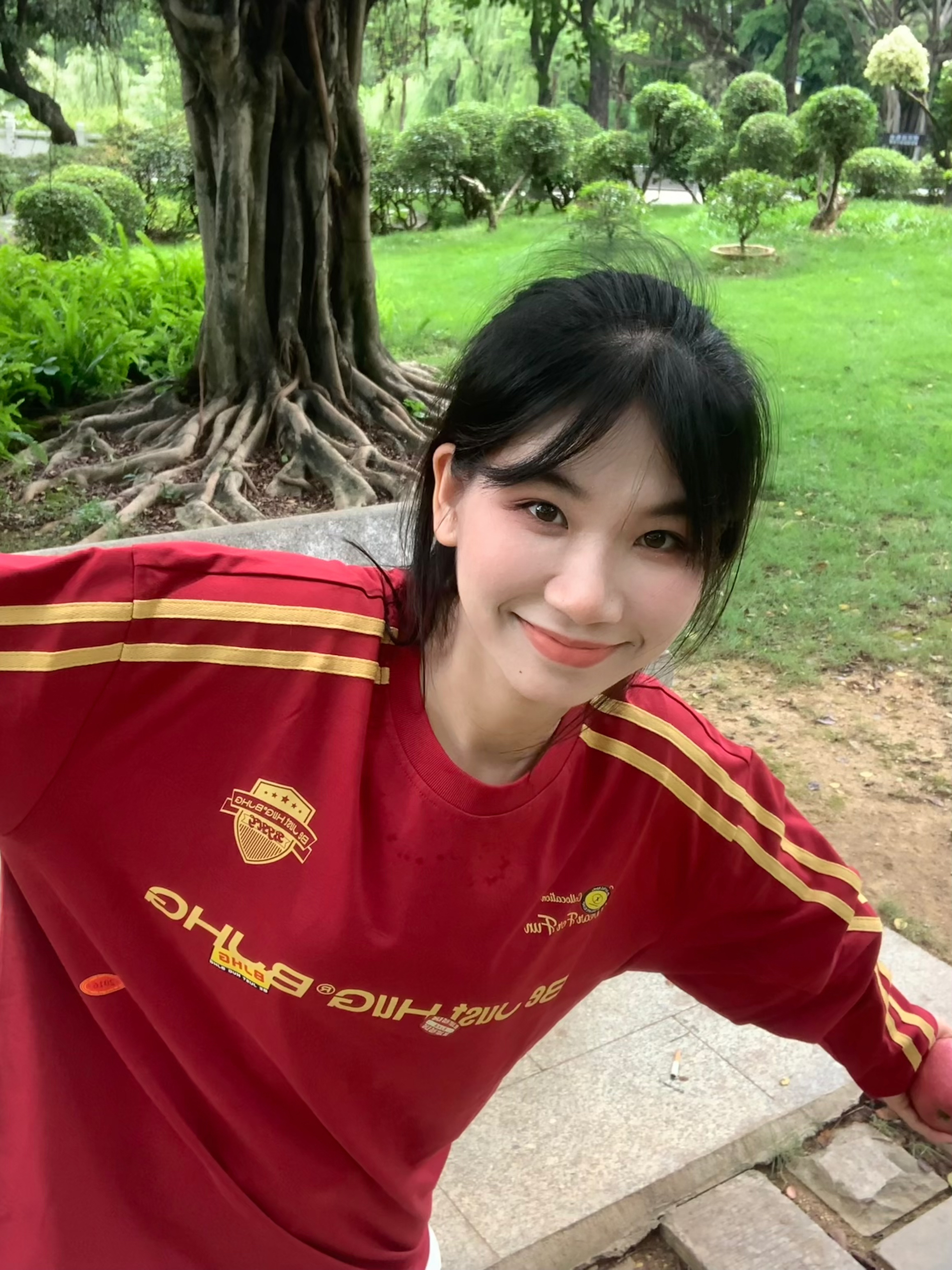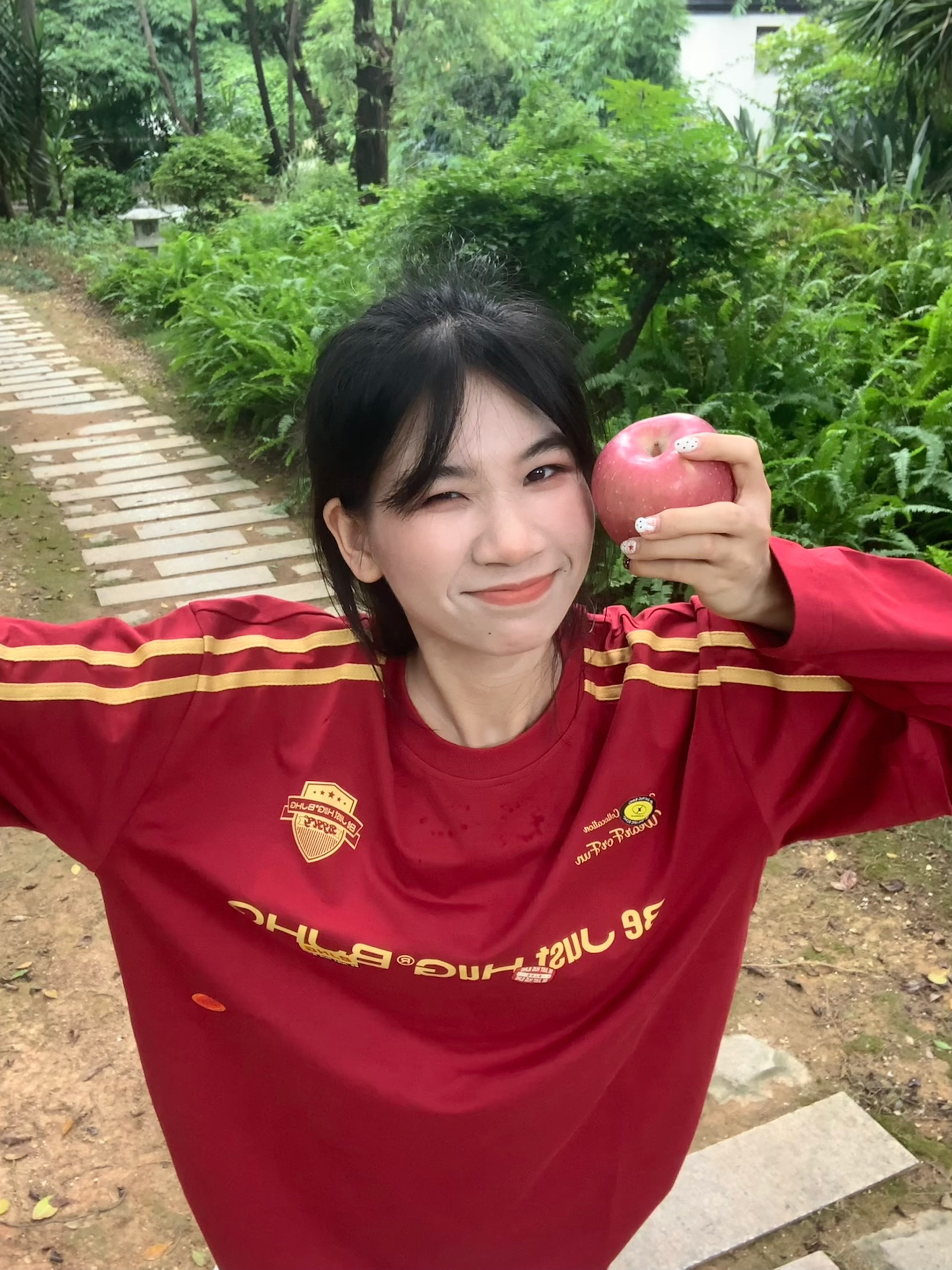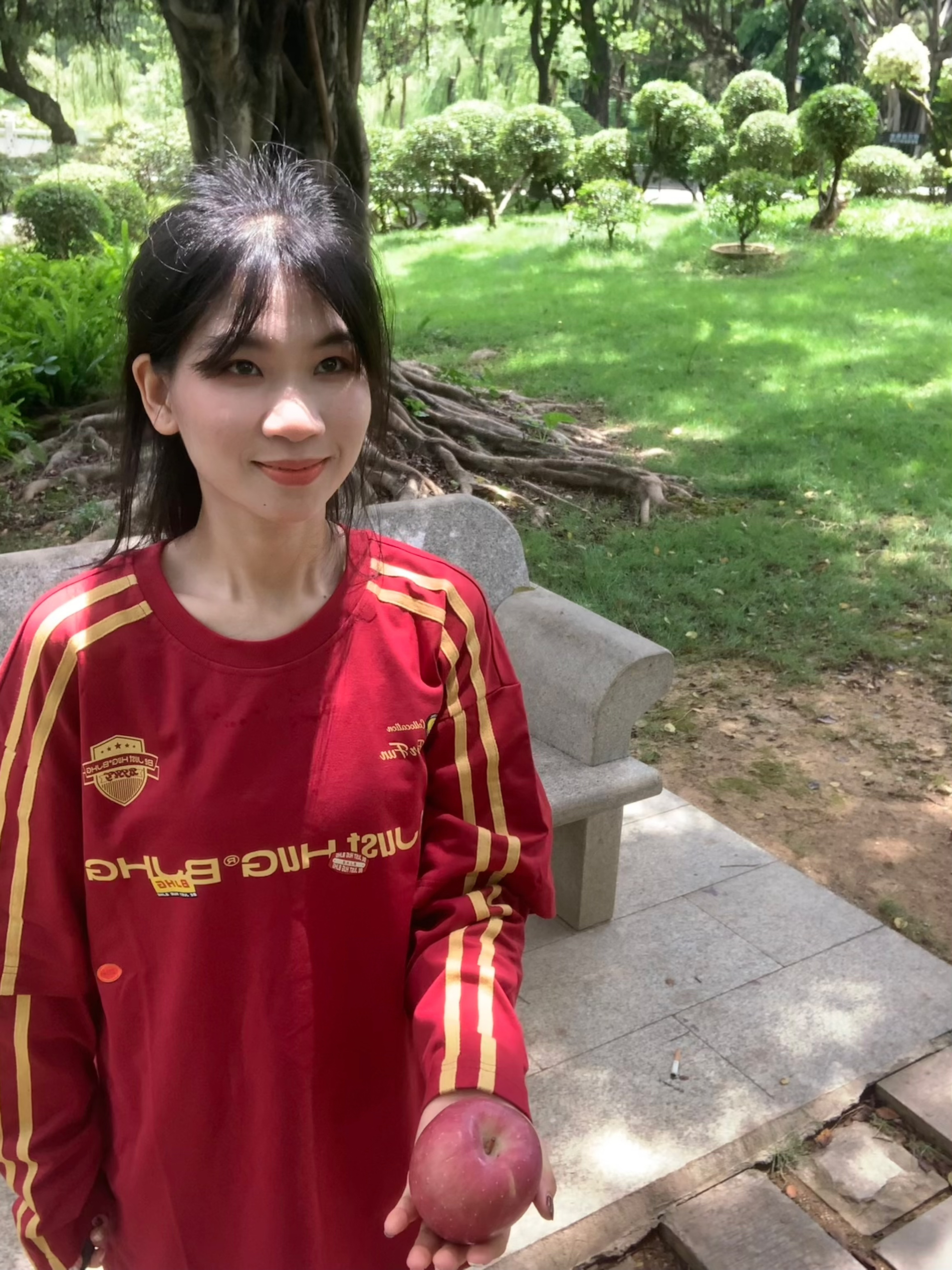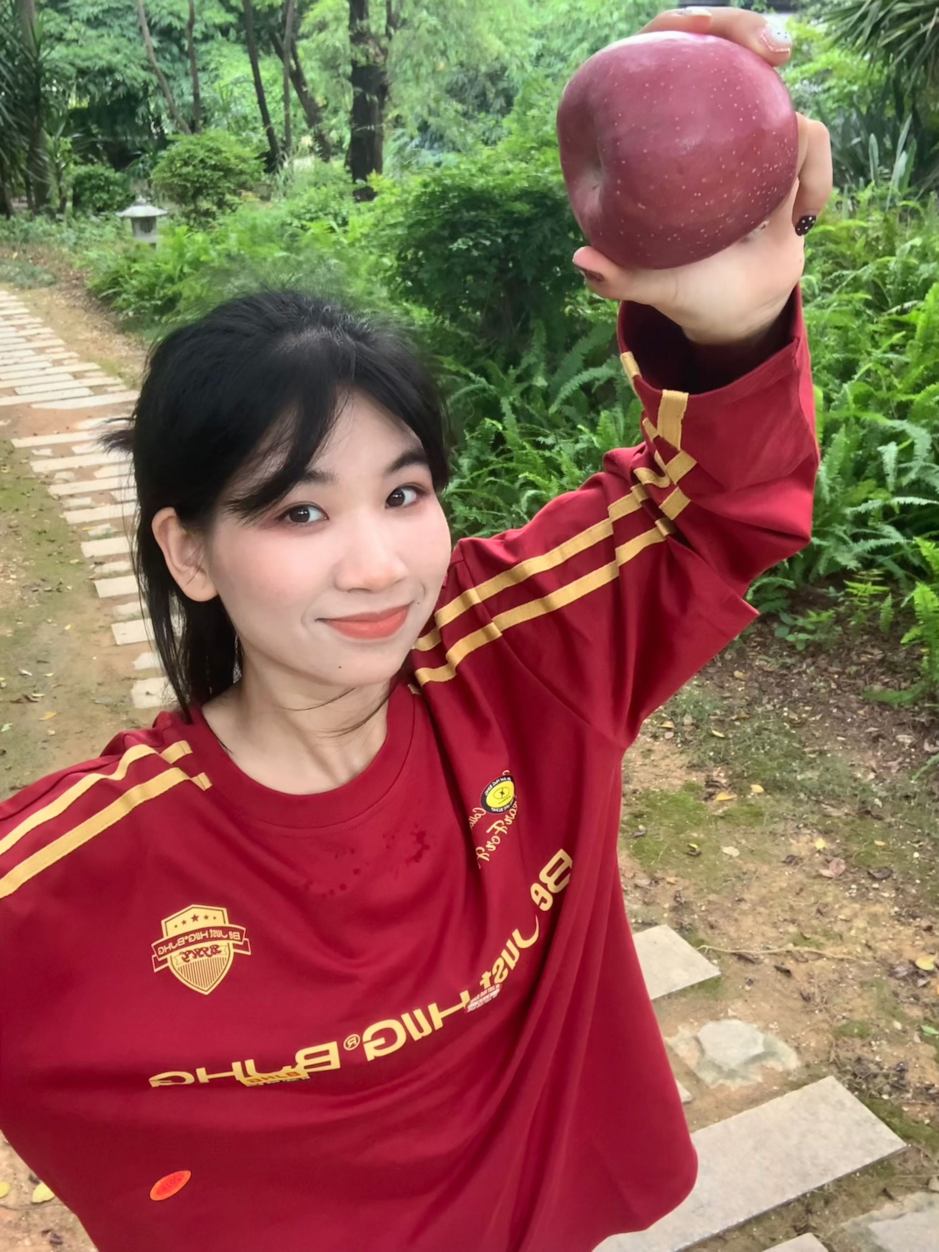 深色系的红色长袖 搭配白色牛仔裤 还有一个红苹果作为小心思道具 以长袖颜色相对应风格 然后再挑一个光线充足用明亮的场景 不要逆光拍照 这样才会显得整个人的皮肤又白又通透 出片的成果会惊喜不断 我们拍照前要对焦好镜头 这样相片才会清晰 我们可以准备一个支架和蓝牙遥控器 或者调节手机倒计时3秒或10秒 跟朋友一起出门的话不需要准备支架这些了 我们拍照前要注意一下表情管理看个人风格 可以把一些适合我们...