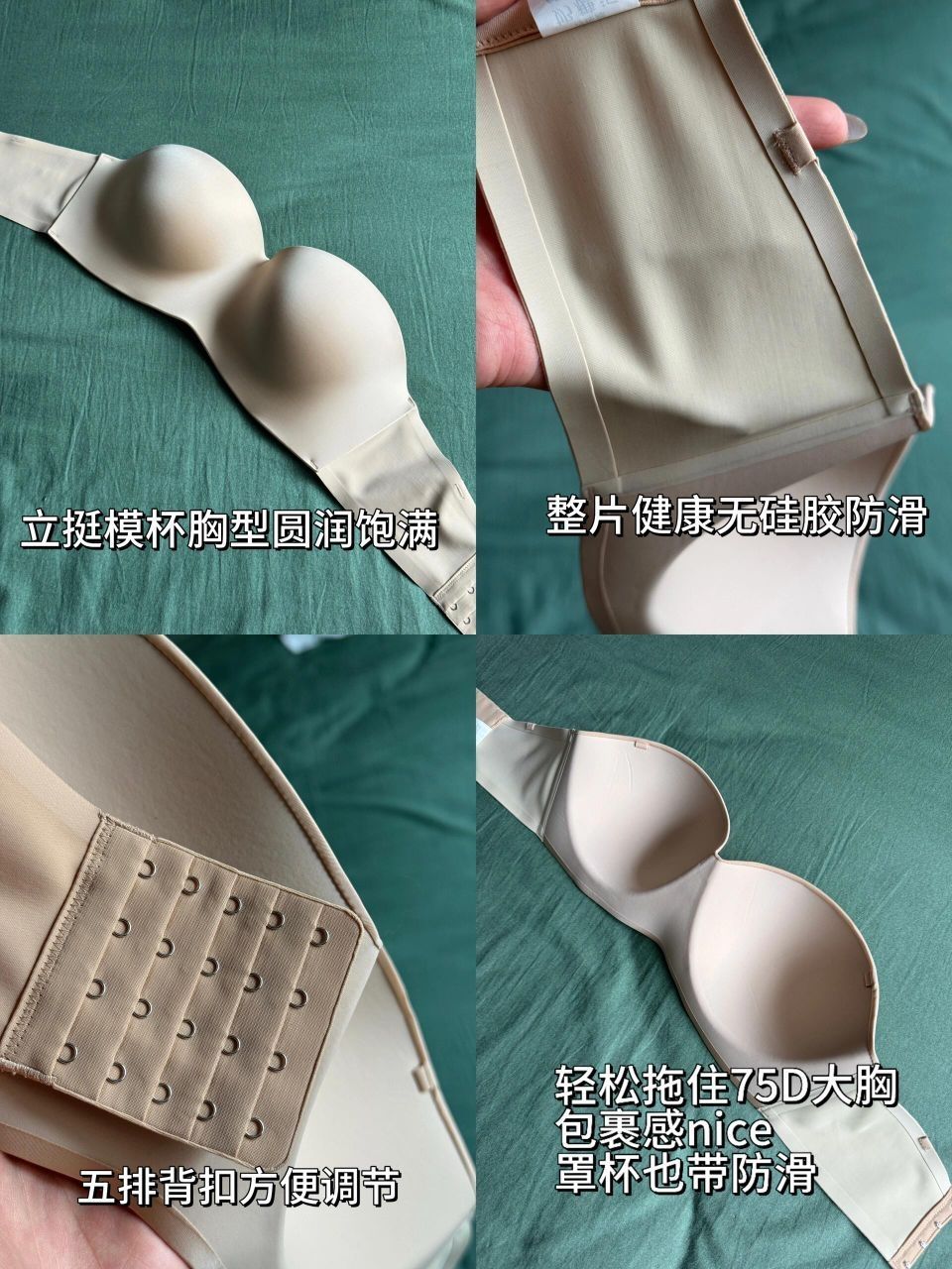 以前穿吊带为了无痕不穿内衣 买了各式各样的胸贴 后面发现穿紧身的吊带会勒出胸贴的印子网 试了各种各样的无肩带内衣终于找到让我最满意的了! 就是这个奶糖女孩蹦迪杯!我75D的胸都能很好的包裹承托起来, 不管是正面还是侧面都显的胸型很好看,面料软软的穿起来很透气 最重要的是穿一天都不掉!全件价罩杯都做了防滑面料 这个全方位防滑太权威了!我从早上九点到下午五一直拍摄都没掉过~ 出门没有一直拉内衣的烦恼是...