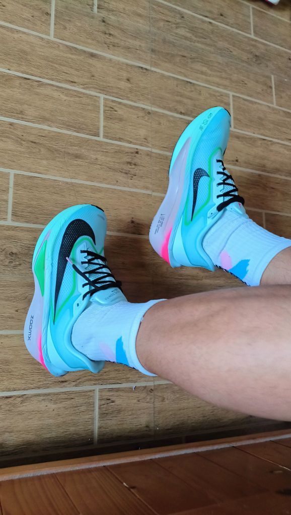 这双Zoom Fly 6已经陪我跑了300多公里,包括几次半马训练,分享一下真实体验: 1. **中底反馈** React泡棉+碳板的组合在长距离训练中表现稳定,特别是15公里后依然能感受到回弹,不会像有些碳板鞋后半程泄力。 2. **重量与透气** 单只42码238克,比上一代轻了15克左右。鞋面透气孔增加,夏天30度高温跑完袜子还是干的,这点很满意。 3. **湿地表...