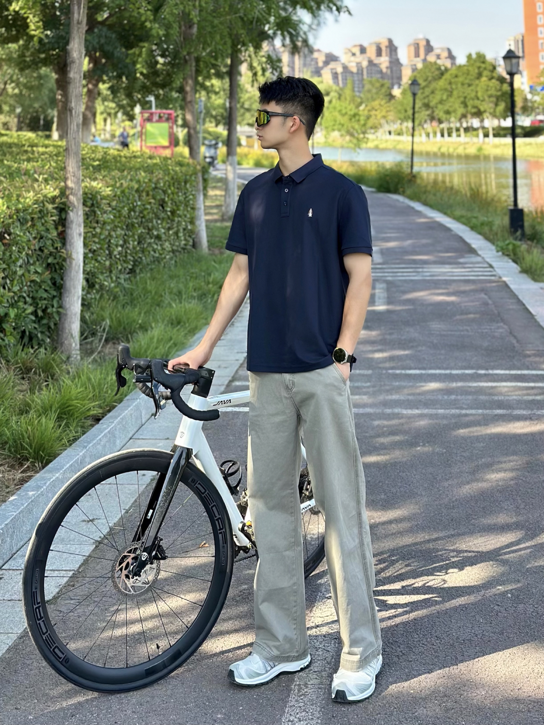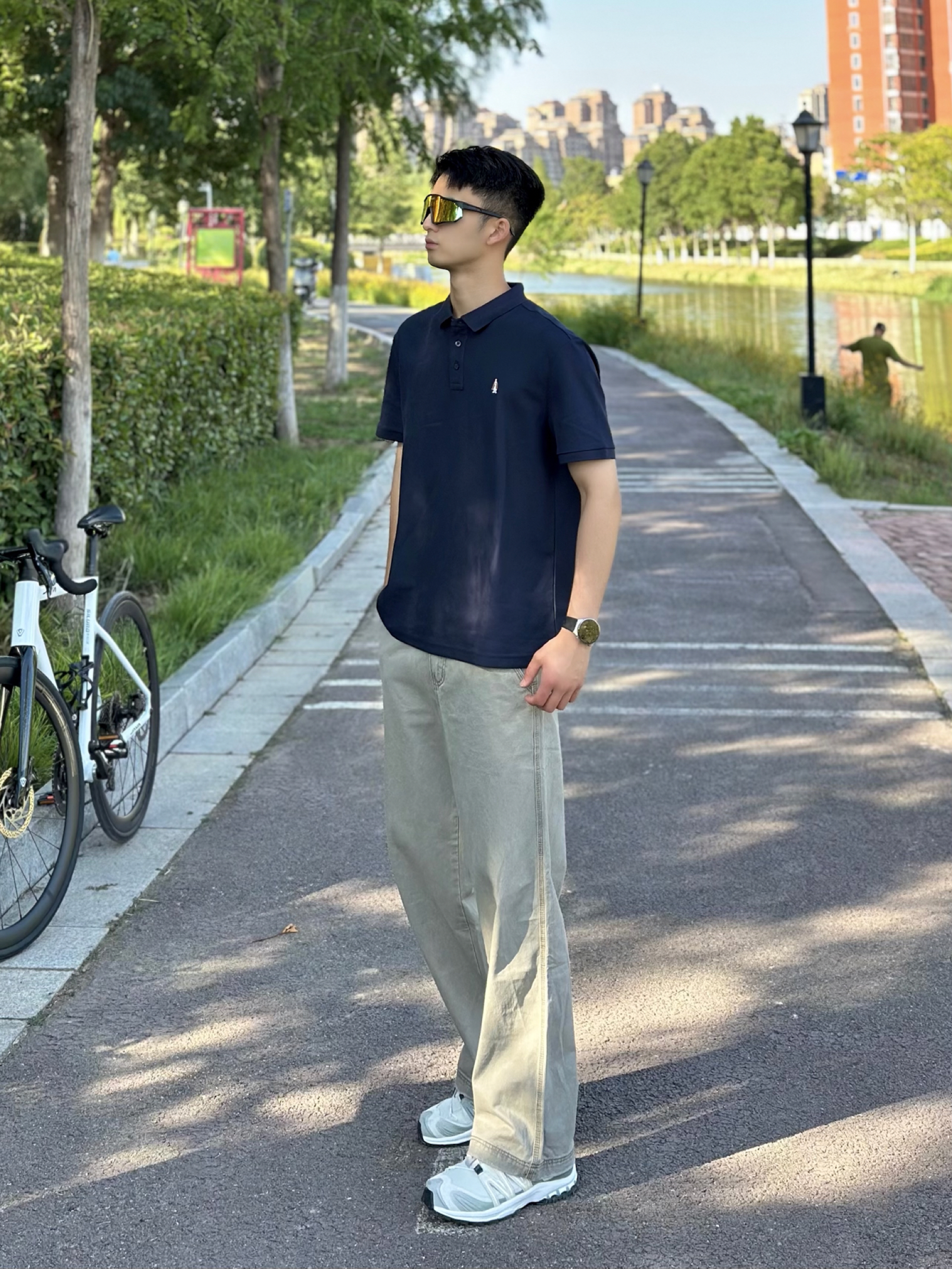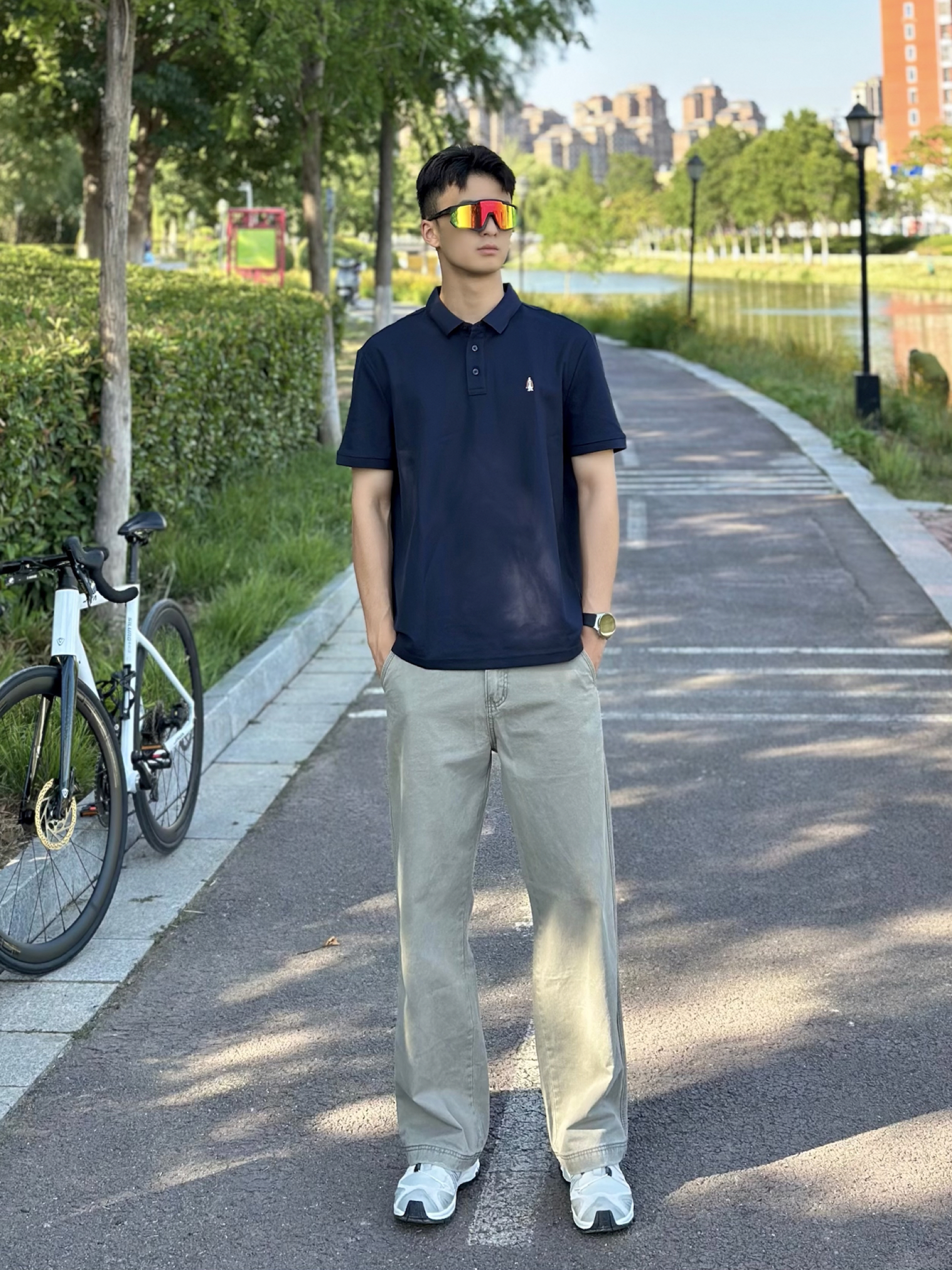 极简夏日穿搭分享 简约小狗刺绣很可爱 好有质感的一件T恤衫 面料舒服透气 上身冰冰凉凉 夏季运动穿出汗也不粘身 搭配上简约休闲裤 一整套下来阳光少年感没错了