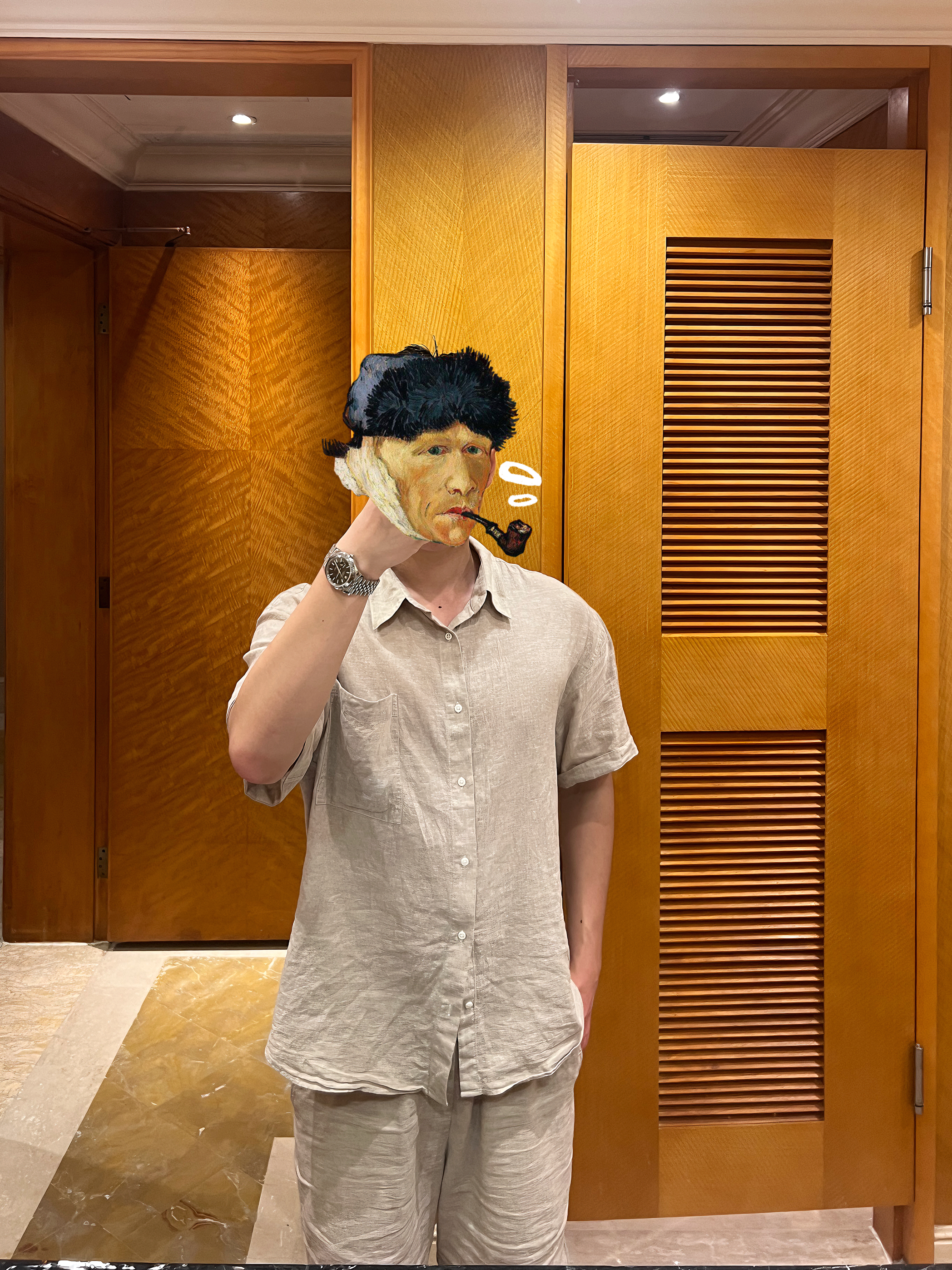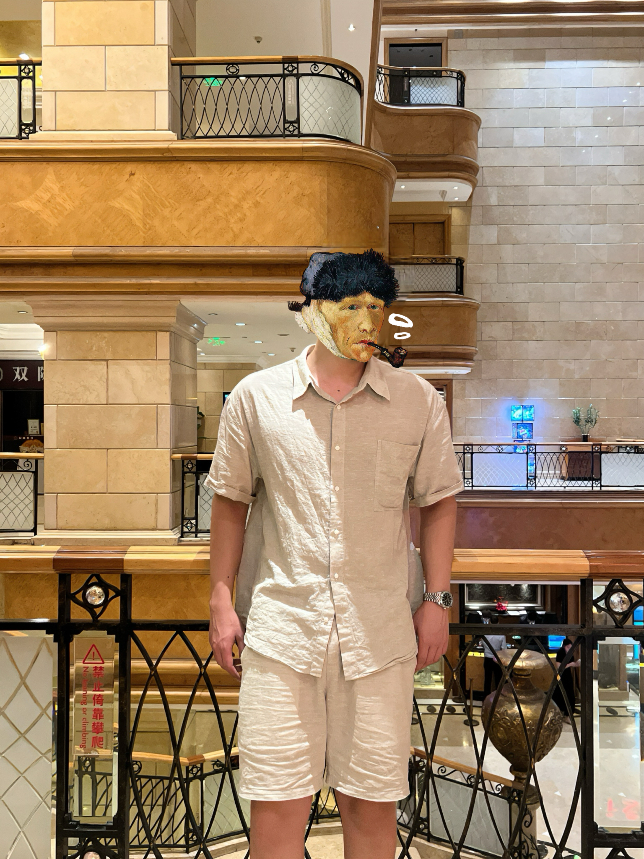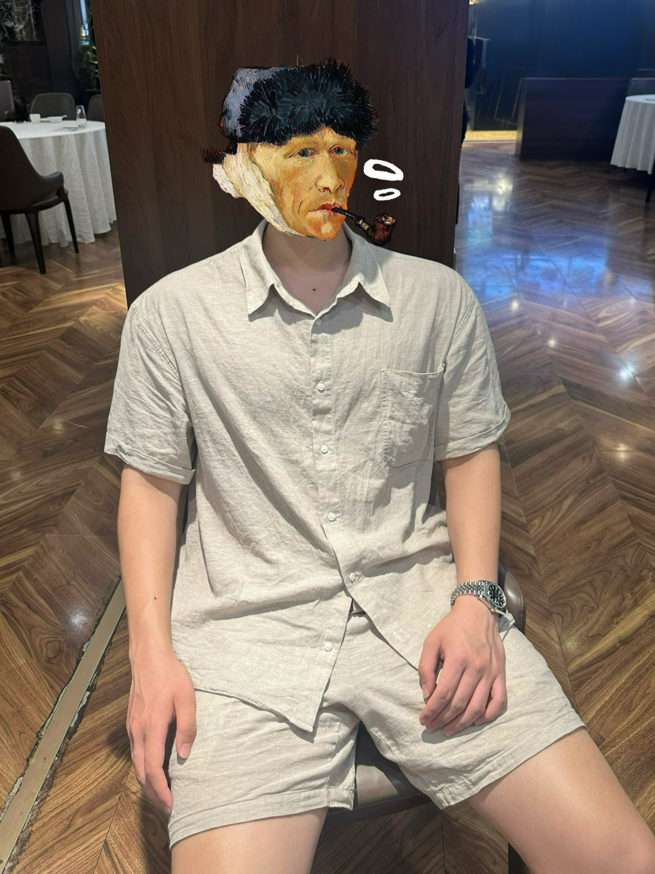身高|体重:183 160 🧍♂️ 穿搭风格:老钱风 👔 上衣:原麻色亚麻短袖 👖 下装:原麻色亚麻短裤 🎒配饰:香奈儿旅行包