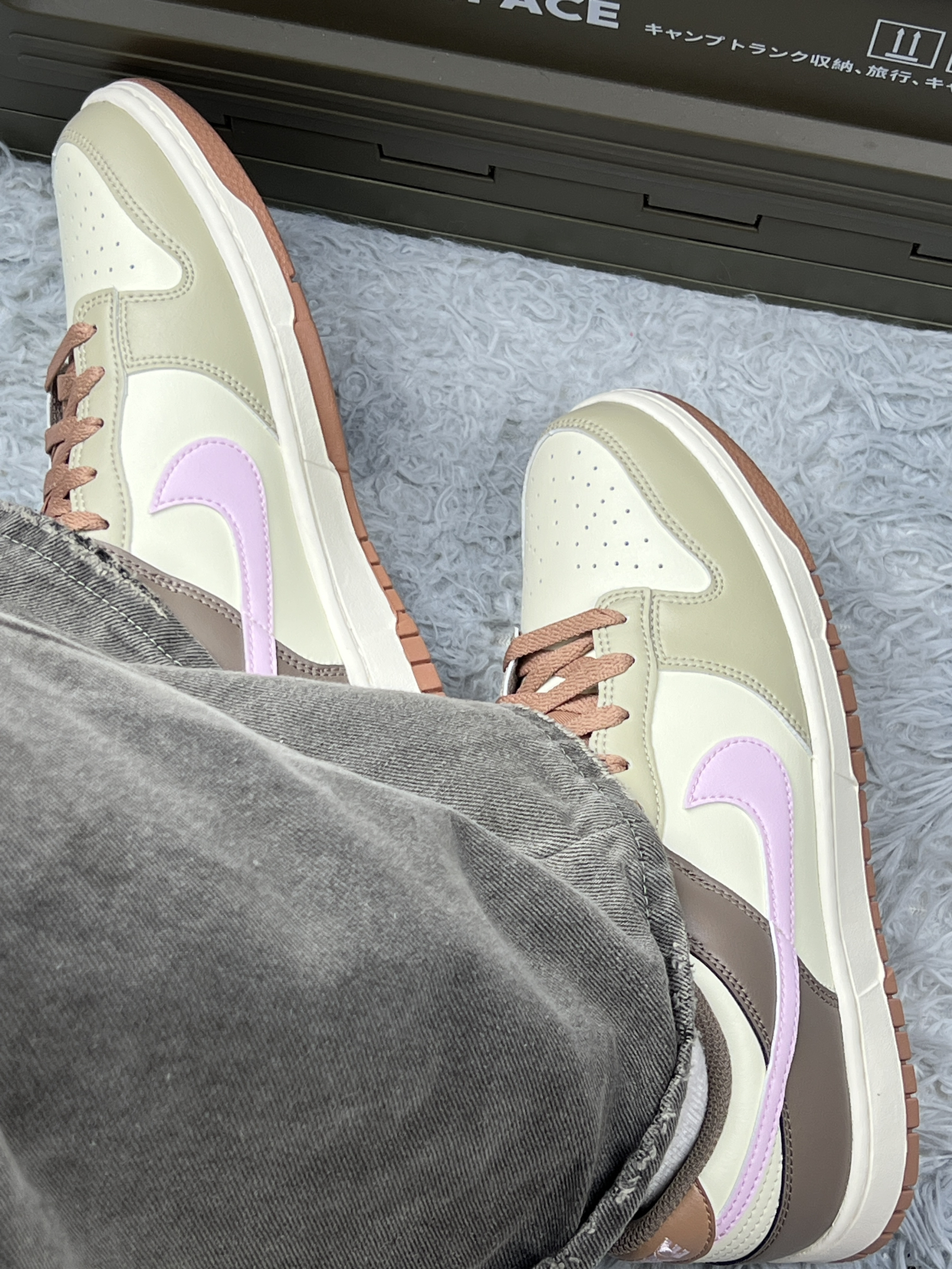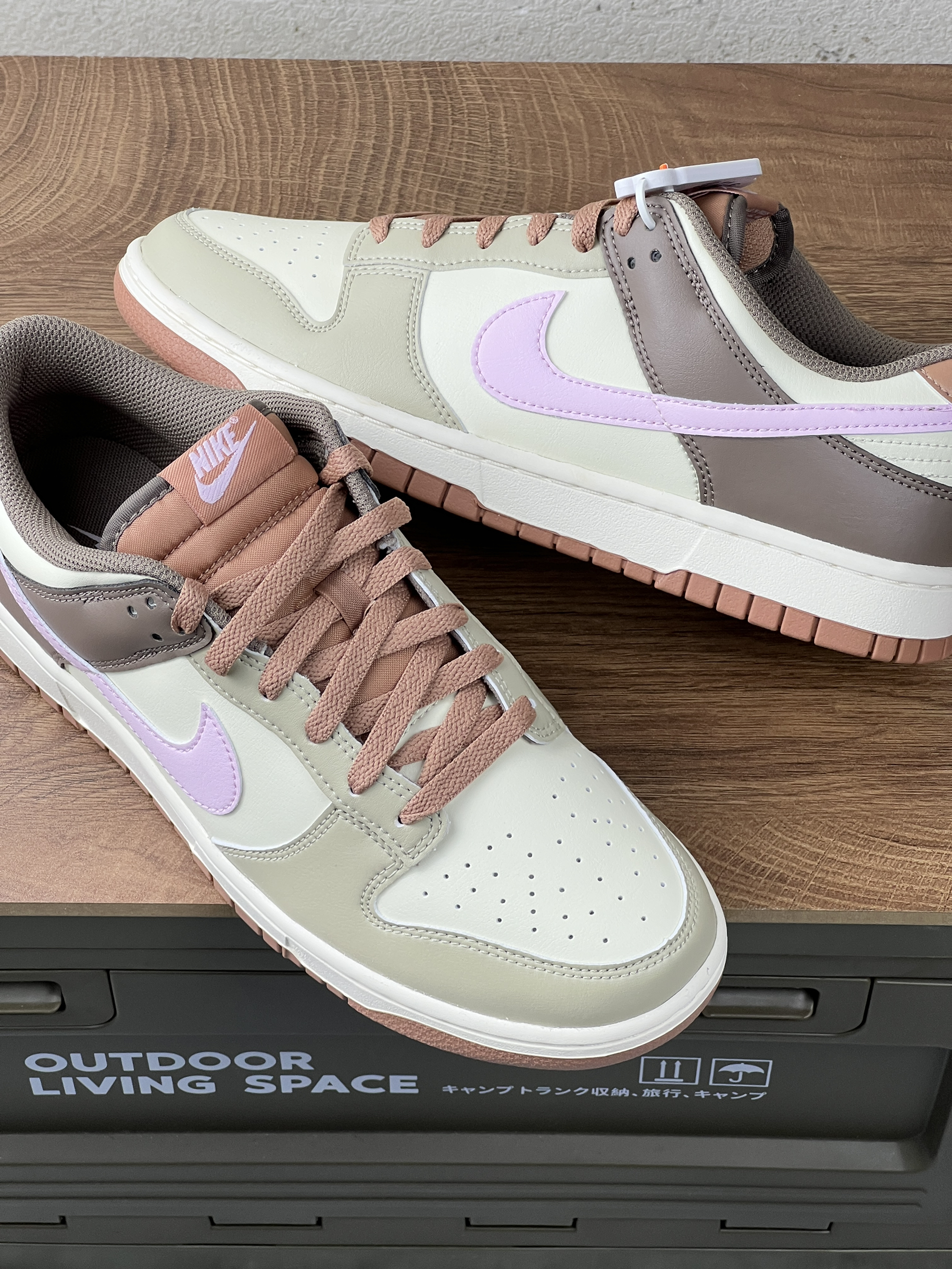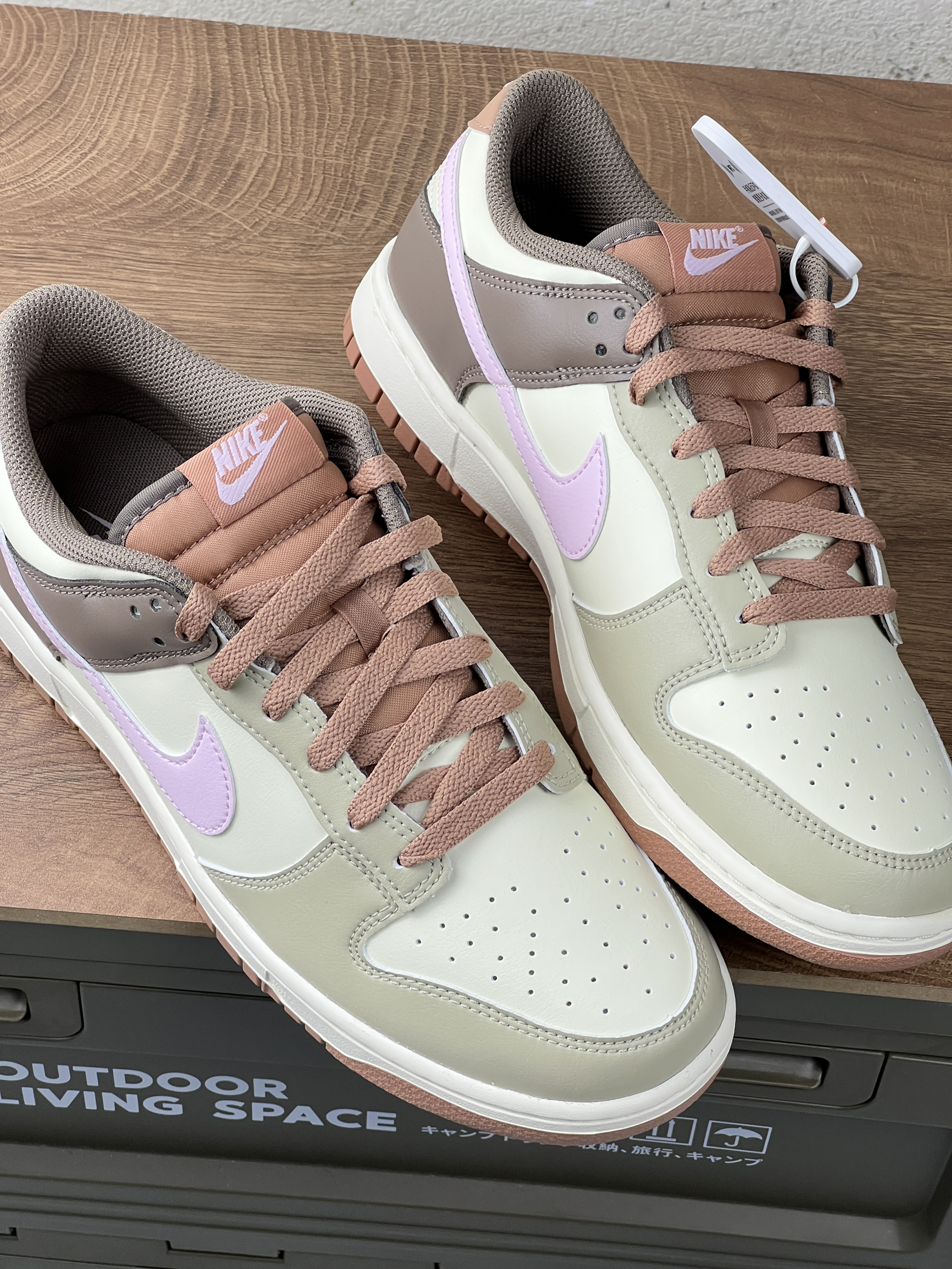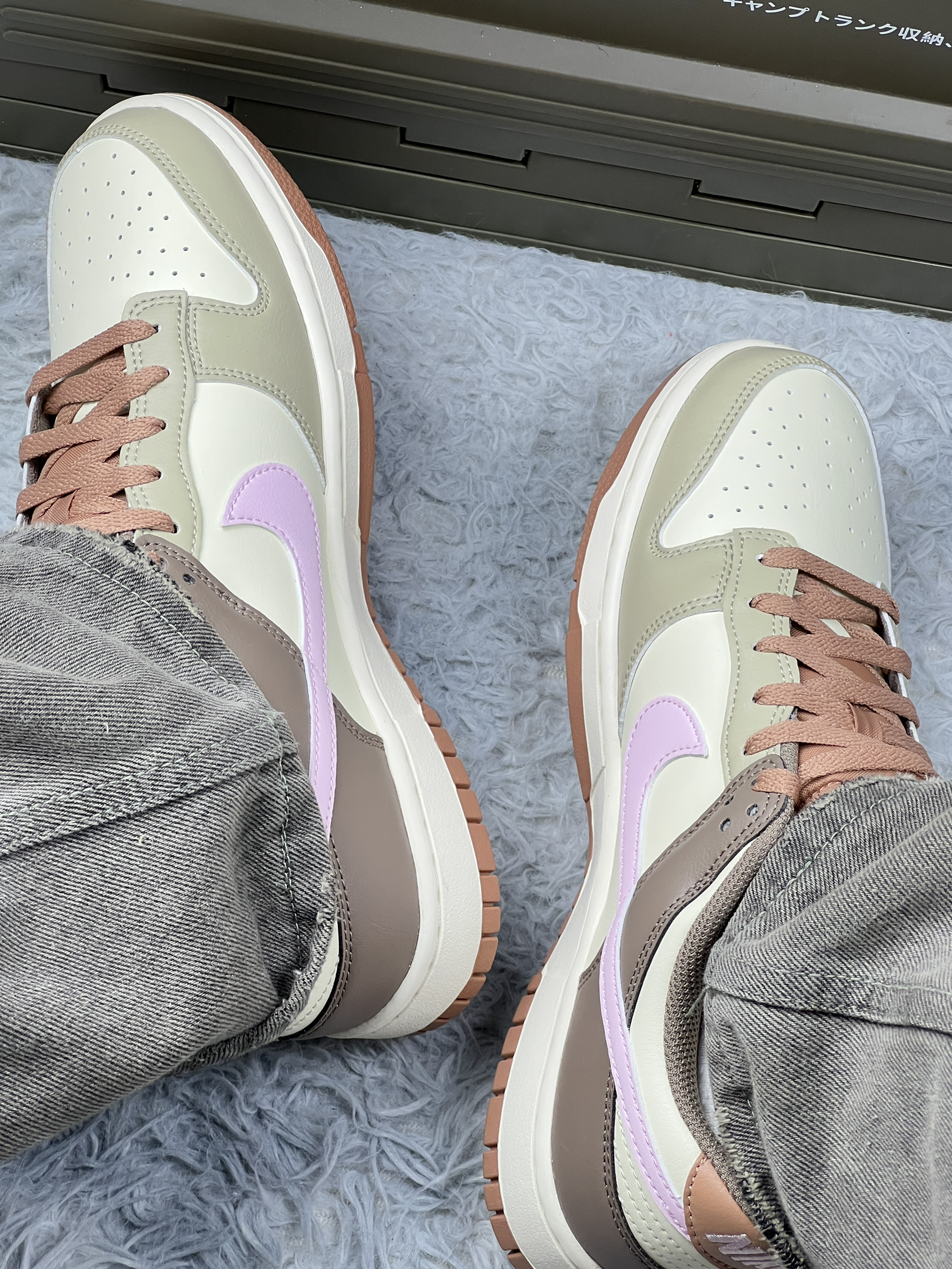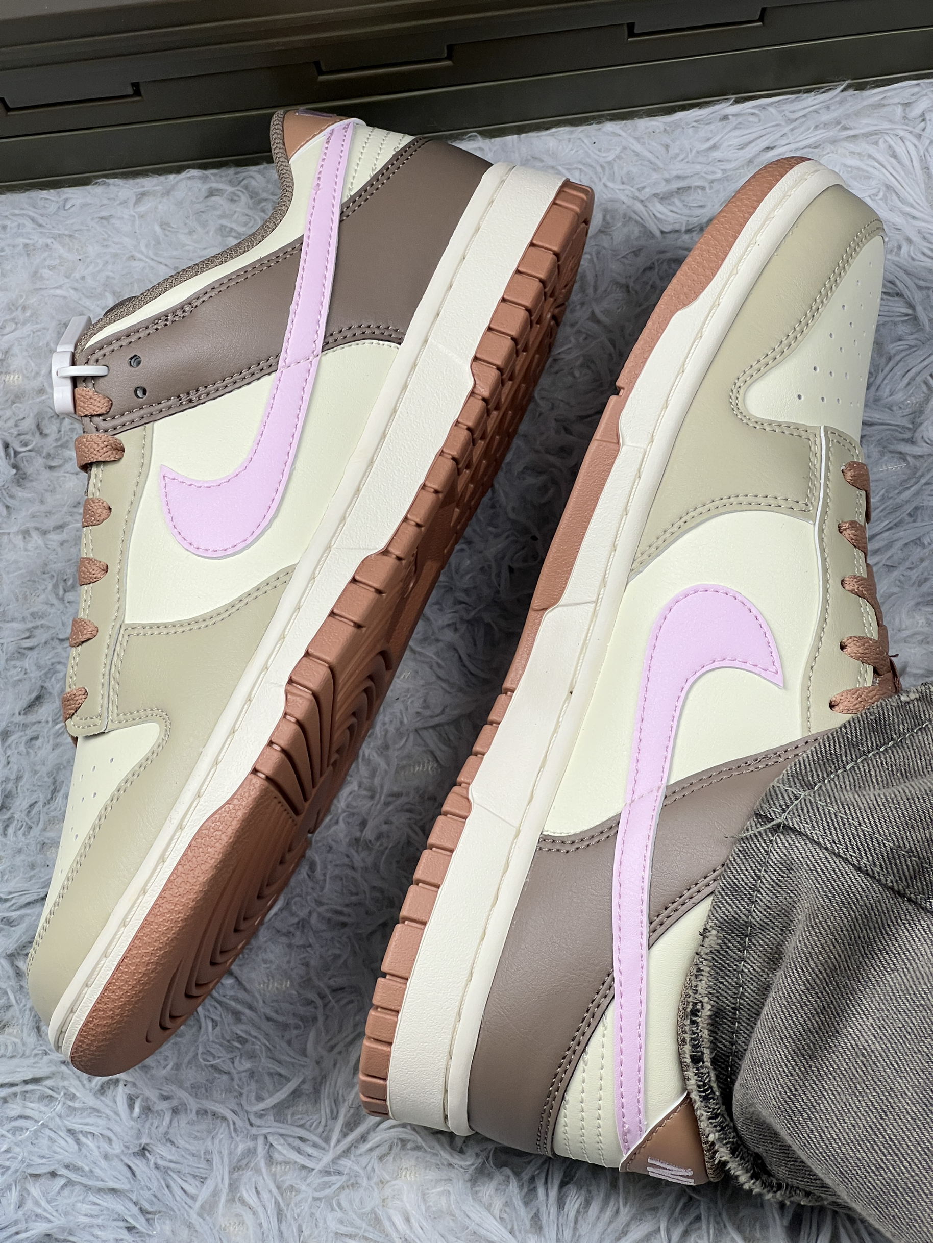 这双 Nike Dunk Low 上脚有阵子啦~浅棕、米白、淡紫配色组合,温柔又特别,低饱和色调搭裤子不挑风格,日常出街很省心。 不过也有糟心处,鞋型偏窄,我脚不算宽,长时间穿还是会有点挤;浅色系超难伺候,沾灰、下雨踩水后,污渍特明显,清洁得勤快点。鞋码也得注意,我按常码买,刚上脚前掌略紧,磨合几天才舒服些。 鞋头不是那种尖尖的,有点圆润,显得脚型不生硬。就是鞋边的缝线颜色和鞋身太接近了,不凑近看...