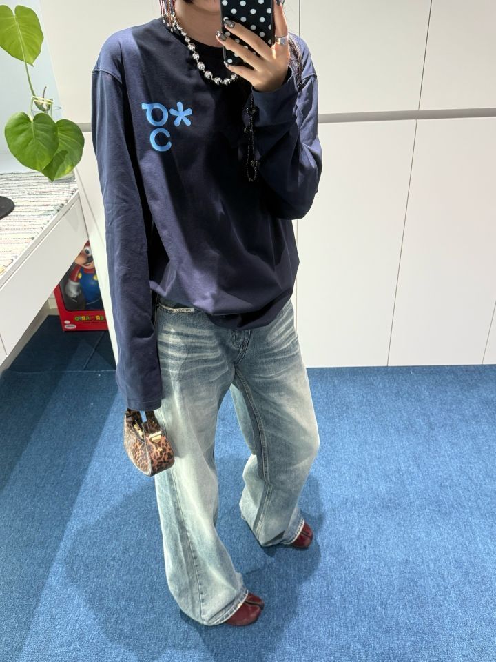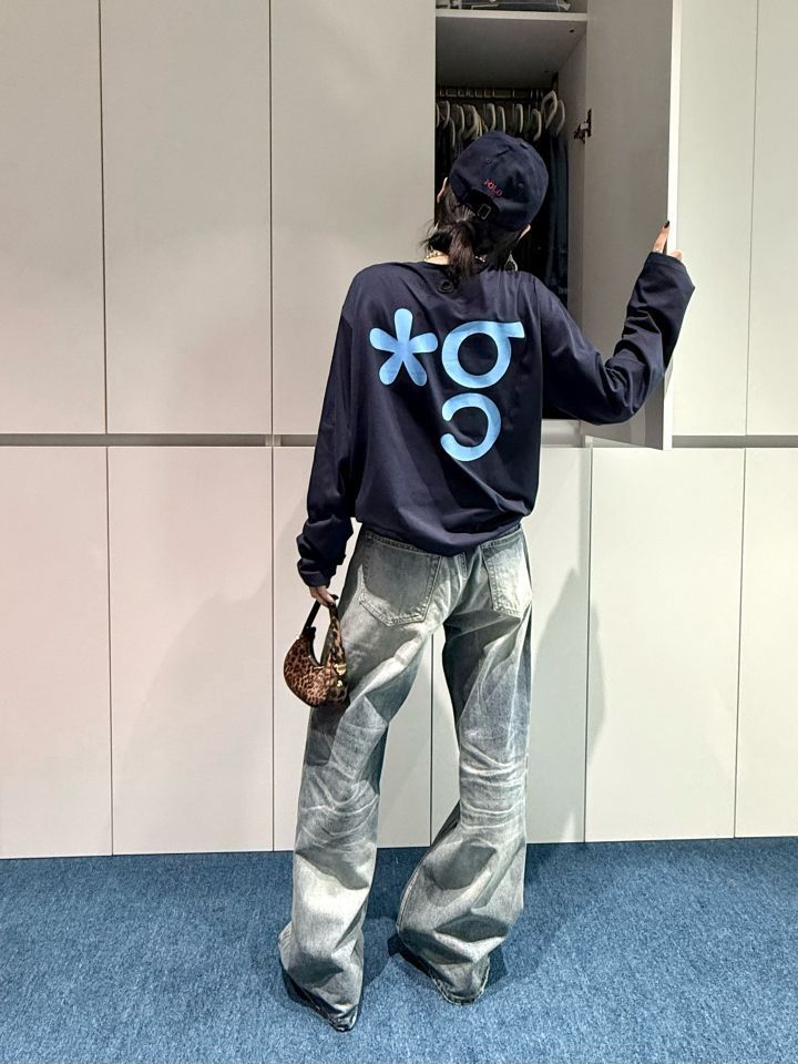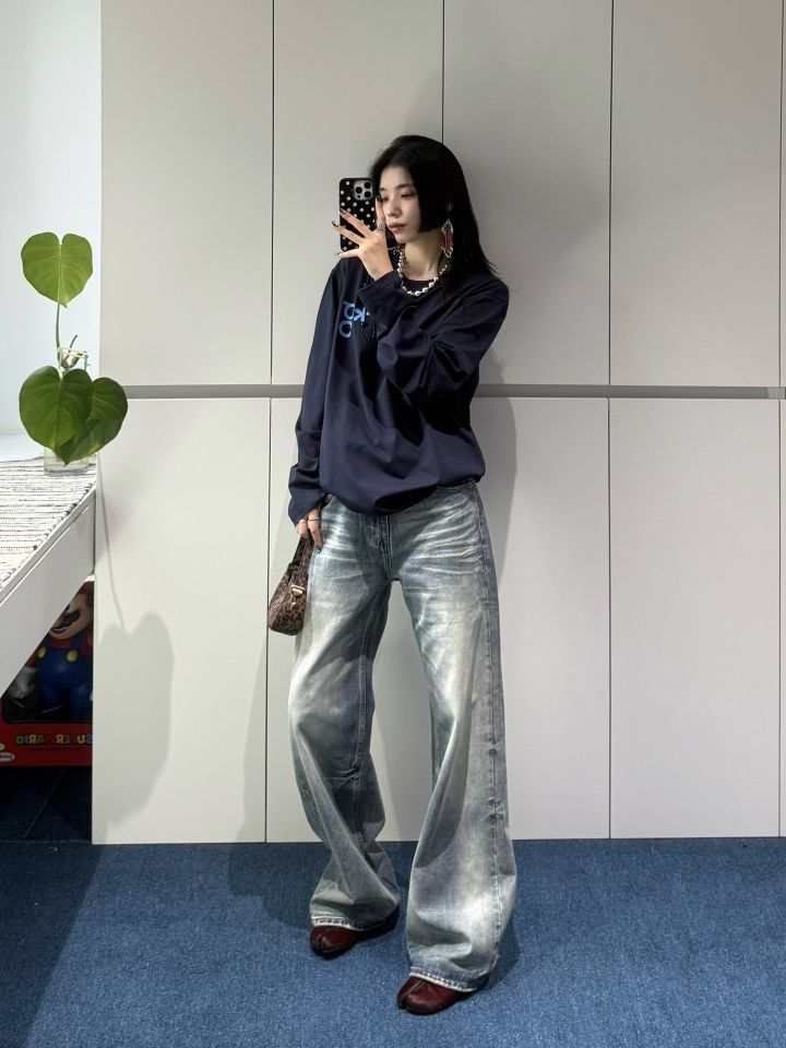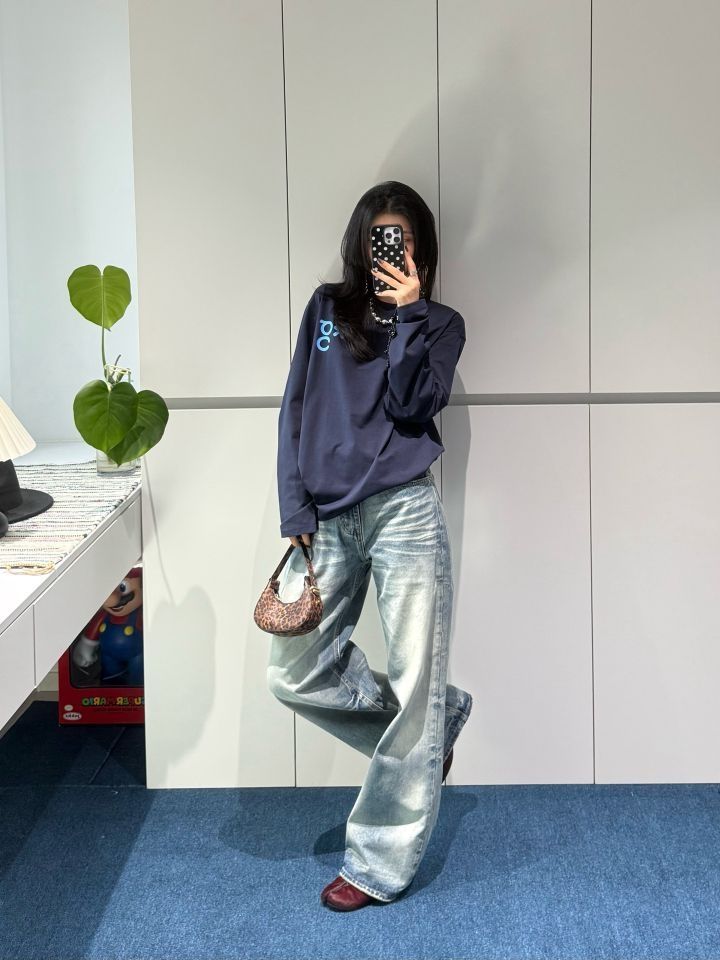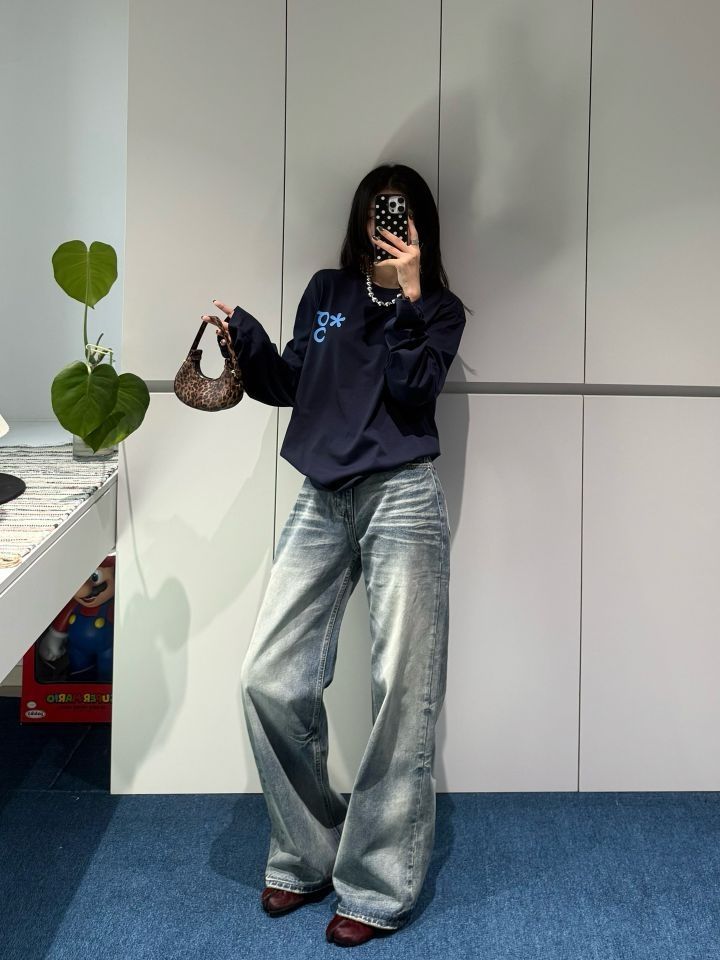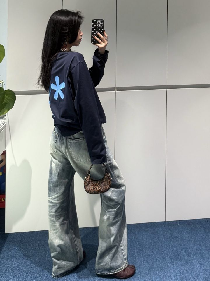 一件藏蓝长袖+阔腿牛仔,居然能穿出毫不费力的高级感🥹 藏蓝色长袖T恤自带低调质感,胸前小印花让基础款瞬间不无聊,软乎乎的面料贴身穿也巨舒服~ 重点夸这条做旧阔腿牛仔裤!裤型真的绝,宽松垂坠感拉满 拎个豹纹腋下包添点复古细节,再踩双酒红色鞋子和包包呼应