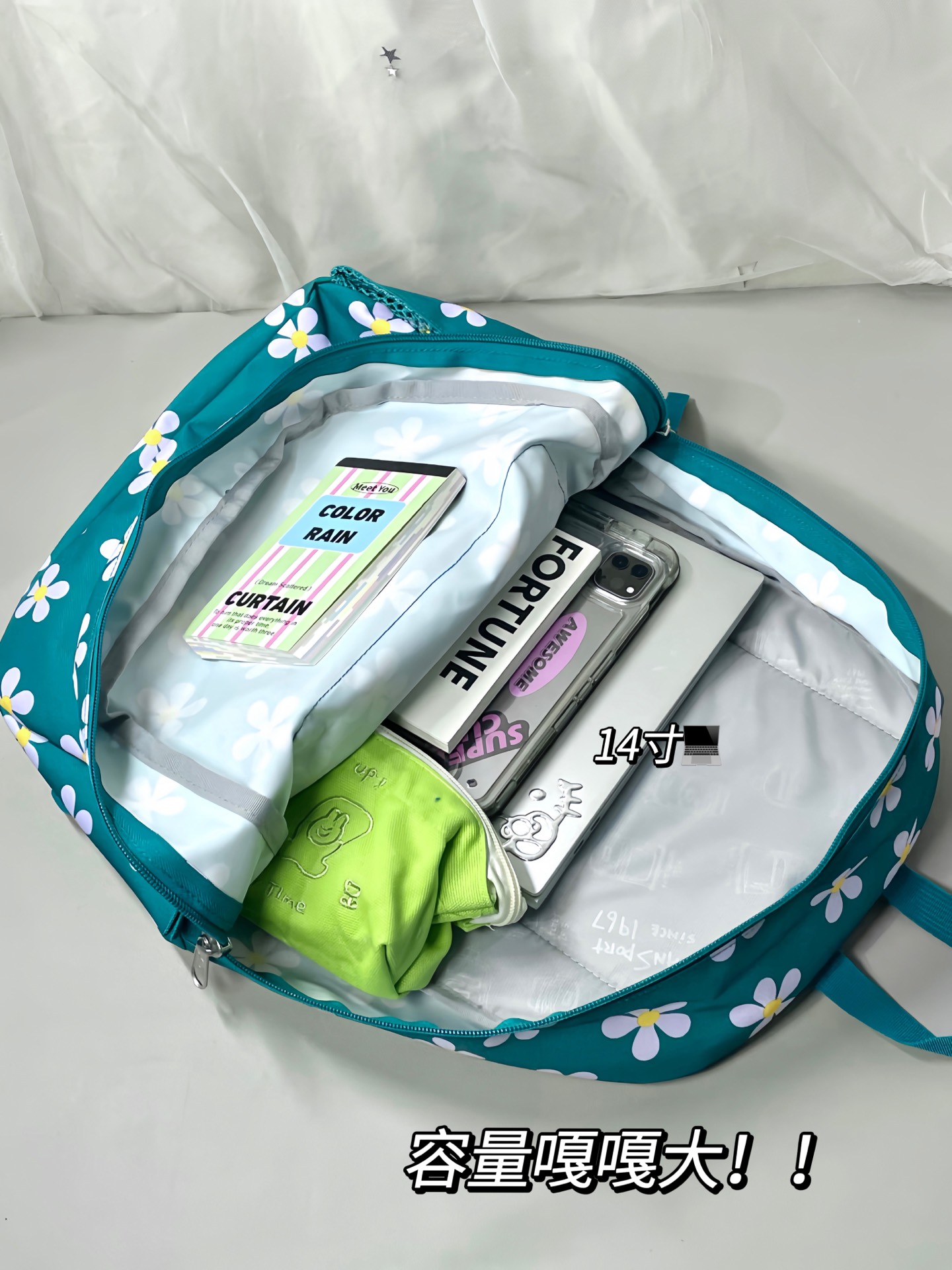 给大家分享我的夏日新宠双肩包✨ 小雏菊印花好小众清新~它面料防泼水✔ 容量大,能装下16寸电脑。就是夹层少了点,但日常上学、短途旅行背完全够!学生、上班族都适合!