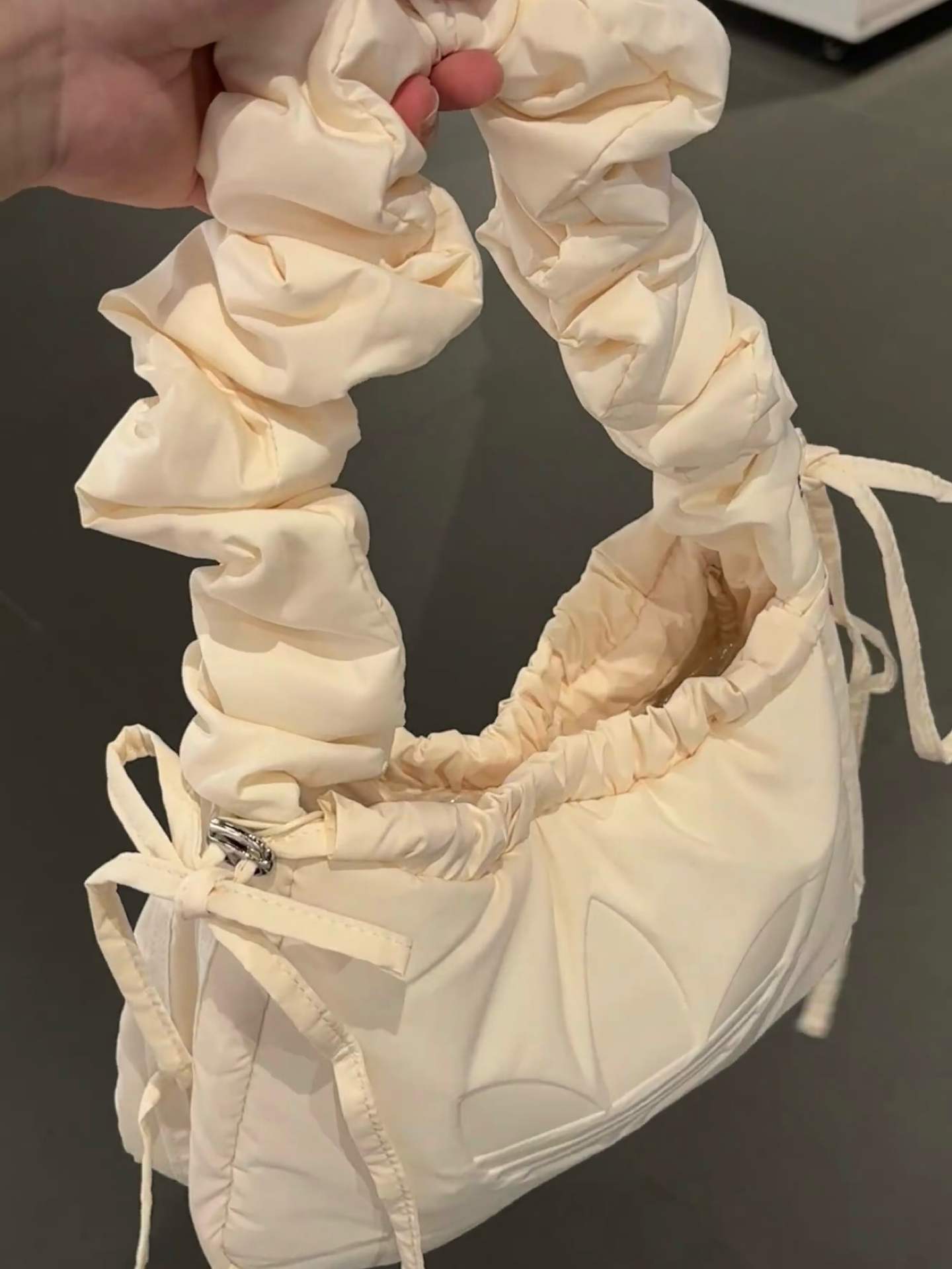 这个小方包,颜控很难不爱奶杏色超温柔,褶皱手柄软糯。 2.7升大容量实用,手提、腋下、斜挎背随意切换~就是浅色不太耐脏,但不妨碍我喜欢它