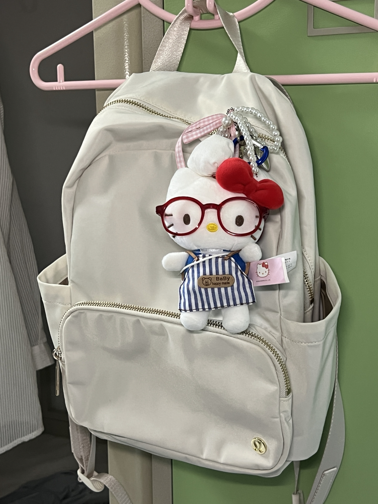 我最近挖到宝啦👀!这个双肩包日常通勤背超合适,拉链贼顺滑~米白色超百搭,搭小裙子或牛仔裤都好看😍。挂上可爱KT挂件直接美萌拉满~缺点是没有夹层,东西多了不好分类,不过颜值高就行啦😜。