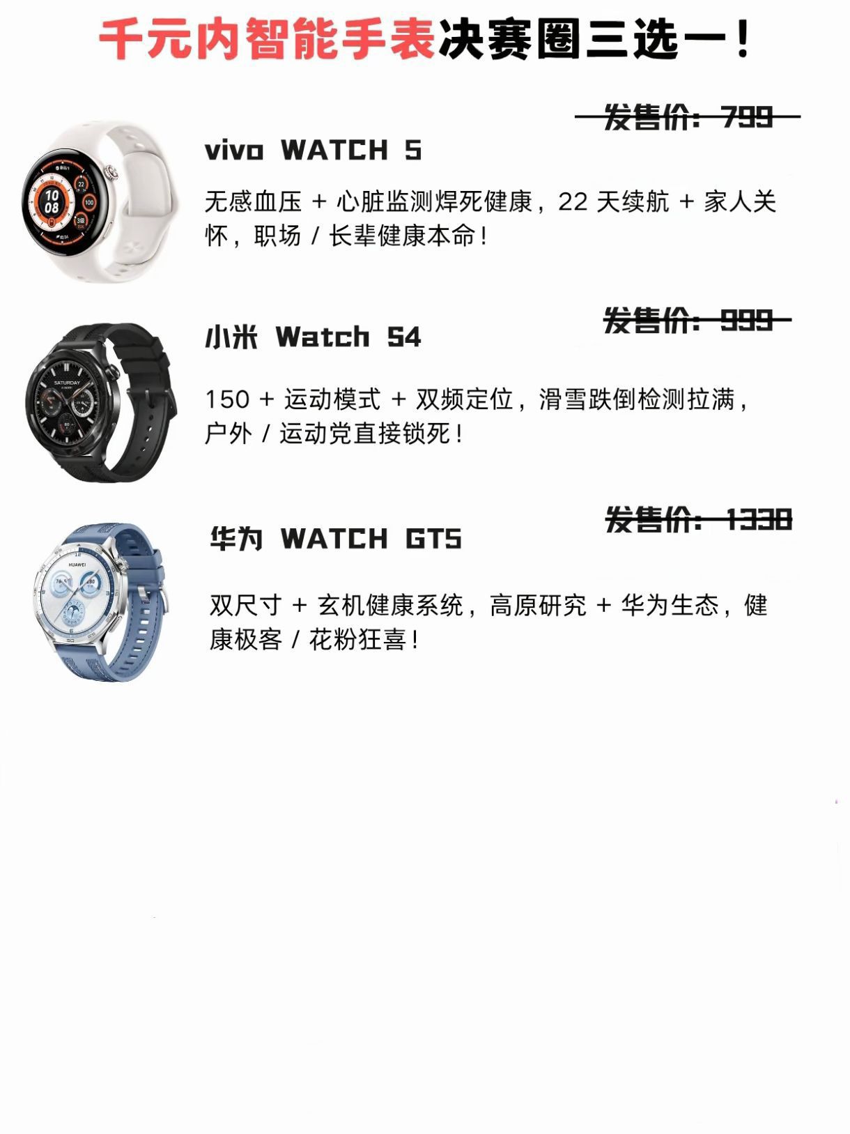 ◽️职场养生党锁死蓝厂小方表 ▶️799的价格天花板 ▶️30秒测血压心率比对象还贴心 ▶️三周充一次电⚡️开会忘充电也不社死 ▶️家人健康监控异地打工人狂喜 ◽️户外卷王无脑冲米系 ▶️双频五星定位+滑雪跌倒警报 ▶️150种运动模式进藏区都不虚 ◽️华为生态粉直接GT5焊手上 ▶️双尺寸表盘手腕粗细全拿下 ▶️高原血氧研究+活力三环buff ▶️地图导航彩屏户外党保命刚需