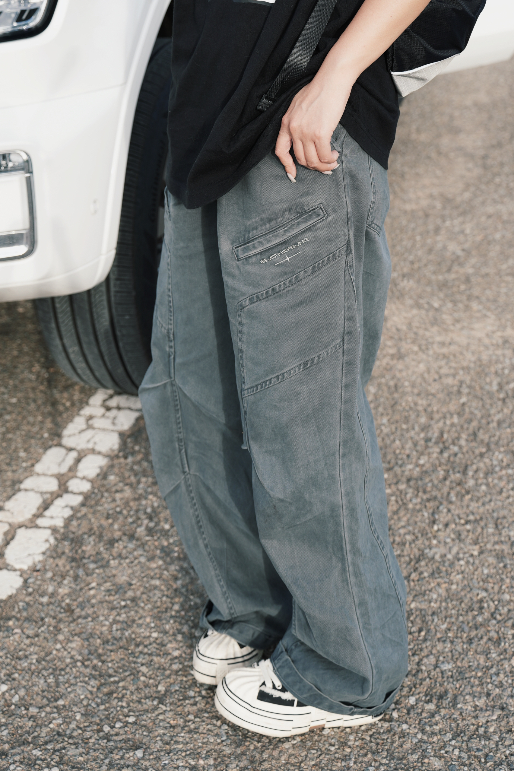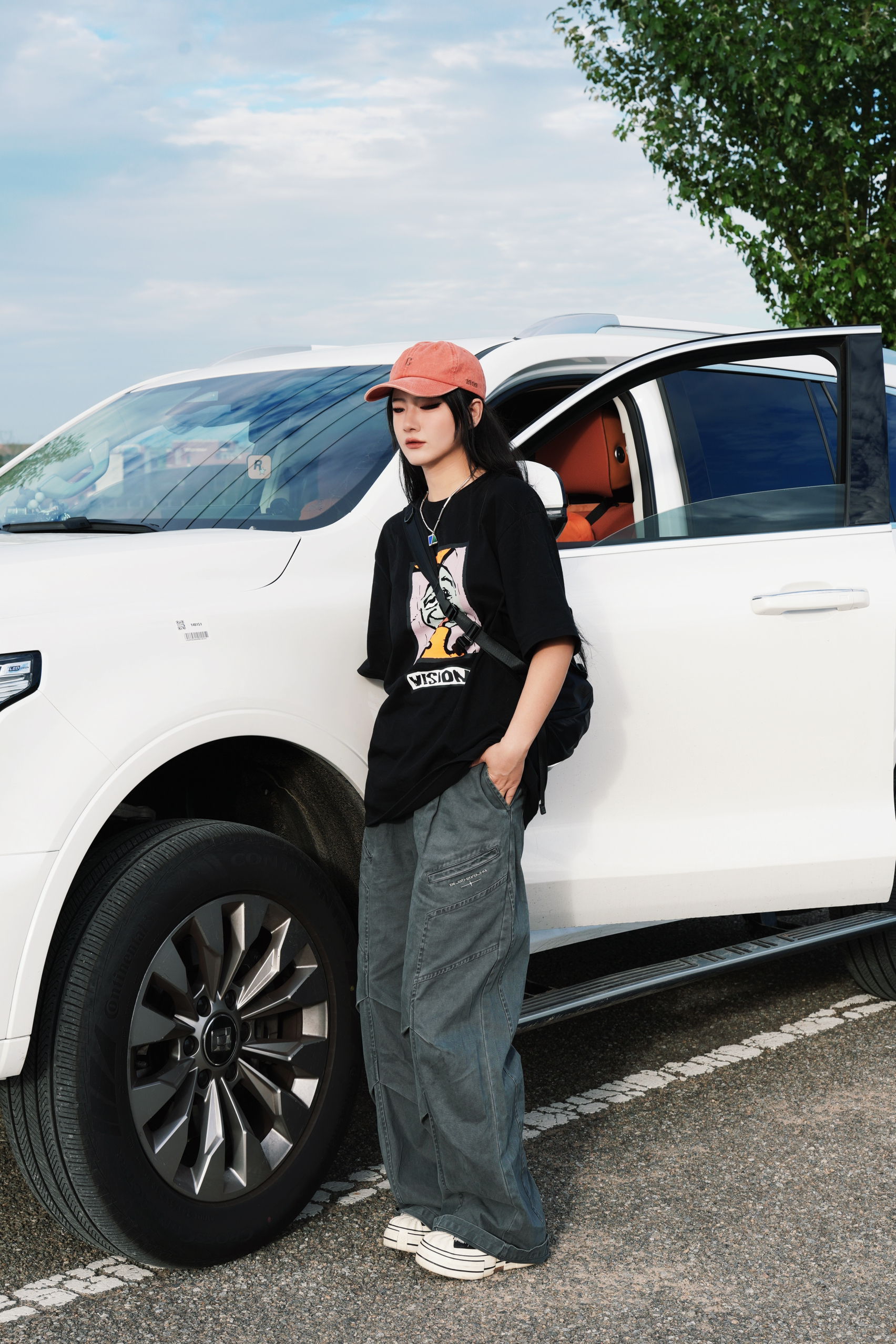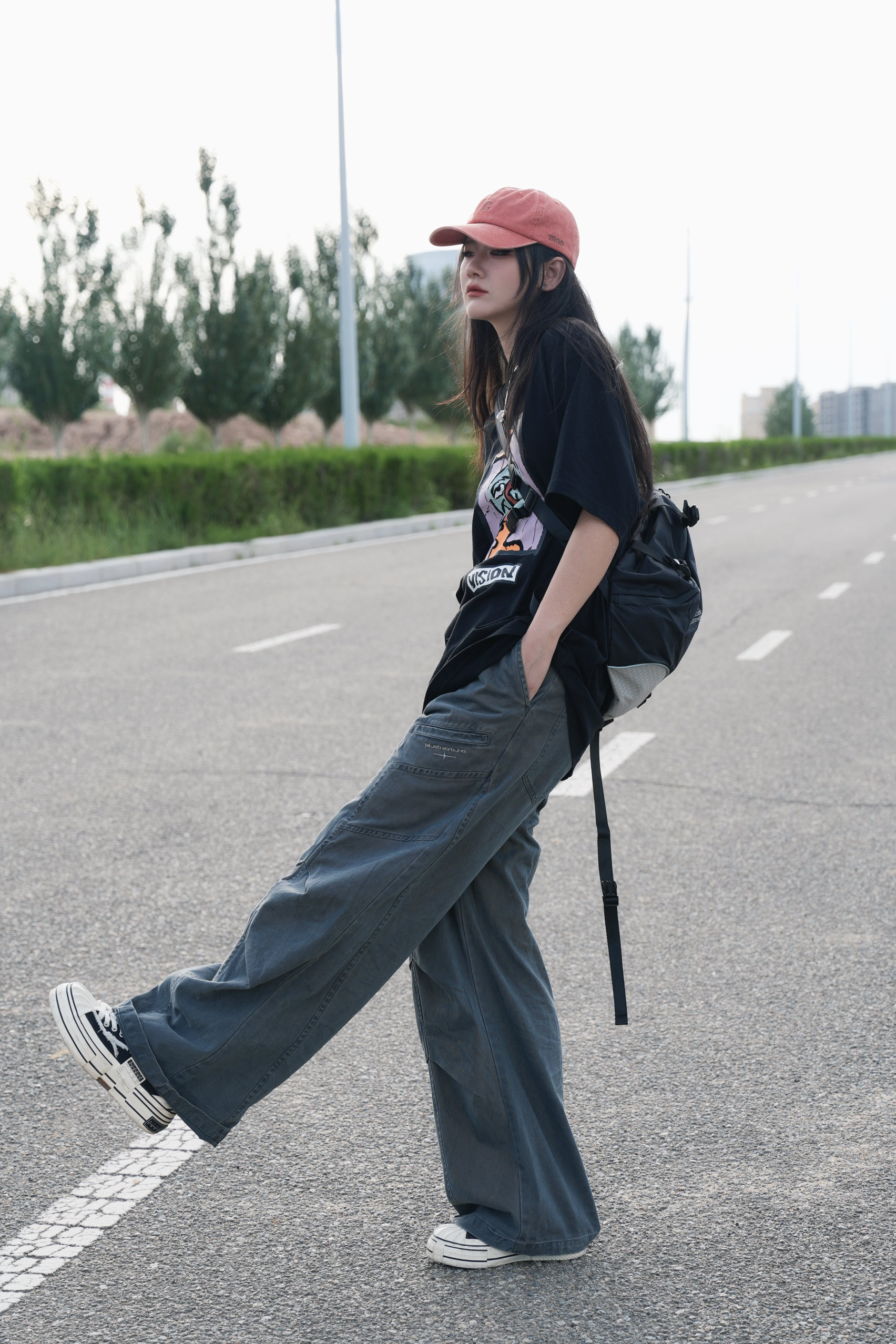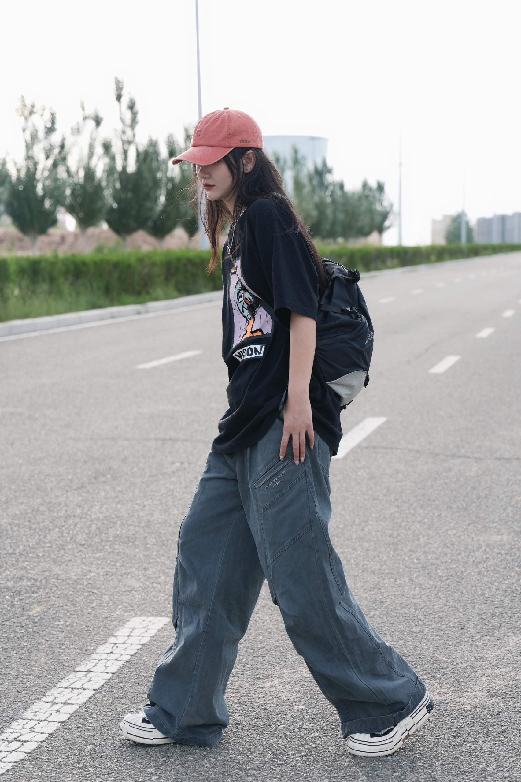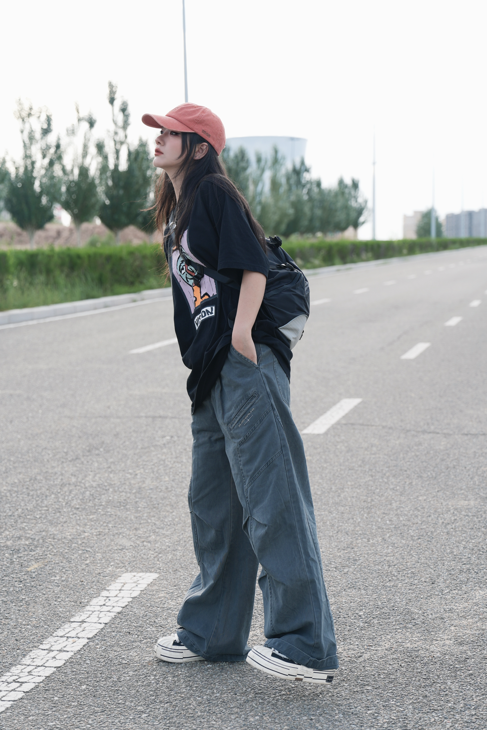 酷酷的才觉得很安心 今日份日系look来也 很喜欢宽松的工装裤 上身很自由也很🆒 灰色系搭配黑色大T 浓浓的日系氛围感就来咯 一顶亮色的鸭舌帽🧢增加一些时髦度 一个斜挎小包点亮look✌️