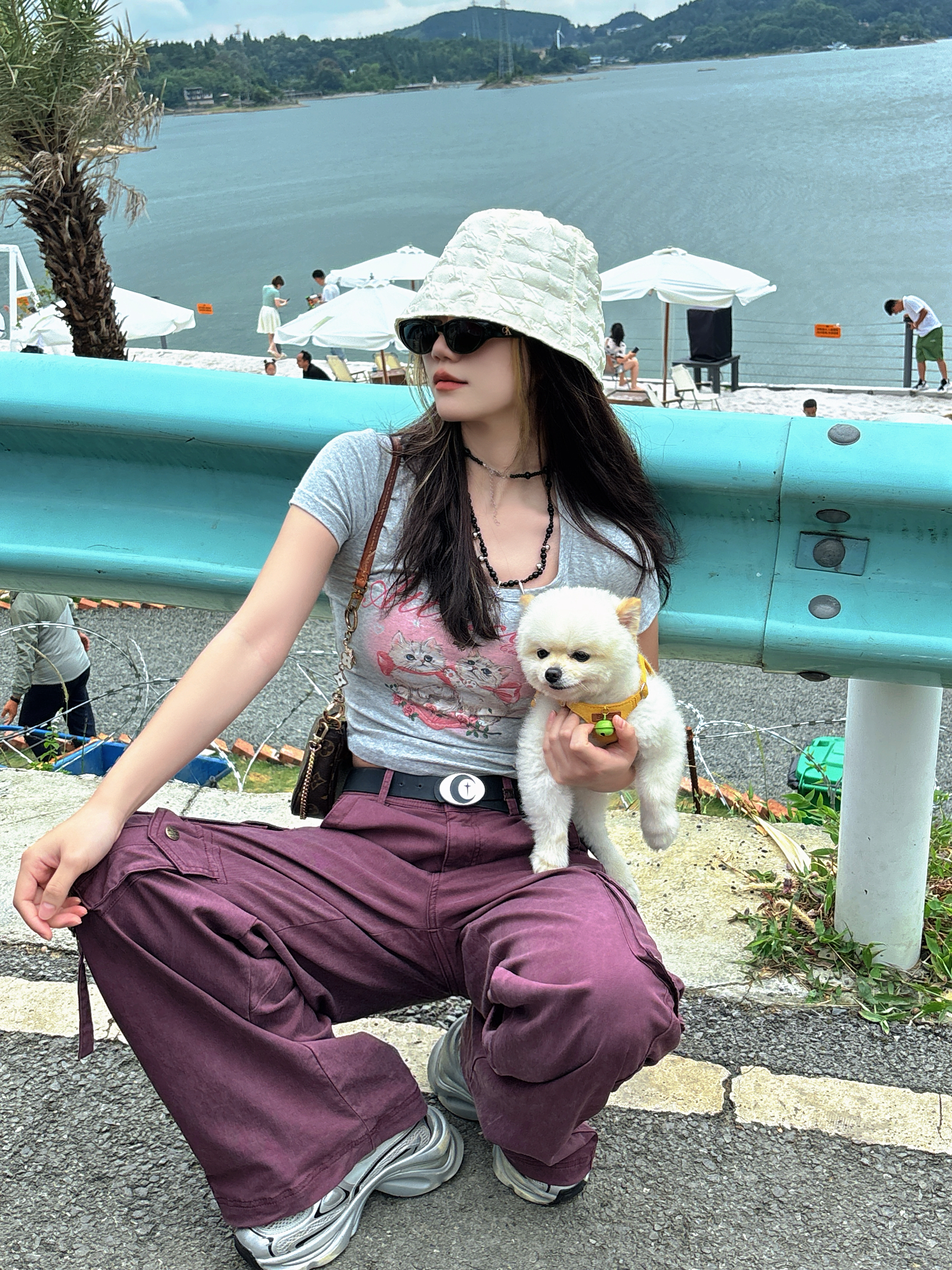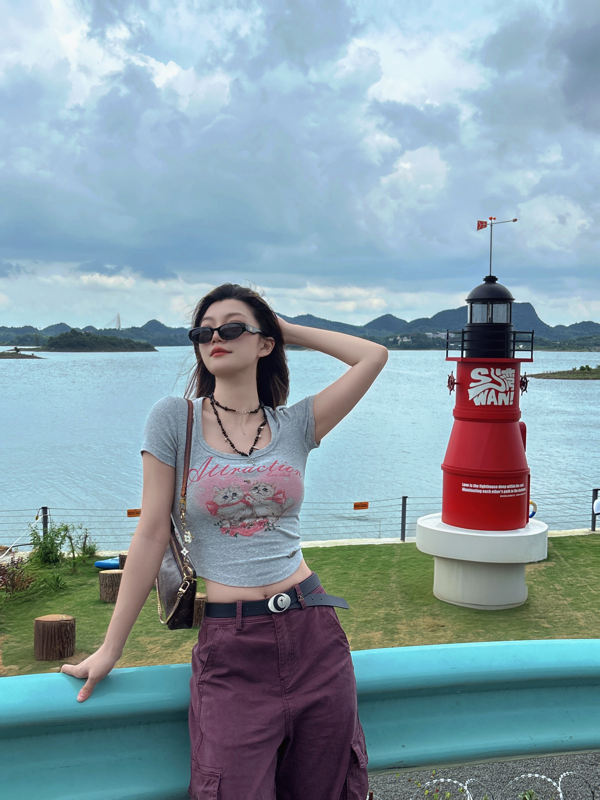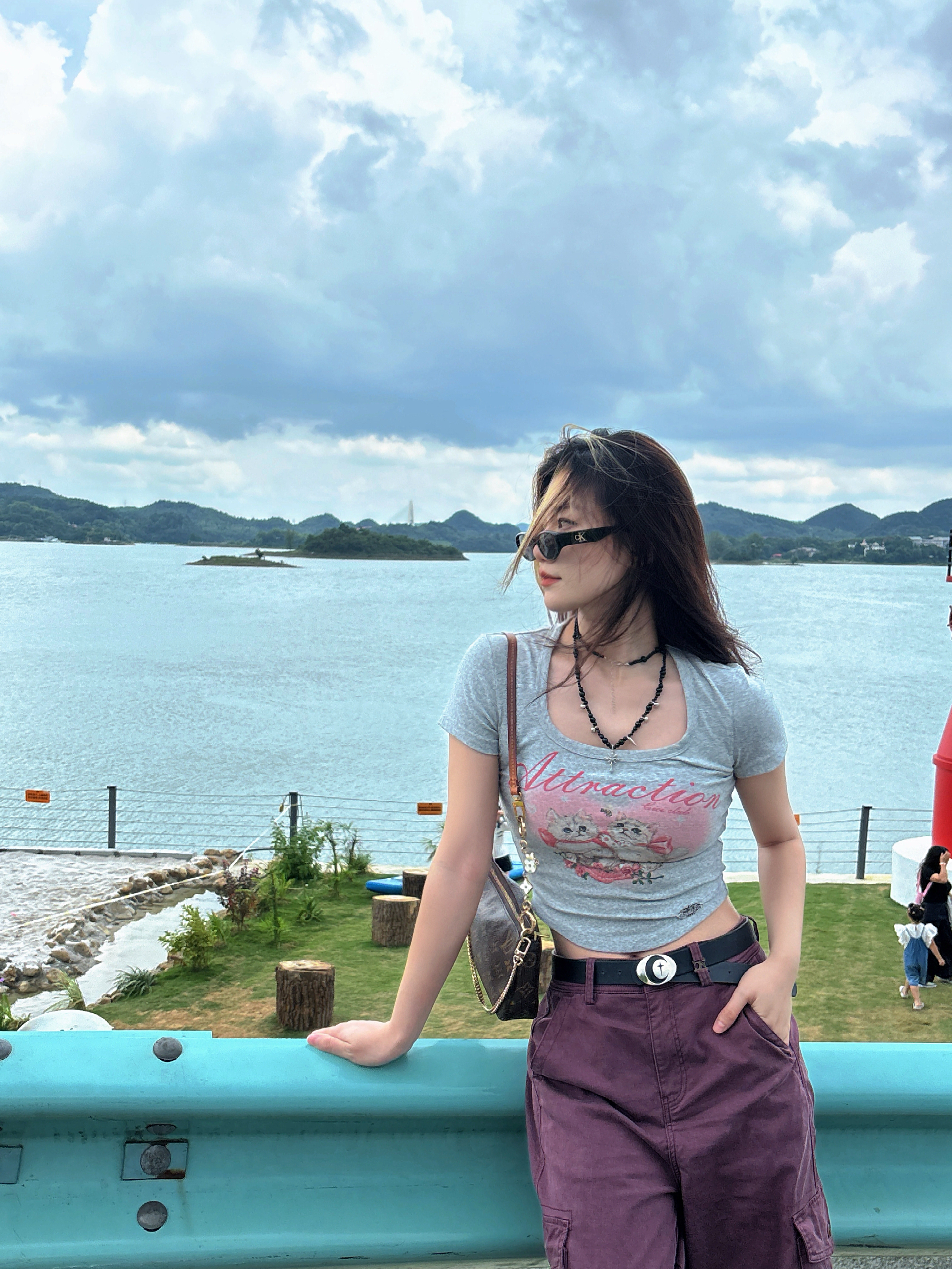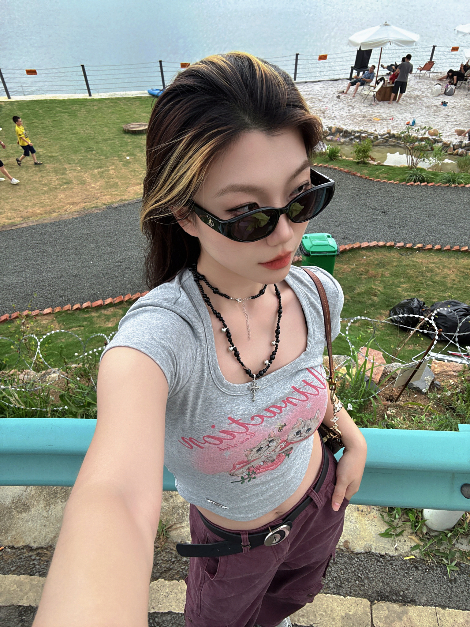 今日环湖公路小游⛵️ ☀️依旧火辣辣的 但妨碍不了我美美出片~📷 👕花灰色小猫短袖,方领很适合方圆脸,能露出修长肩颈线~ 👖ONLY多巴胺紫色长裤,直筒版型很修饰身型,显腿长信手拈来! 🕶️ Calvin Klein 猫眼框墨镜,遮挡阳光又看得清晰,重要的是遮住了高颧骨显脸小!戴上自信摆拍,有时候就需要一点不顾别人眼光的时刻🕶️