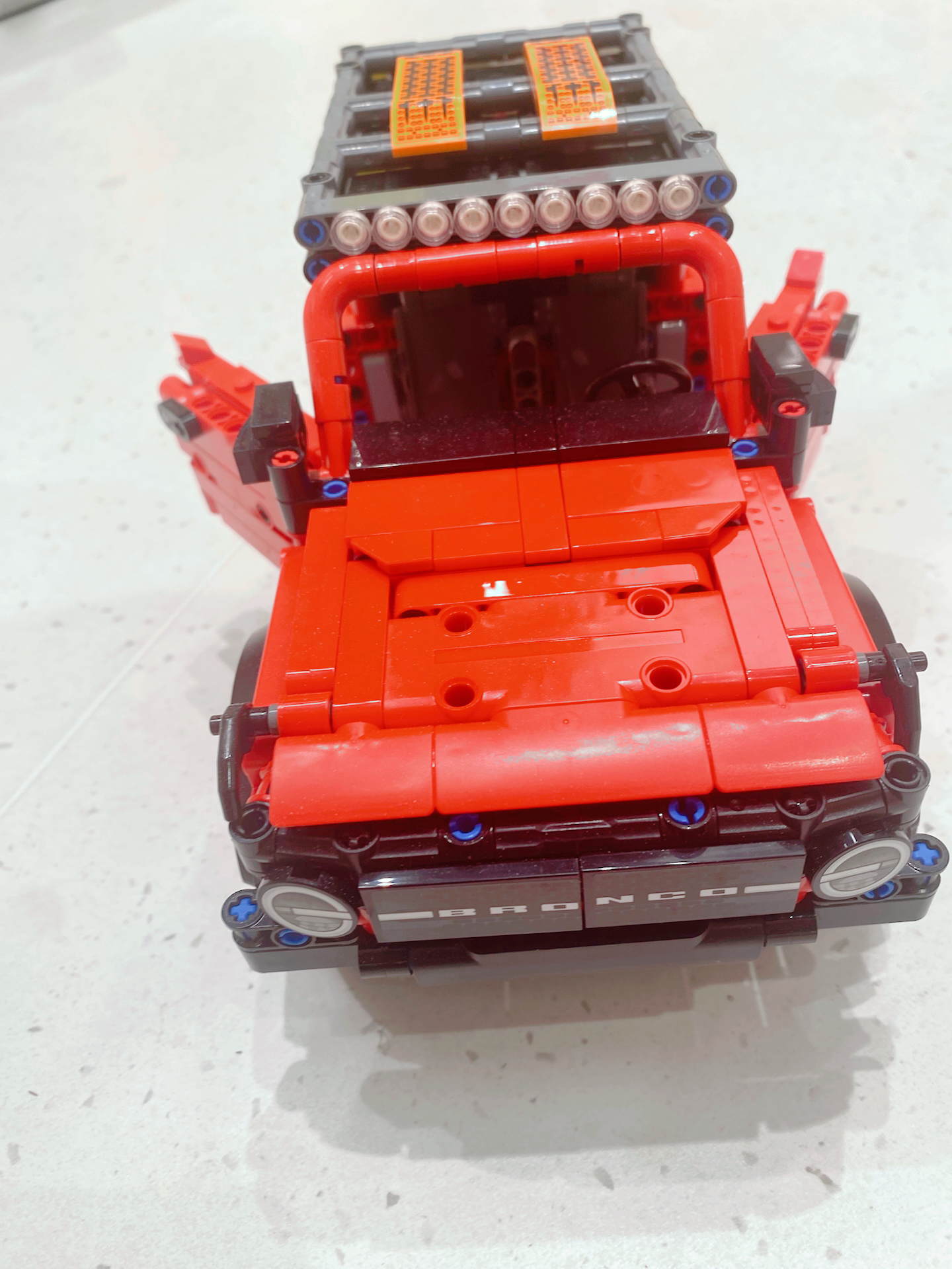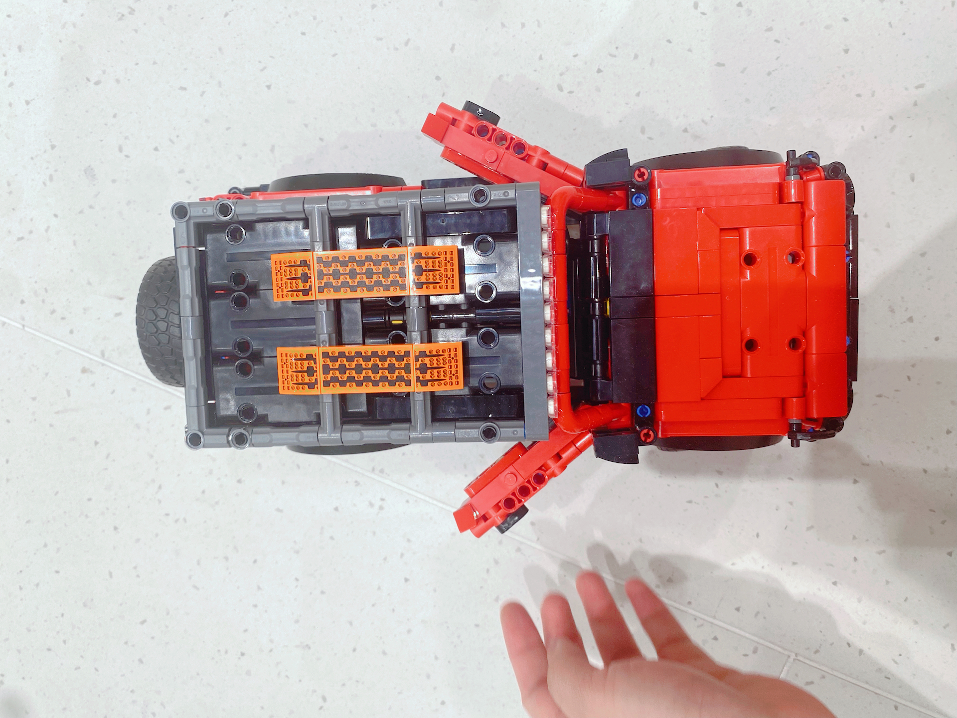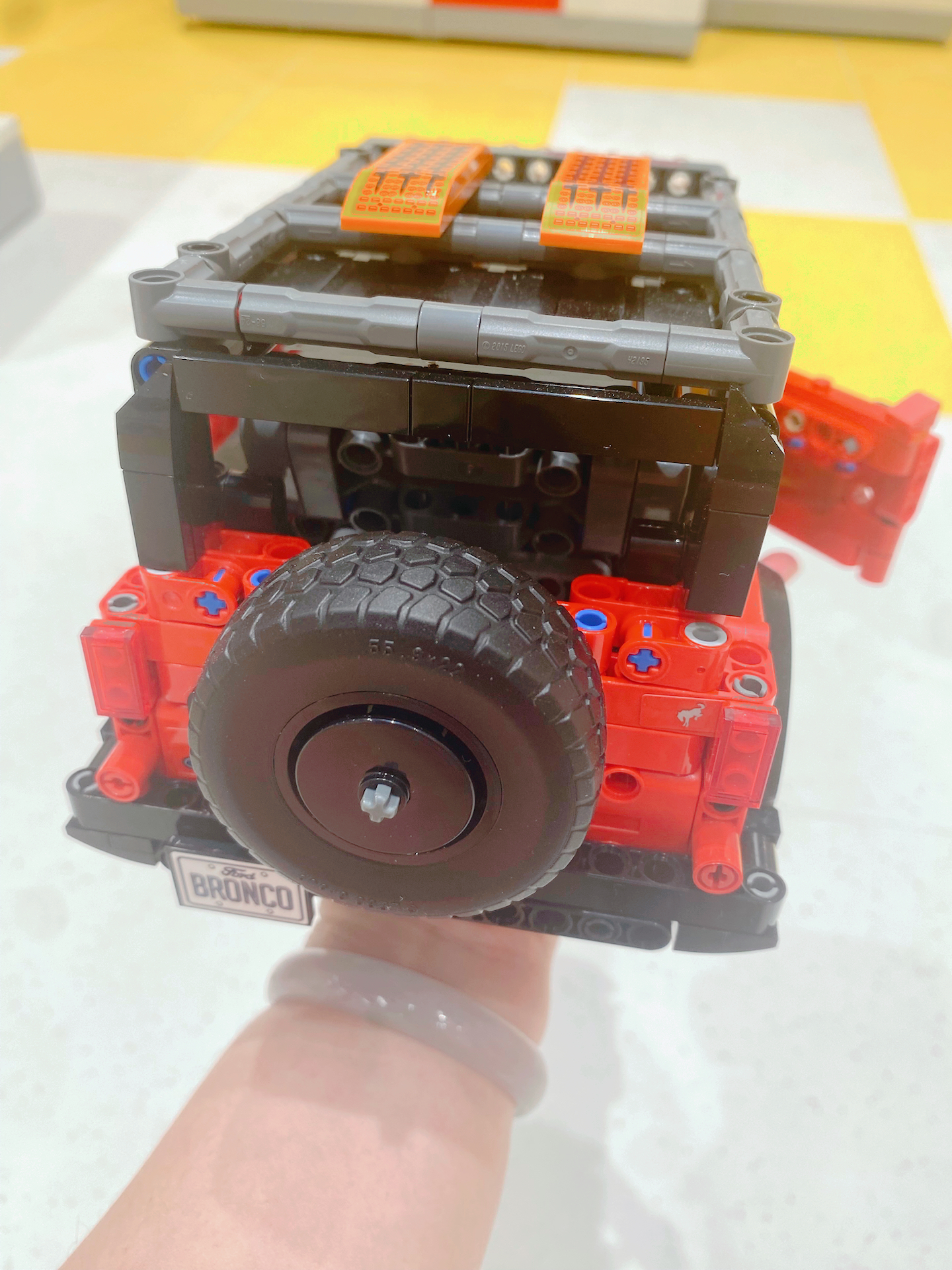这款在今年8月1日新出的迷你版的福特烈马SUV套装真的超级好看, 一共943个零件,拼搭需要4个小时,拼搭完后成品大概28厘米长。 当时看到的时候就很喜欢,红黑色的配色,整体造型也比较还原,后面还有备用轮胎,细节性也太强了吧,而且备用轮胎还可以作为转向系统。 成品用来拍氛围图真的超级好看。 我觉得这款还是非常具有收藏价值,我们买了一套,还收藏了一套