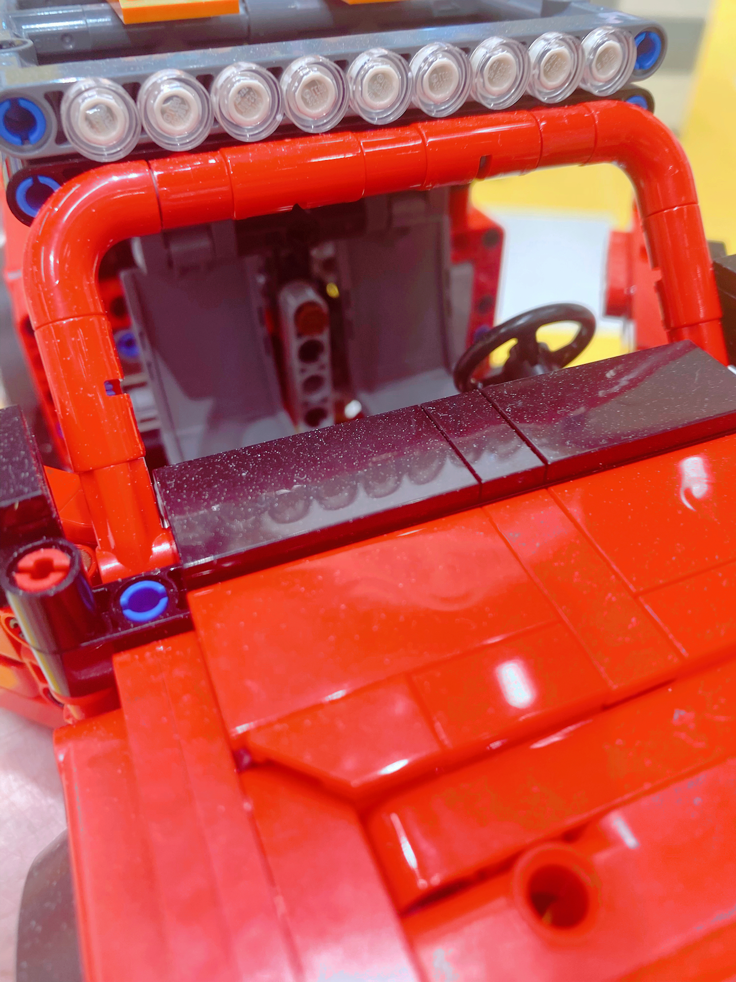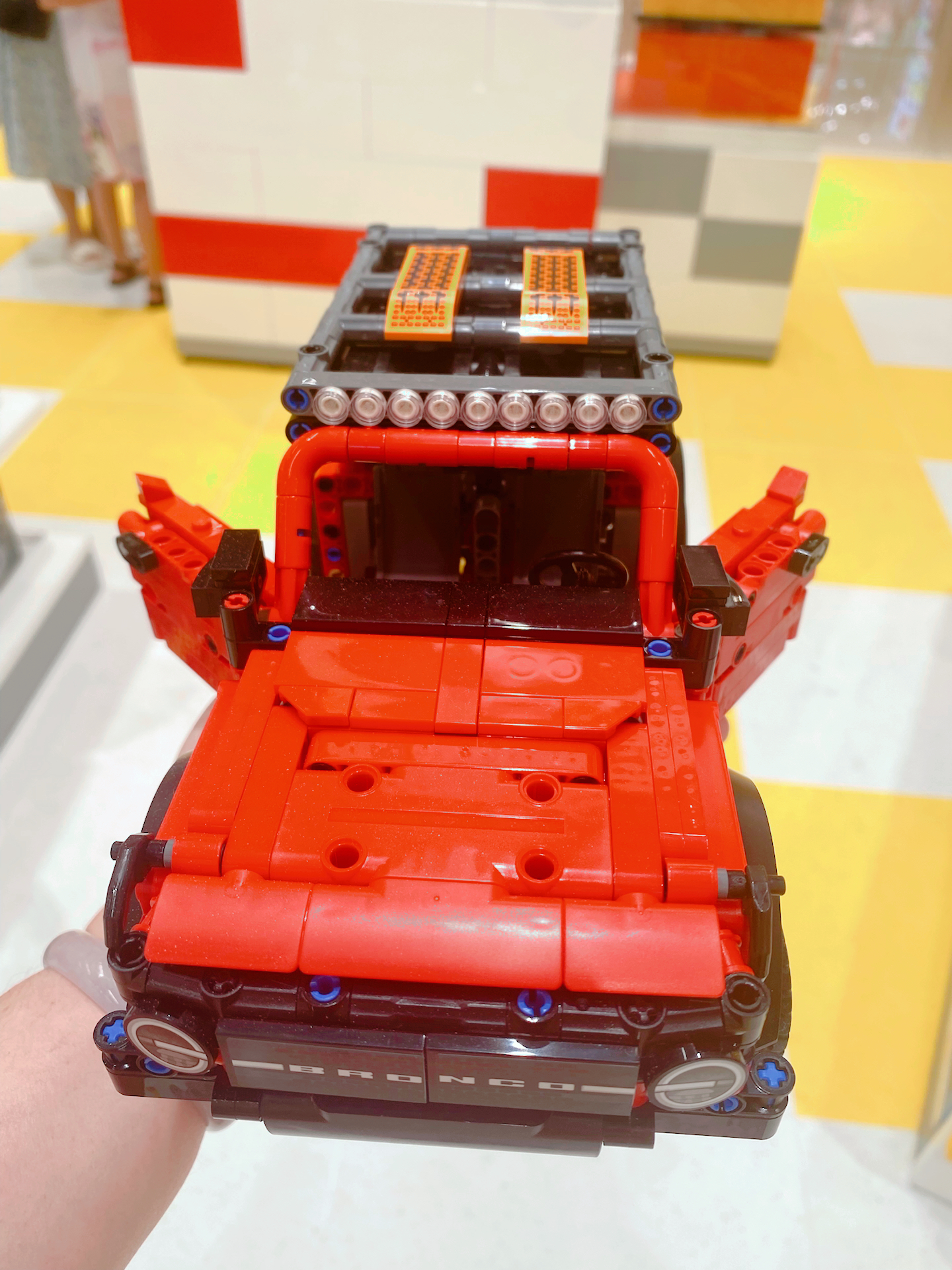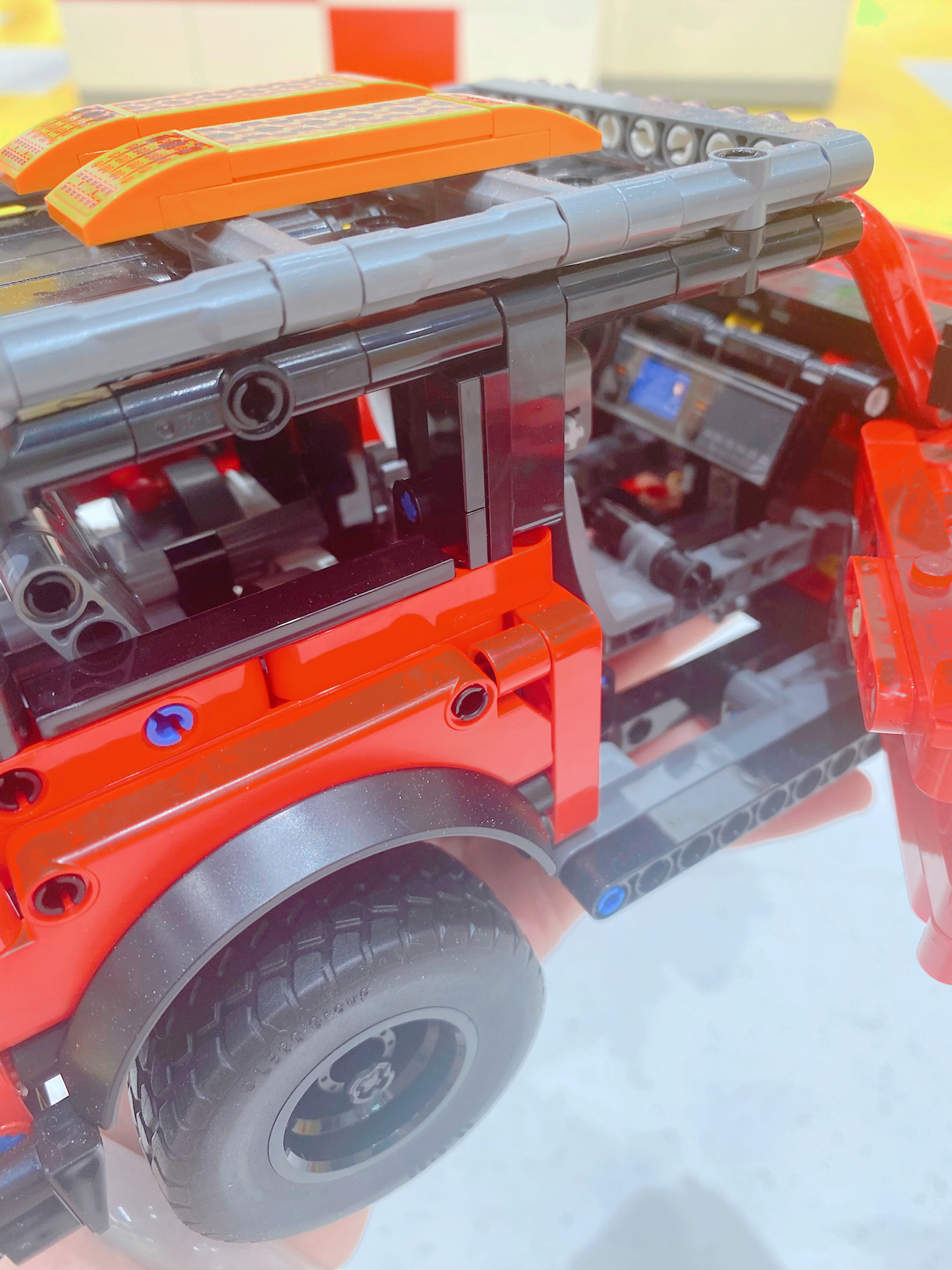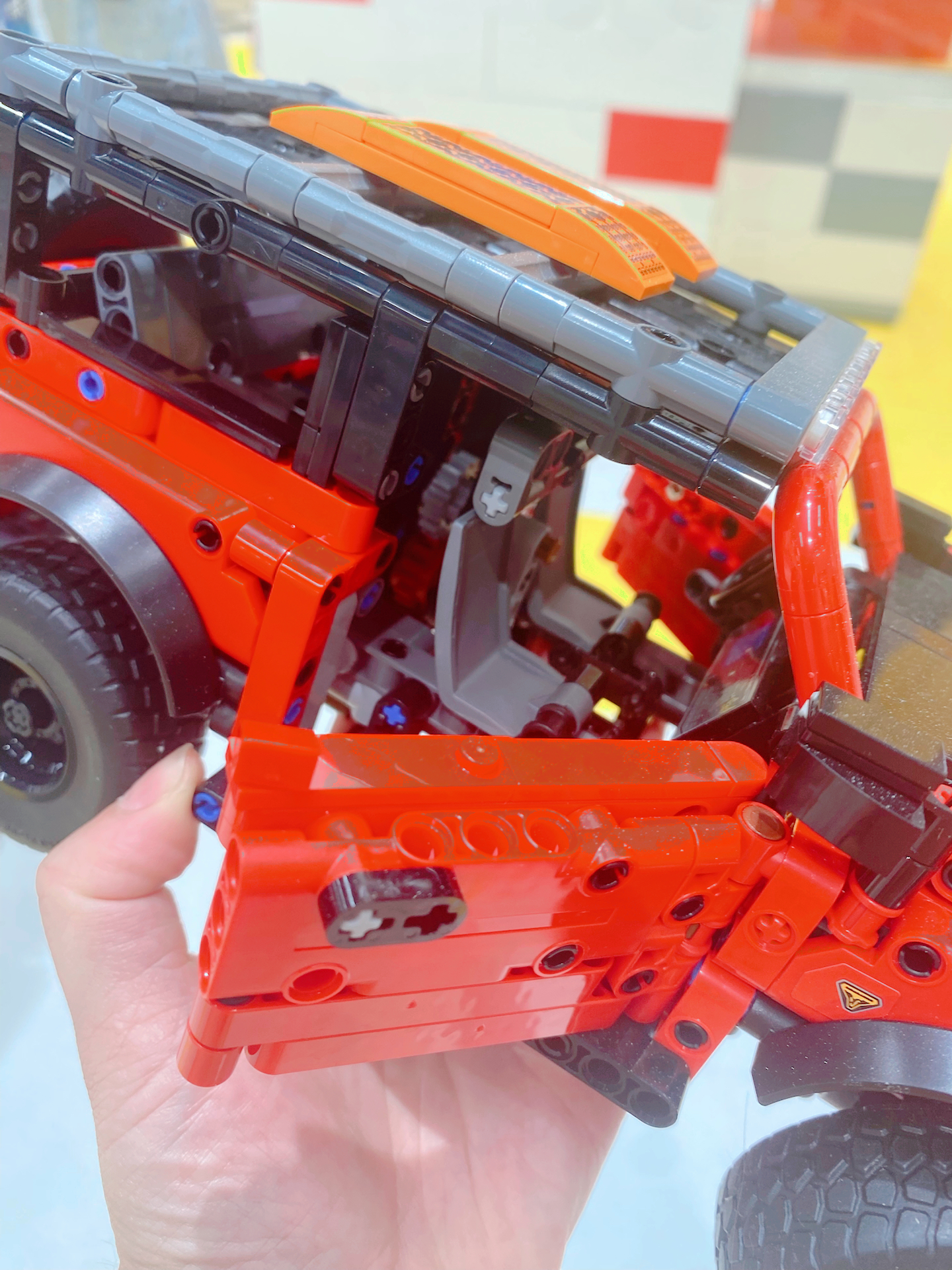 这款在今年8月1日新出的迷你版的福特烈马SUV套装真的超级好看, 一共943个零件,拼搭需要4个小时,拼搭完后成品大概28厘米长。 当时看到的时候就很喜欢,红黑色的配色,整体造型也比较还原,后面还有备用轮胎,细节性也太强了吧,而且备用轮胎还可以作为转向系统。 成品用来拍氛围图真的超级好看。 我觉得这款还是非常具有收藏价值,我们买了一套,还收藏了一套