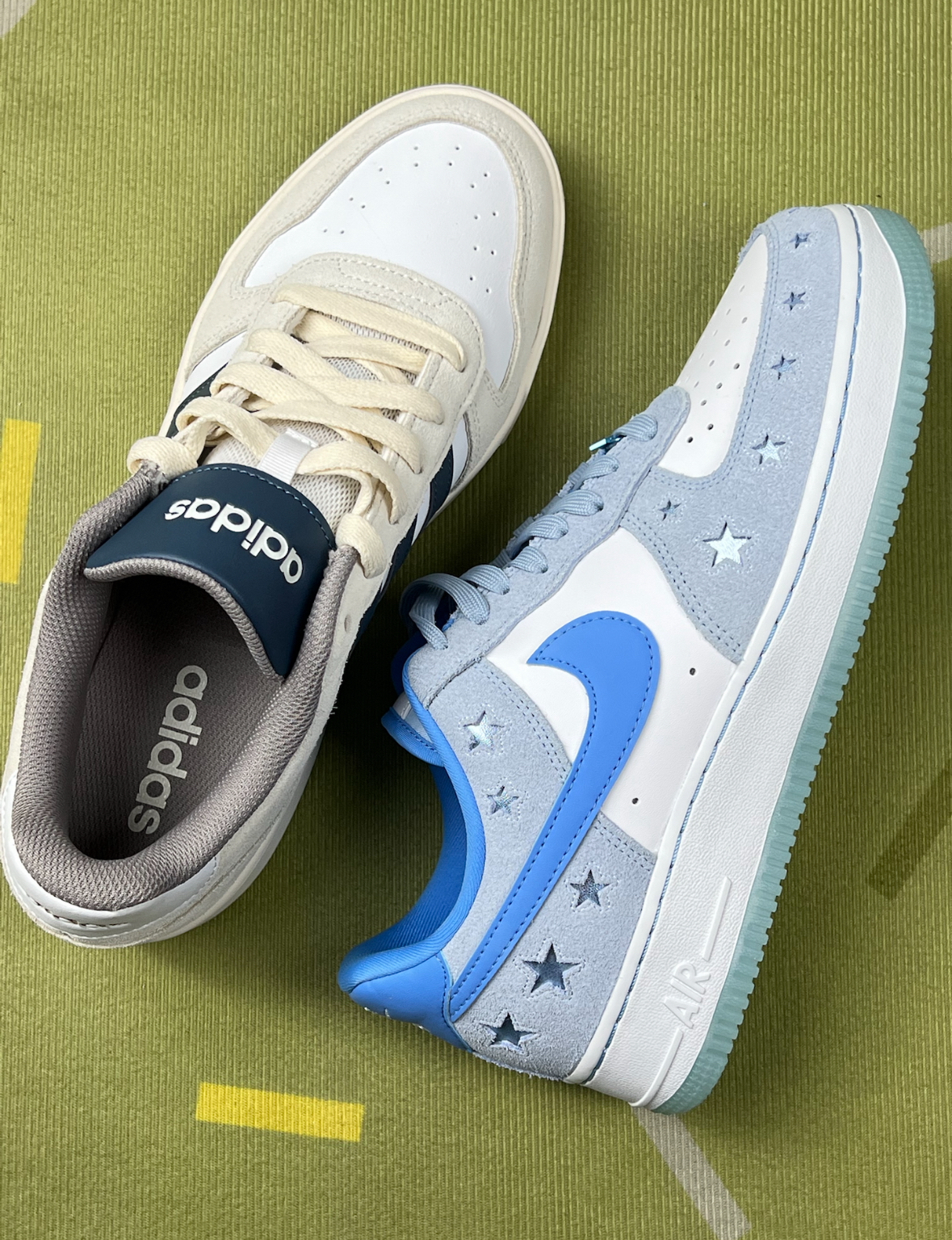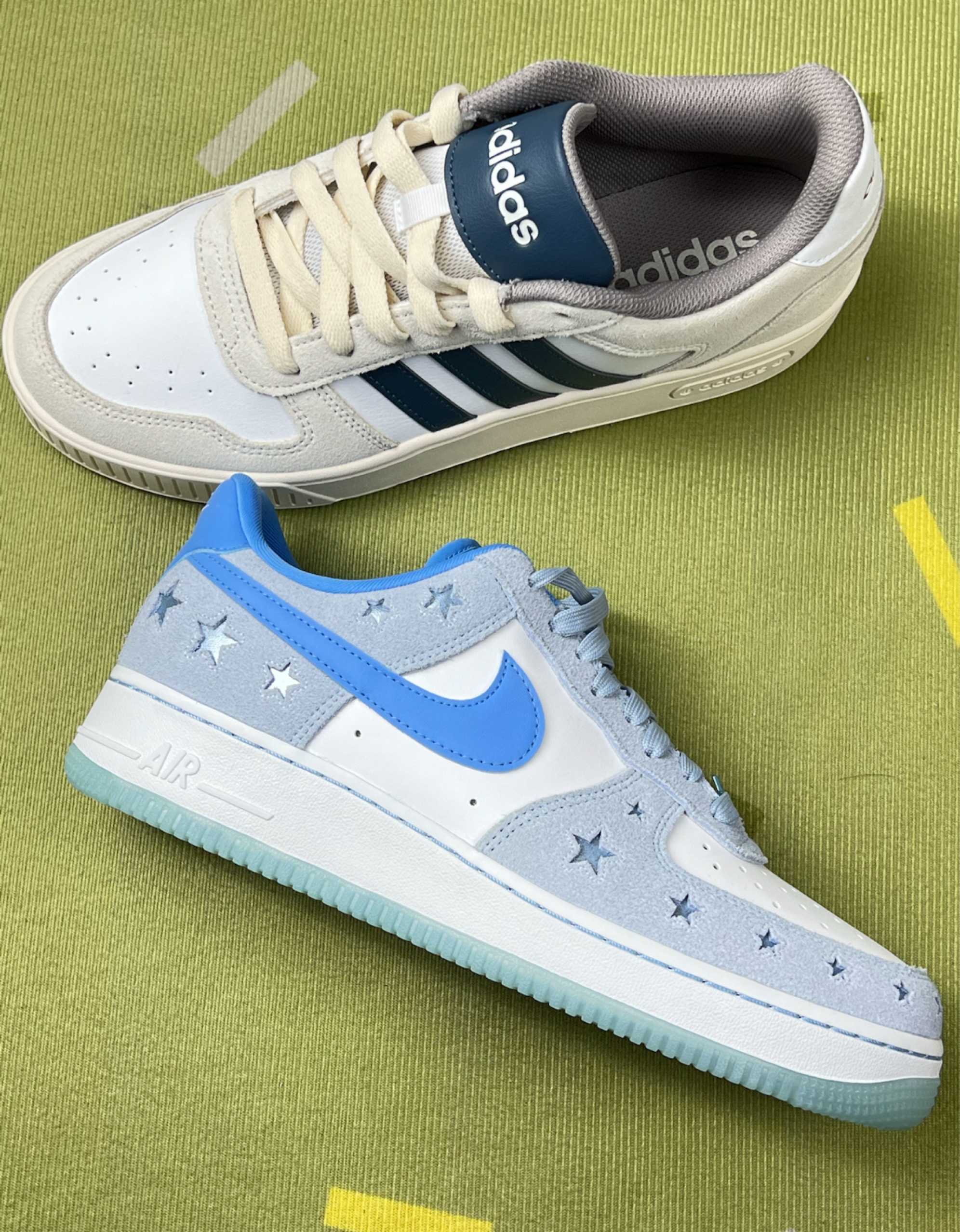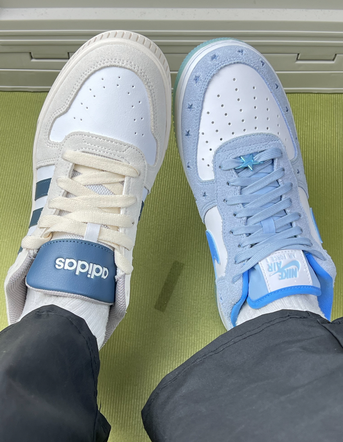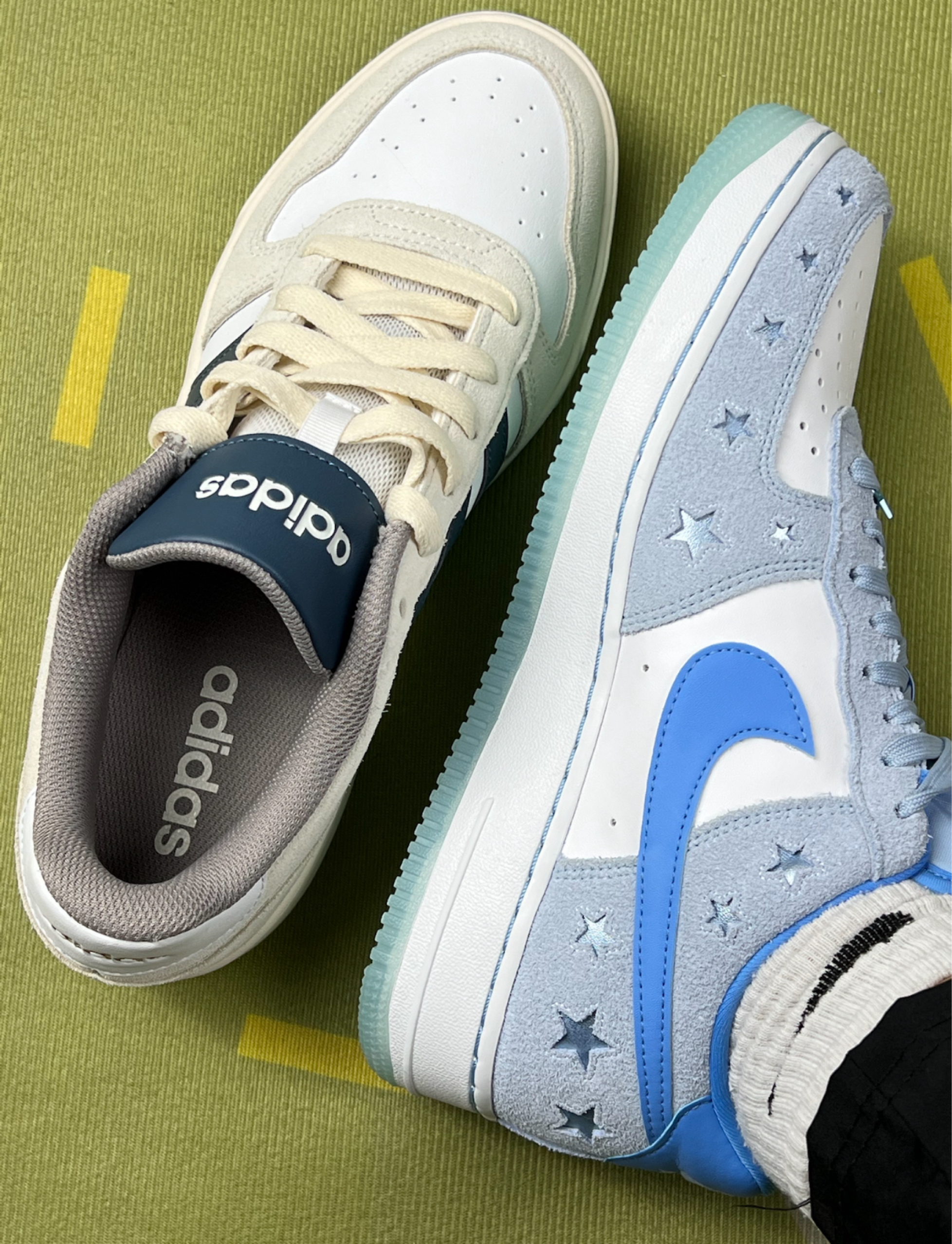 最近入了两双鞋,来唠唠真实体验~ 先看阿迪这双,配色挺清爽,麂皮和皮革拼接,质感还行。但鞋码有点迷,我按平时尺码买,上脚稍紧,得松松鞋带才舒服😕 鞋底不算软,长时间走路,脚底会有点累。 再是耐克空军这双,星星设计很戳我,蓝白配色小清新。不过麂皮材质容易脏,沾点灰就明显,打理起来费劲儿🧹 鞋帮对我来说有点高,脚踝灵活性差的,穿久了会有束缚感。 两双鞋都有让我心动的点,但也有小缺点,大家根据...