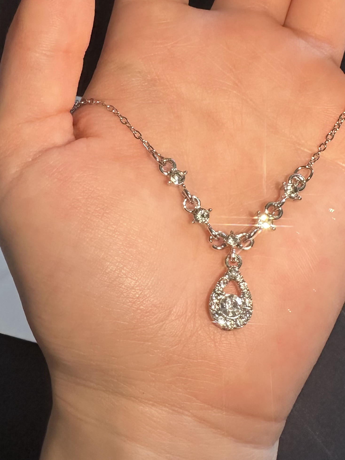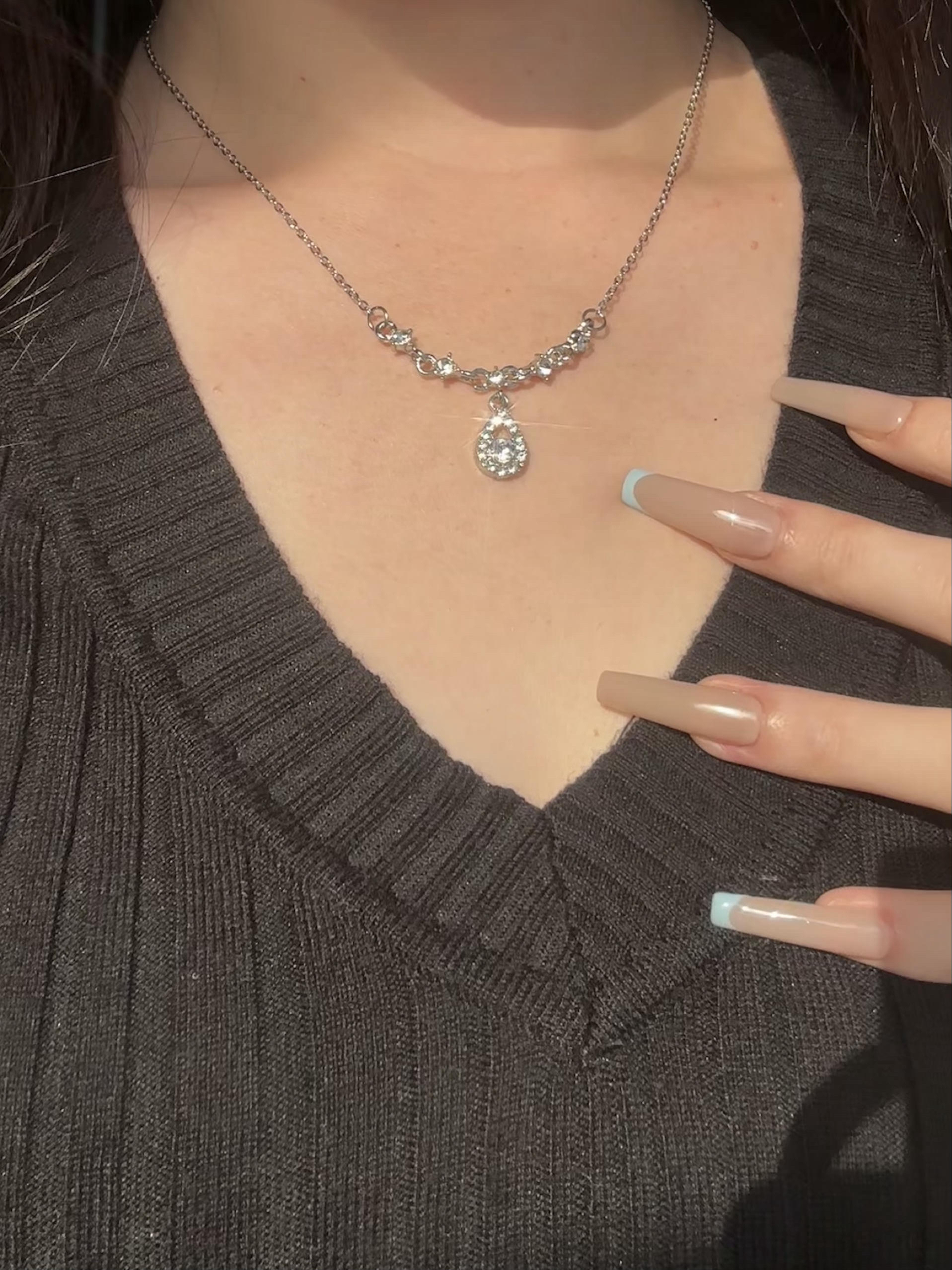 这款项链真的会发光 S925银的质感 搭我这个v领上衣绝了 锁骨处星光点点 闪得温柔又灵动 远看是温柔的光晕 近看能瞅见设计感的小细节 很高级 日常通勤戴不突兀 低调里藏着高级感 怎么搭都好看 你们平时穿低领衣服都搭什么项链呀
