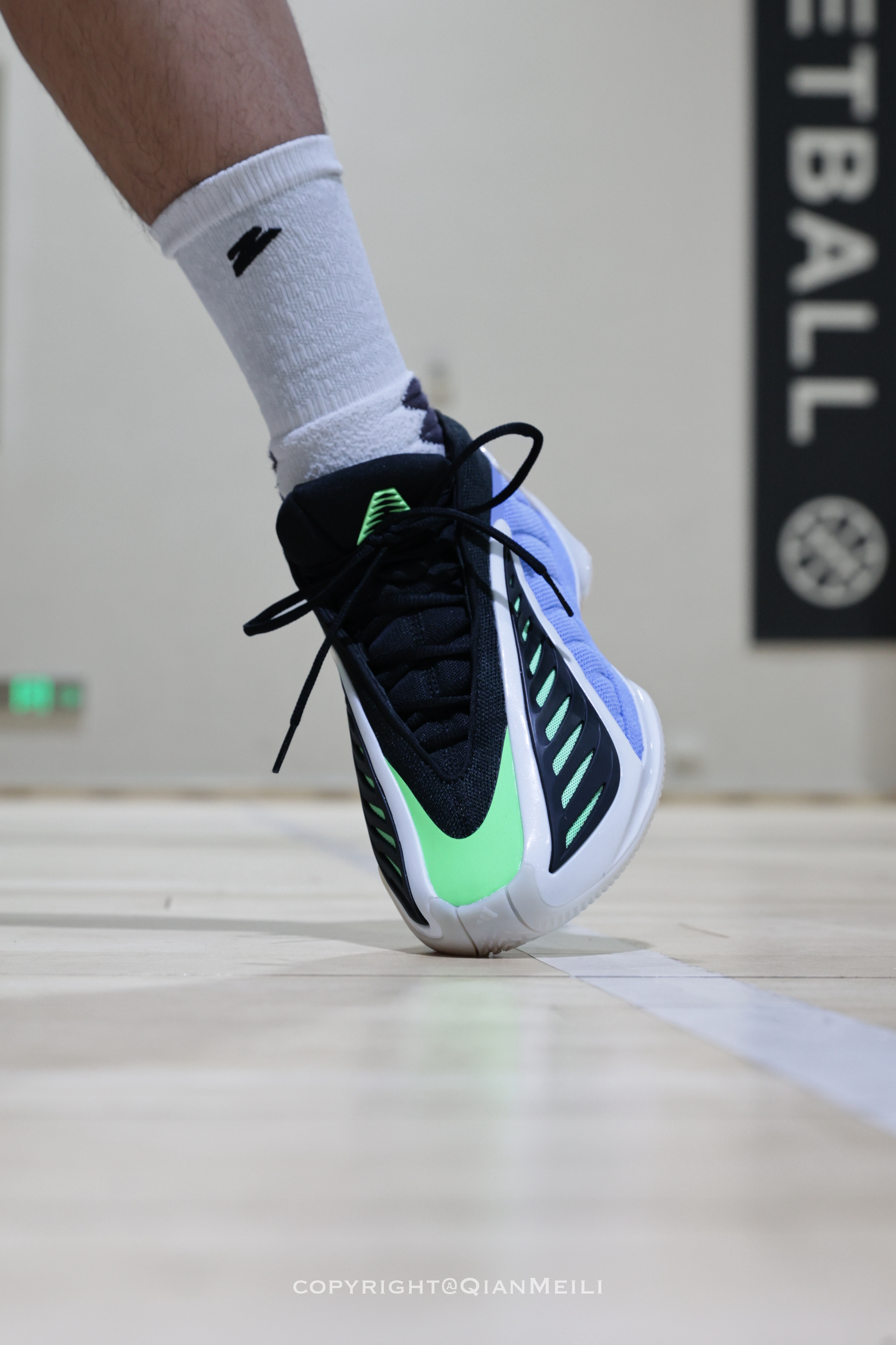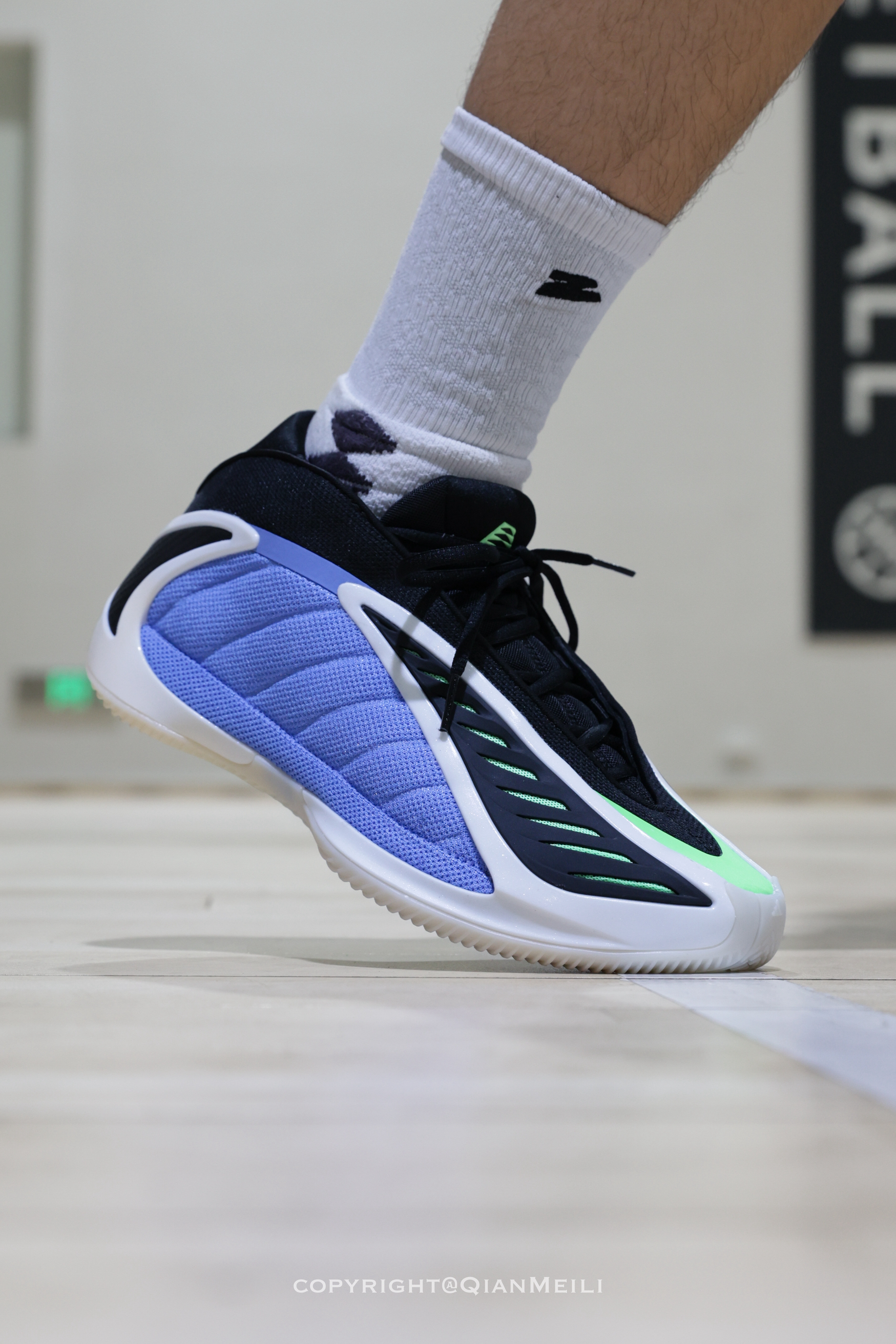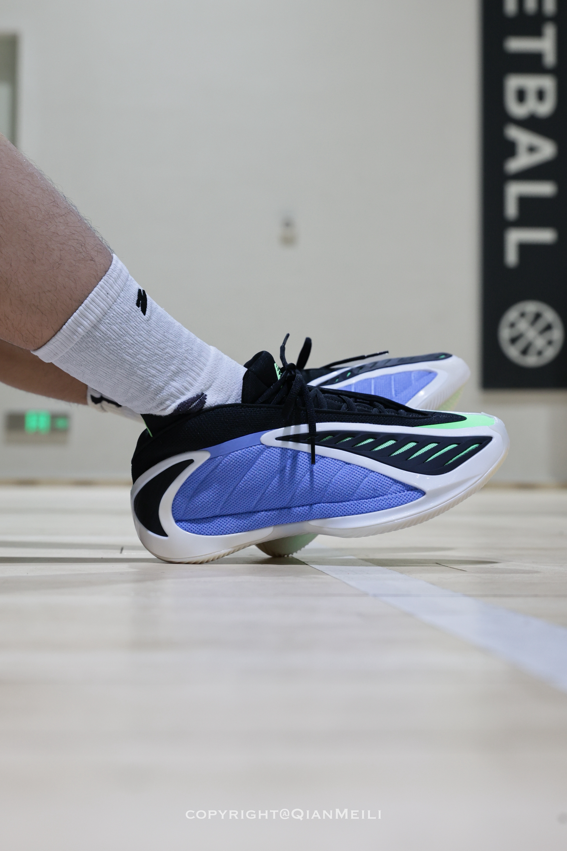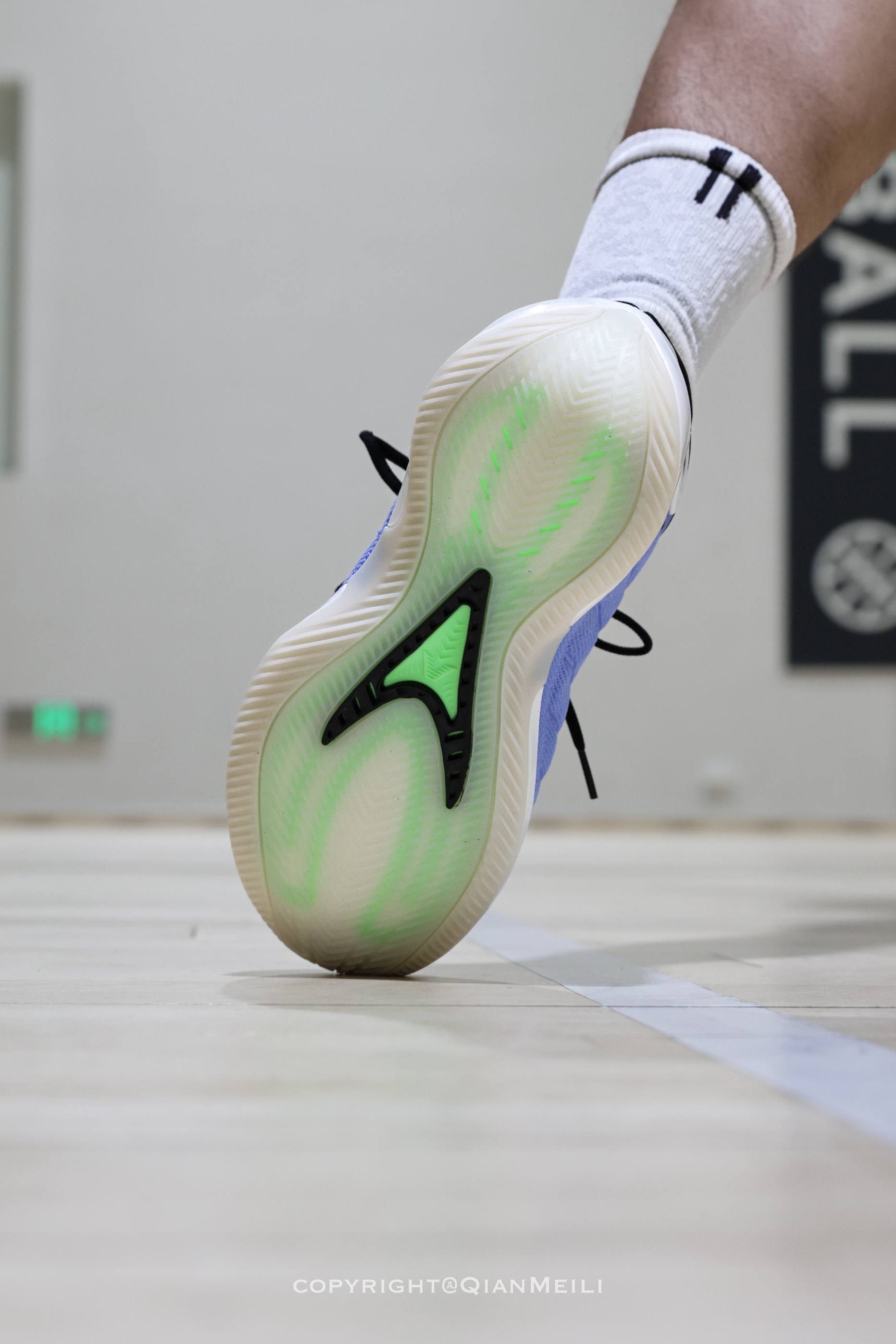 AE2的主场配色来了 鞋侧的tpu做的如同獠牙一般十分凶猛 鞋面鞋头位置延续了一代的设计 后跟十字形的设计镶嵌了两块碳板 鞋底是半透明乳色的 能清晰的看到绿色的硬质tpu