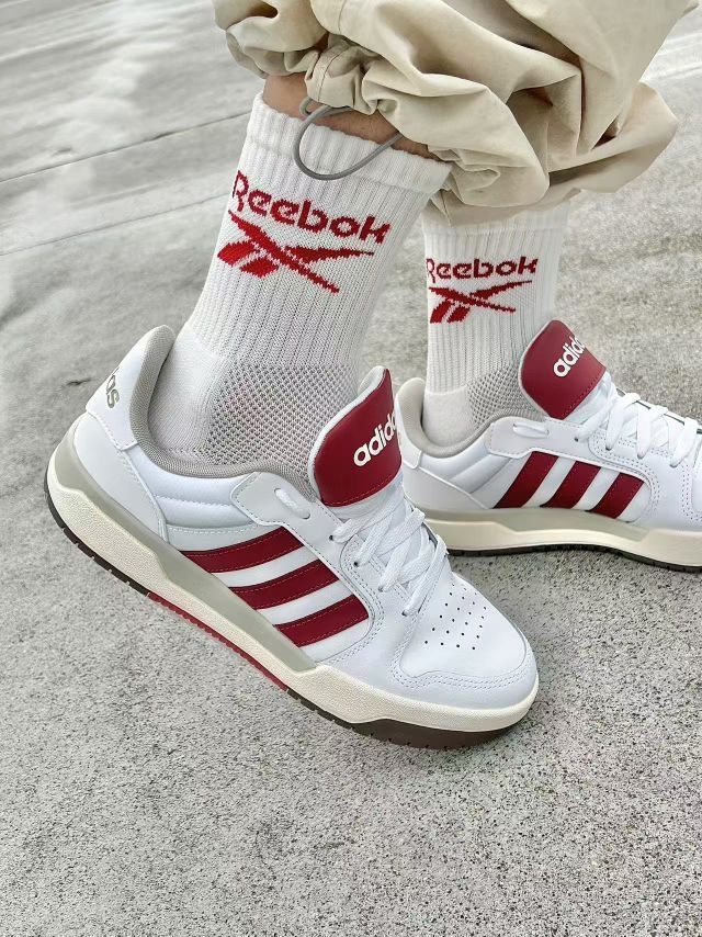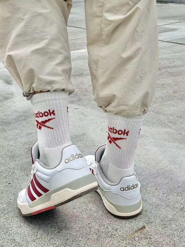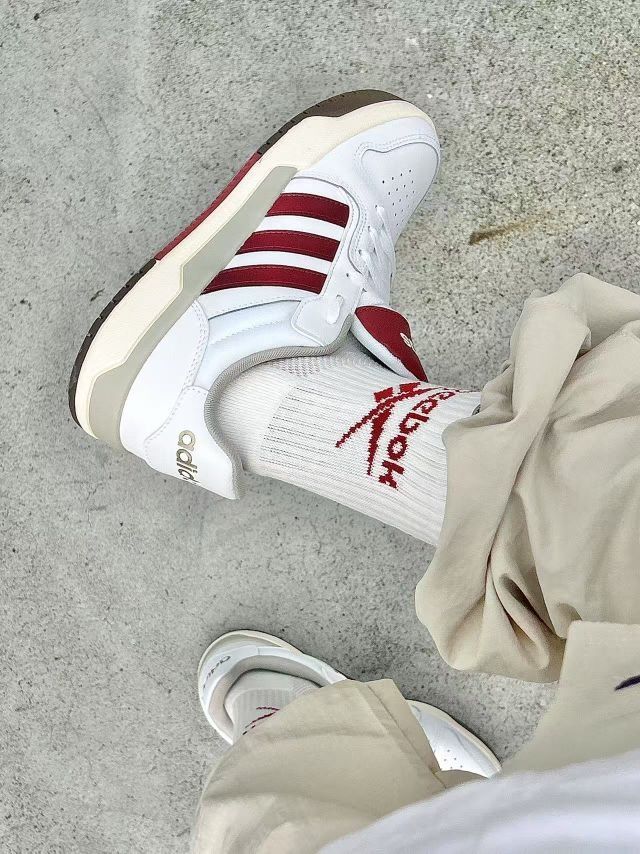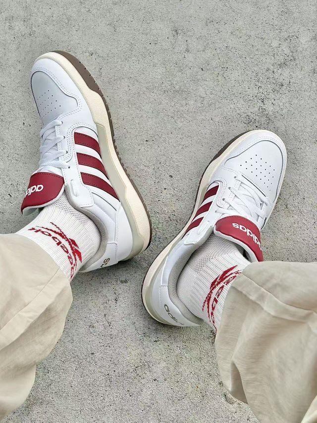 上脚还是蛮舒服的, 红色三条杠挺好看 鞋子轻便不累脚 搭配同色系袜子也好看
