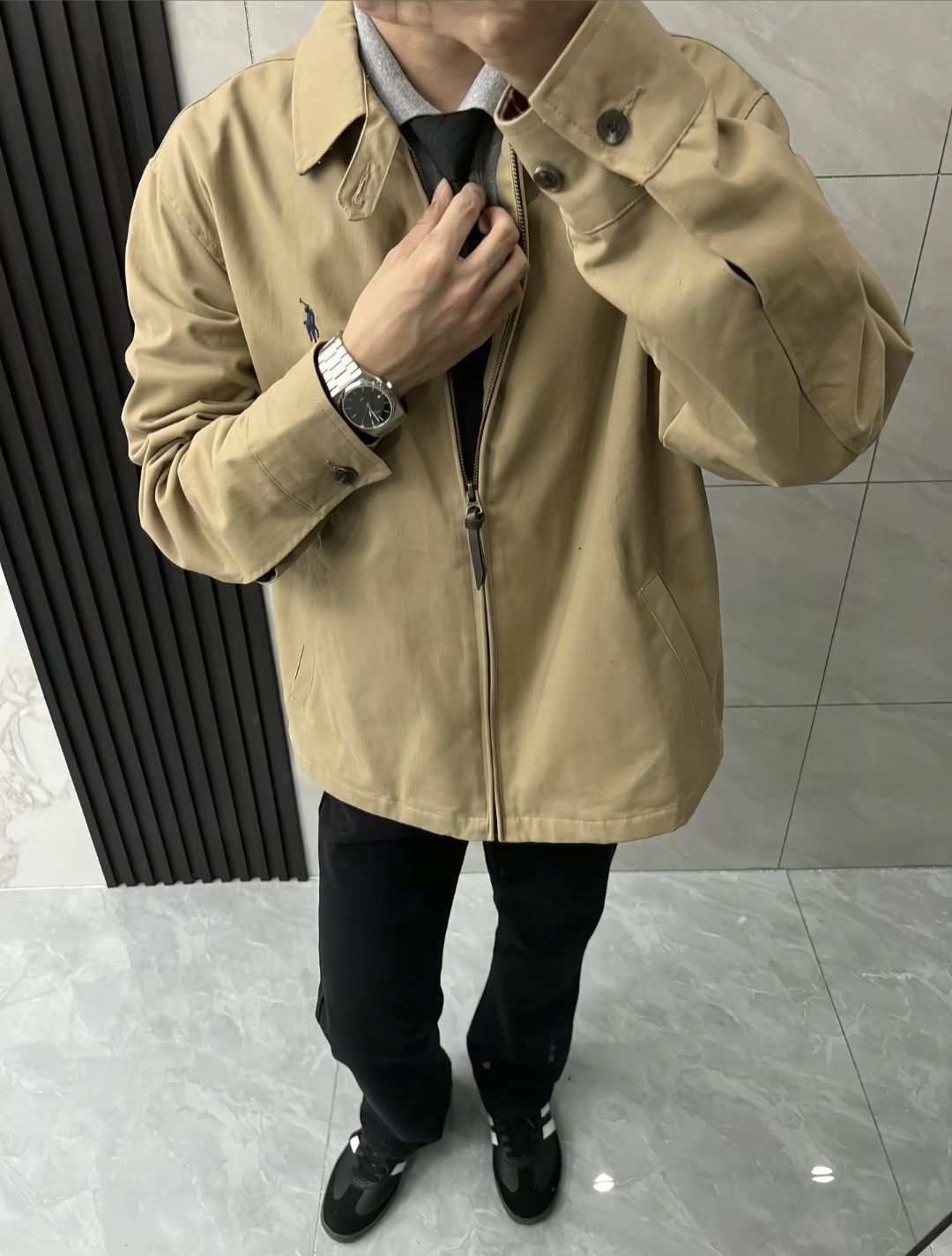 入秋韩系松弛感穿搭|被问爆的 Polo 穿搭公式 救命!谁懂早秋穿搭的松弛感啊✨ 这套 “卡其外套+灰色 Polo 衫+微喇裤” 组合,把韩系松弛感拿捏死了! 🔍 单品拆解 ✅ 卡其色 Polo 外套:经典卡其配色自带复古滤镜,翻领设计一秒切换休闲/轻商务模式,内搭 Polo 衫+领带,叠穿层次感拉满,通勤/约会都适配~ ✅ 灰色 Polo 衫:基础款也能穿出高级感!胸前刺绣徽章精...