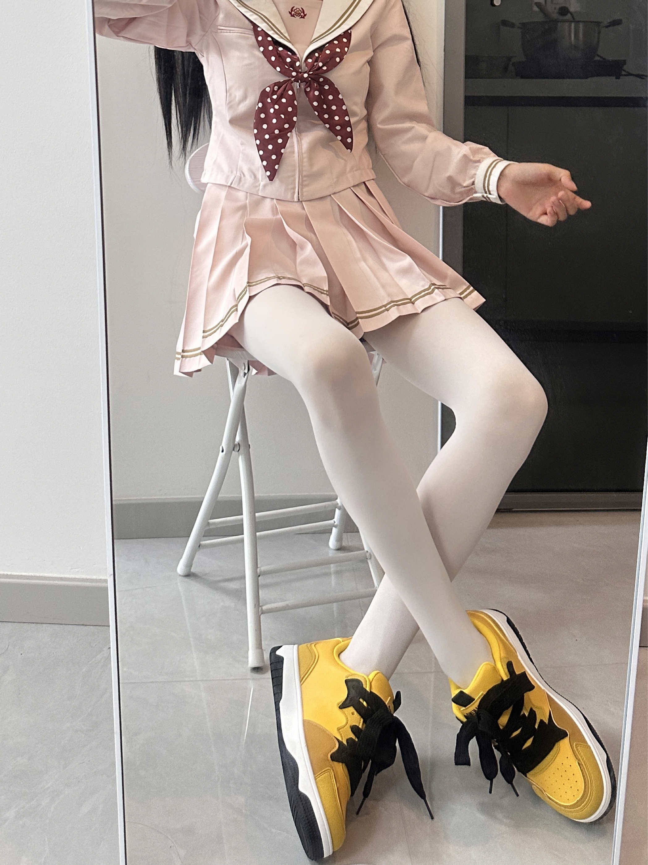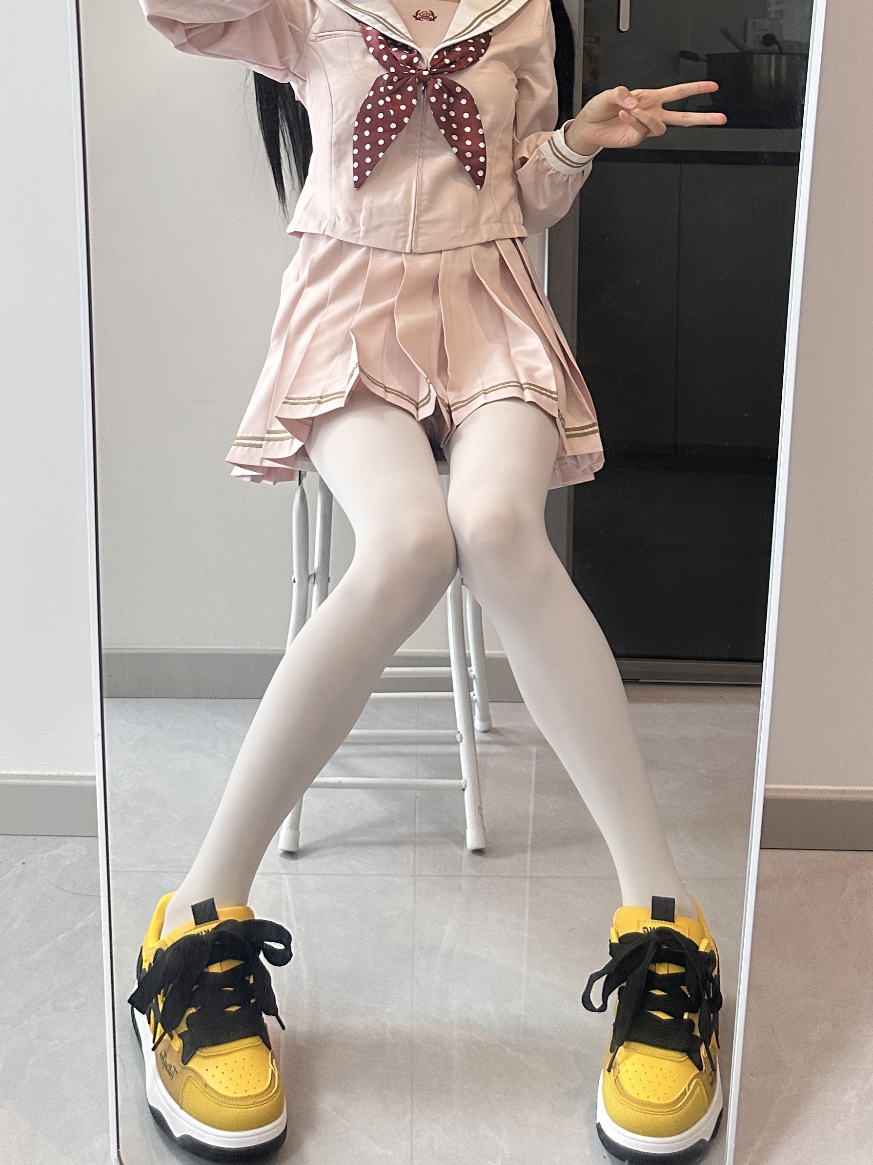 今天穿了套粉色水手服,嫩到没边咯!搭配的鞋子是汤姆猫,这个电母黄上脚好显白,大小合适,还是厚底,增高显腿🦵长哦~