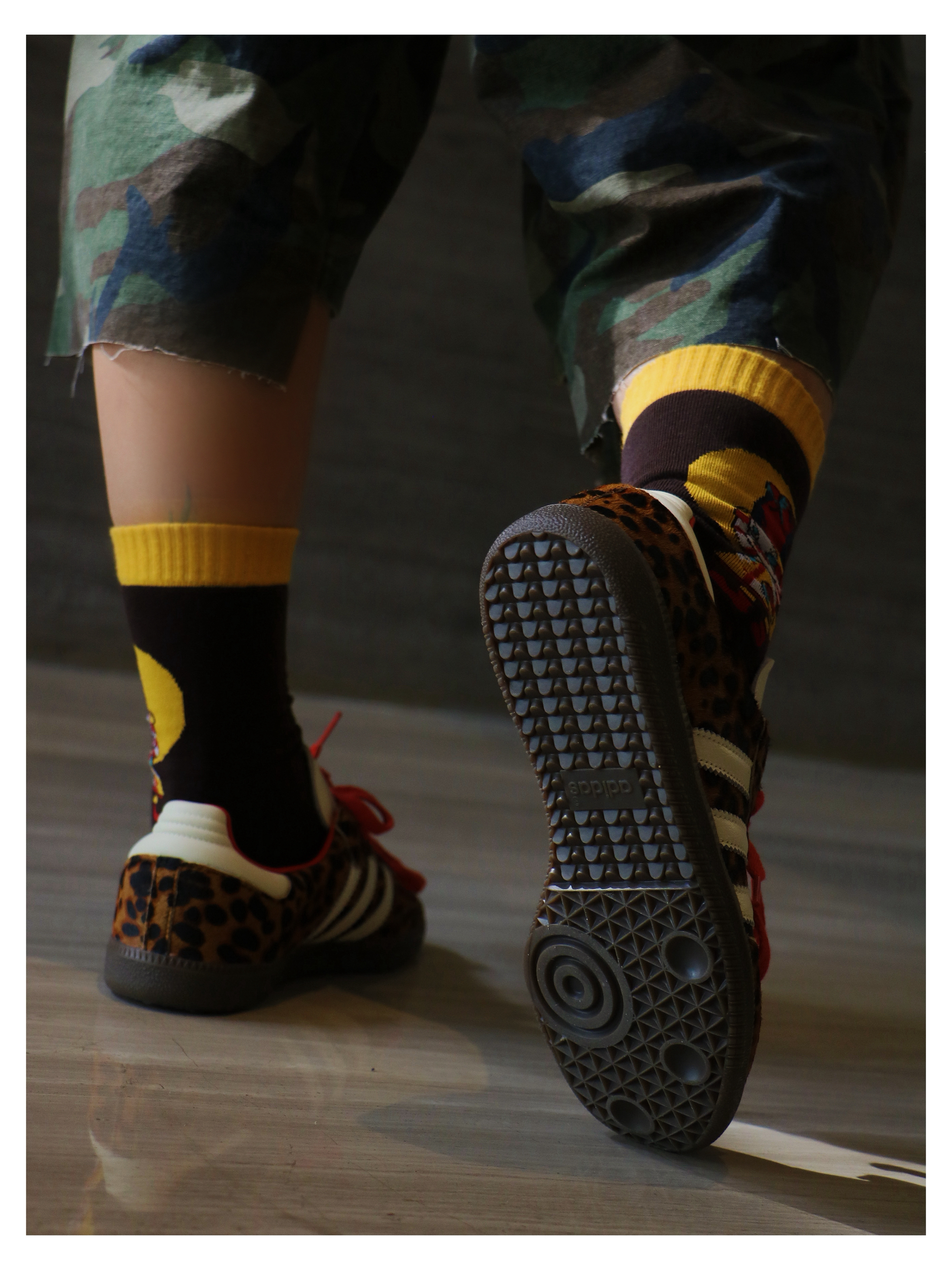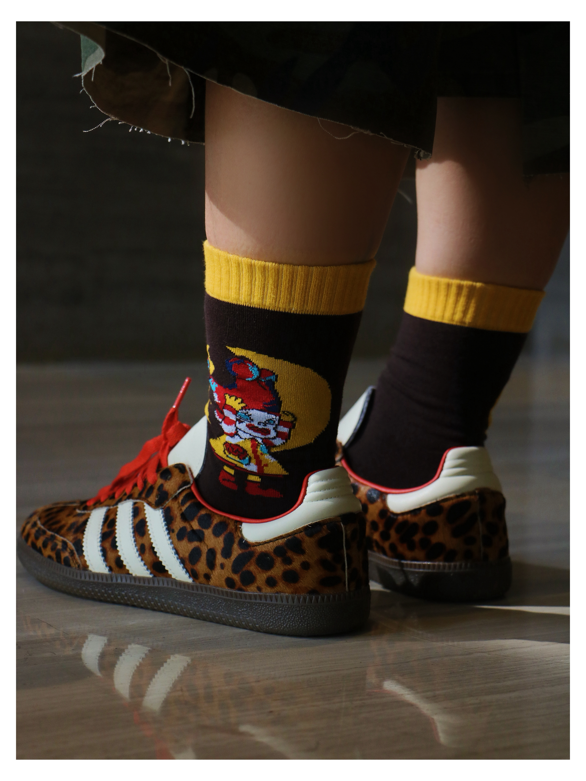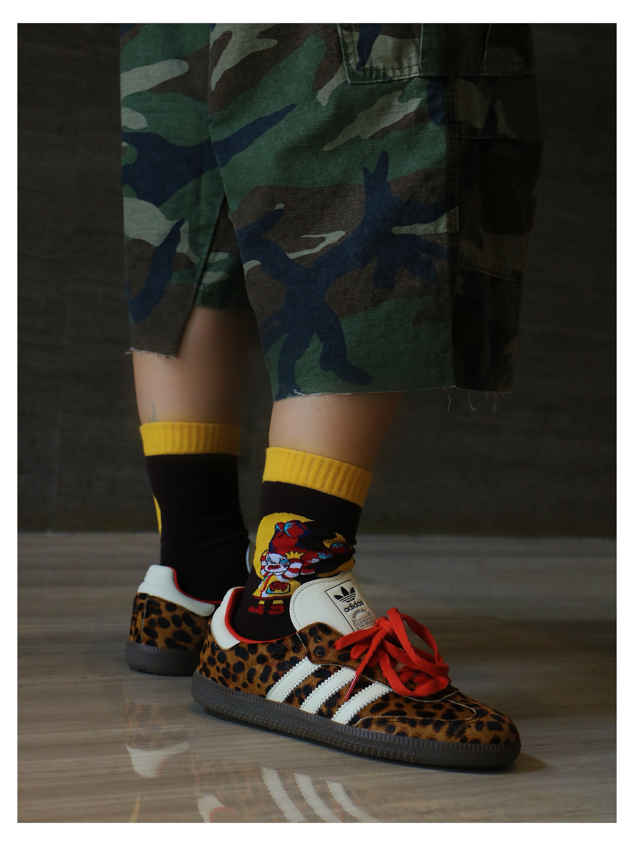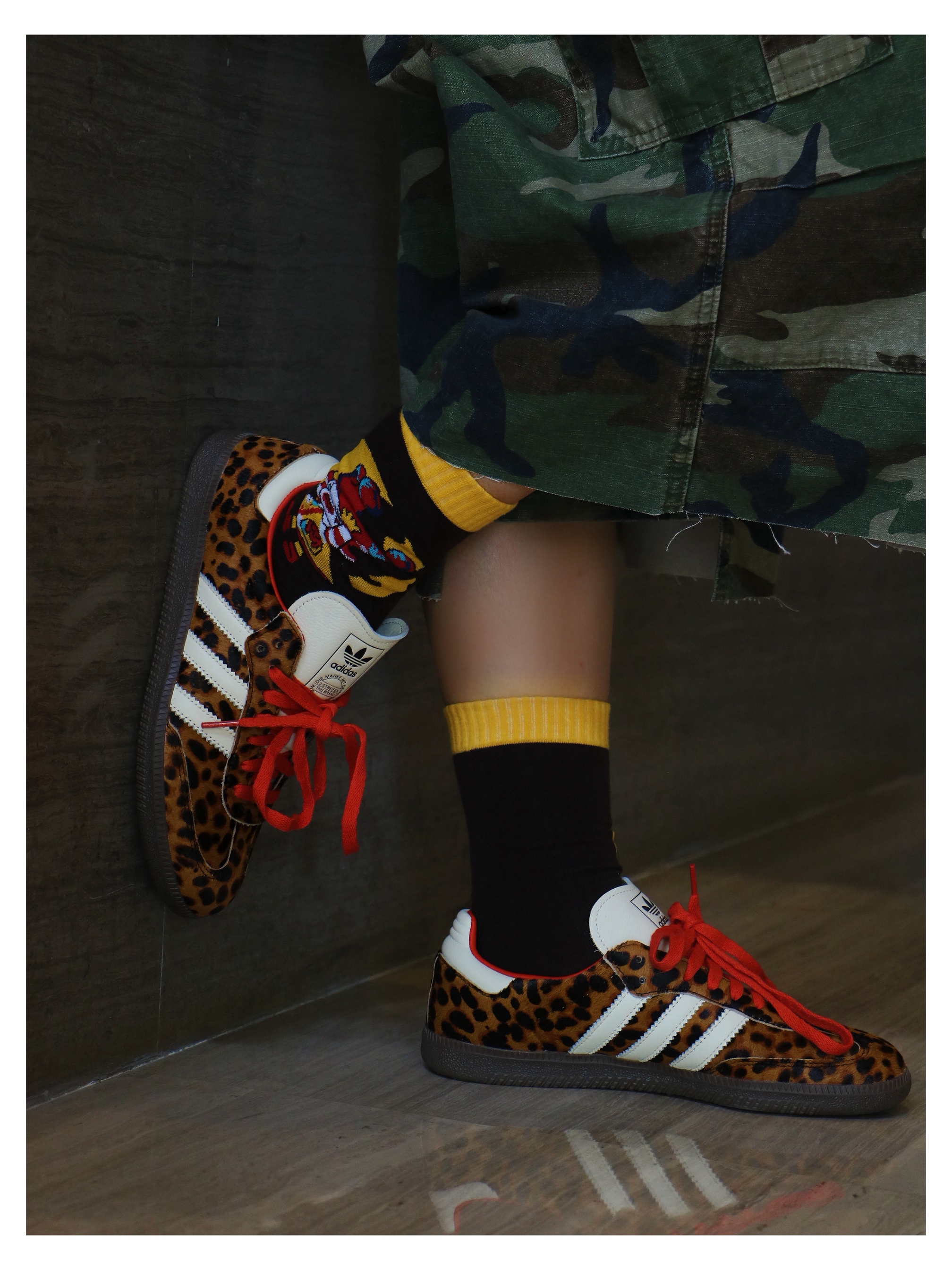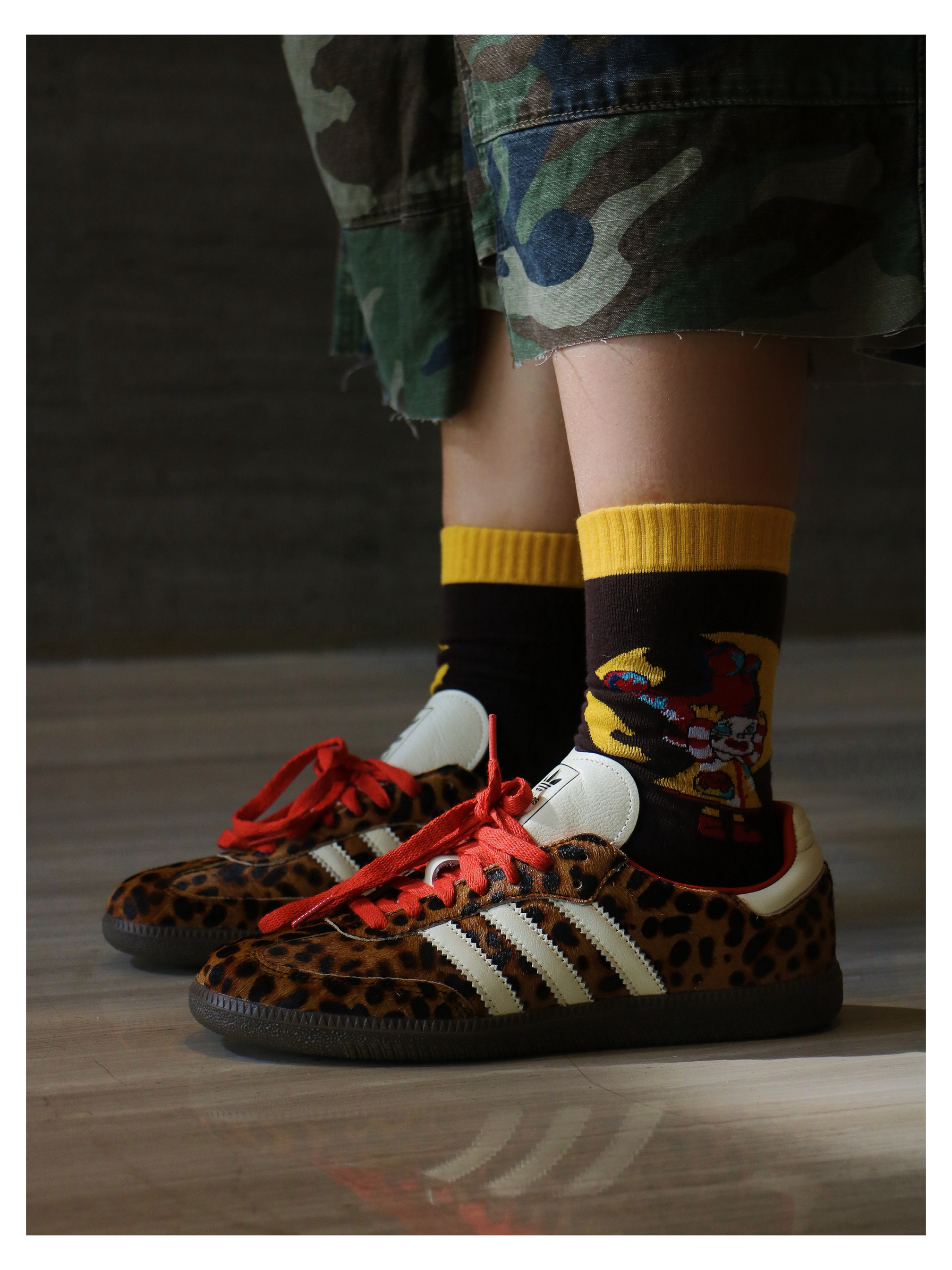 时髦精 豹纹薄底鞋 多巴胺卡通中筒袜穿搭分享 皮毛豹纹帮面 手感顺滑舒适, 鞋身两侧皮革三条杠logo 拼接 橡胶底面 耐磨防滑 出街搭配 卡通logo 印花中筒袜 时髦感满满