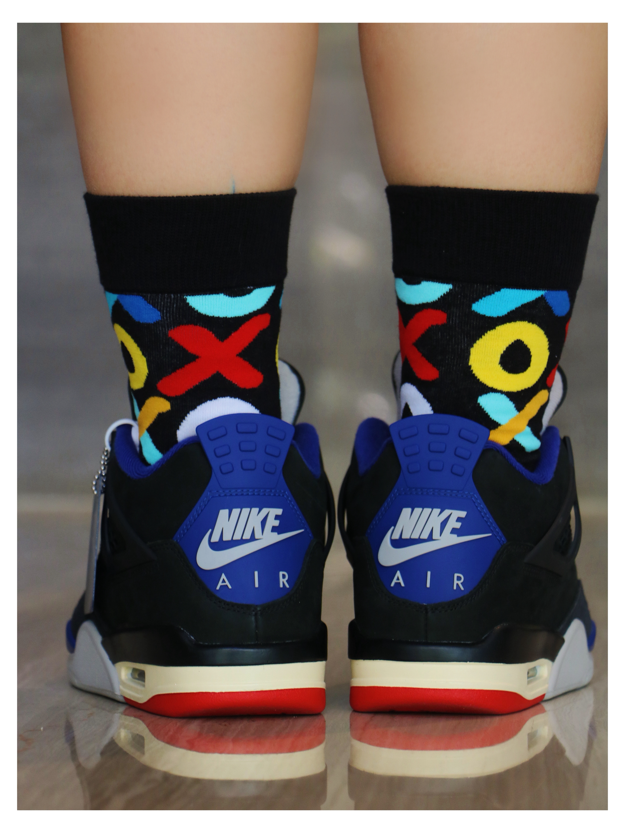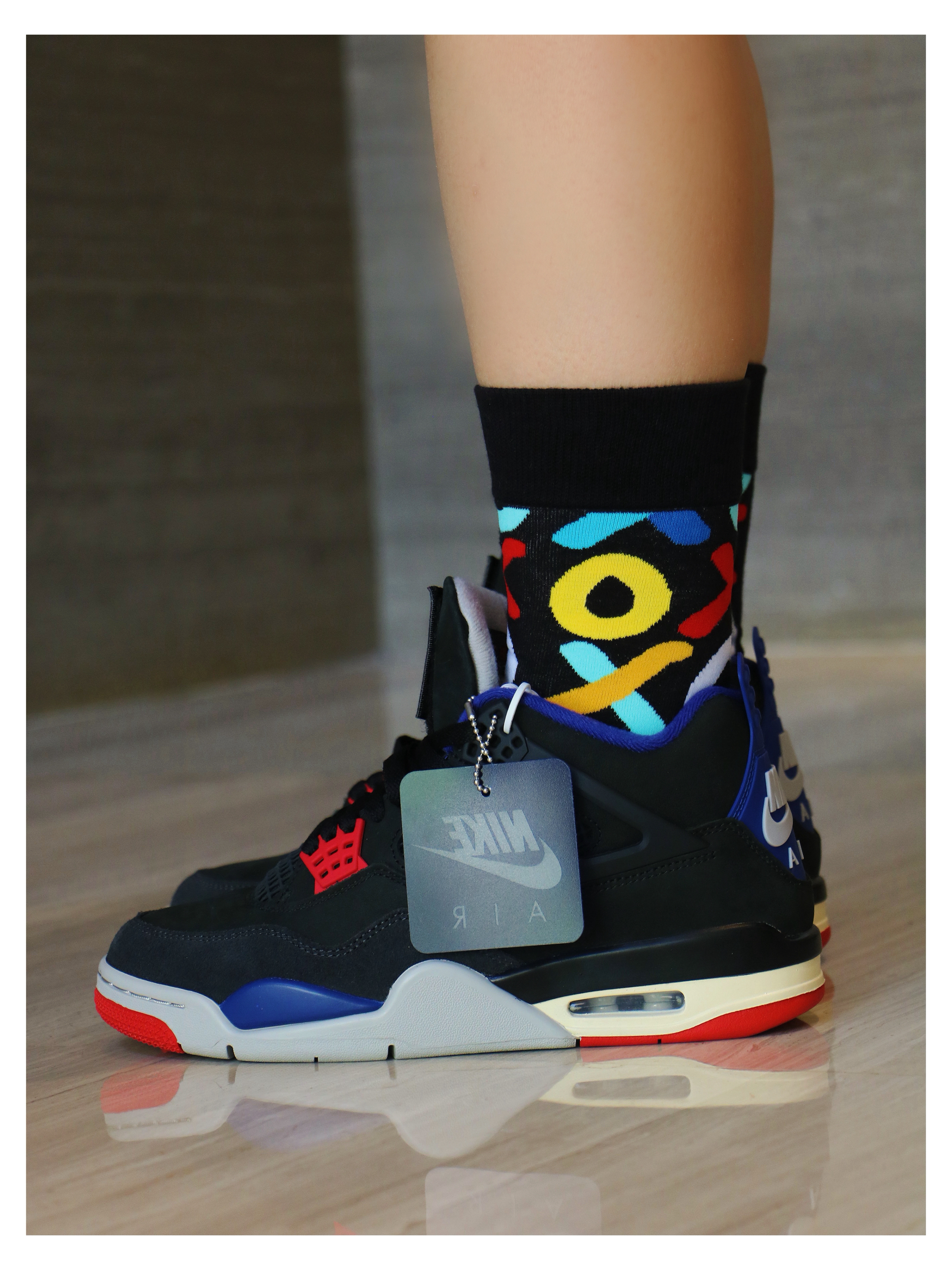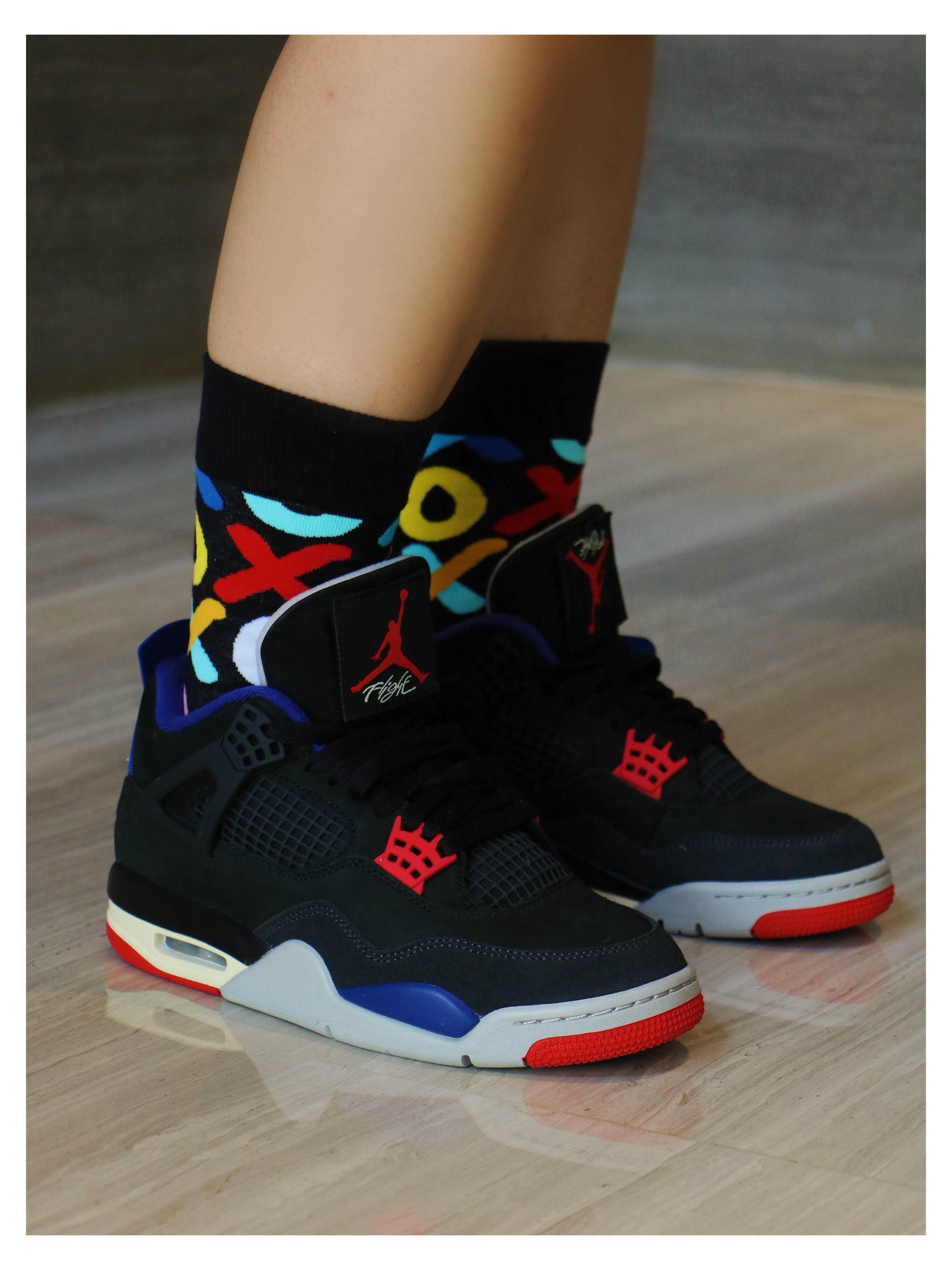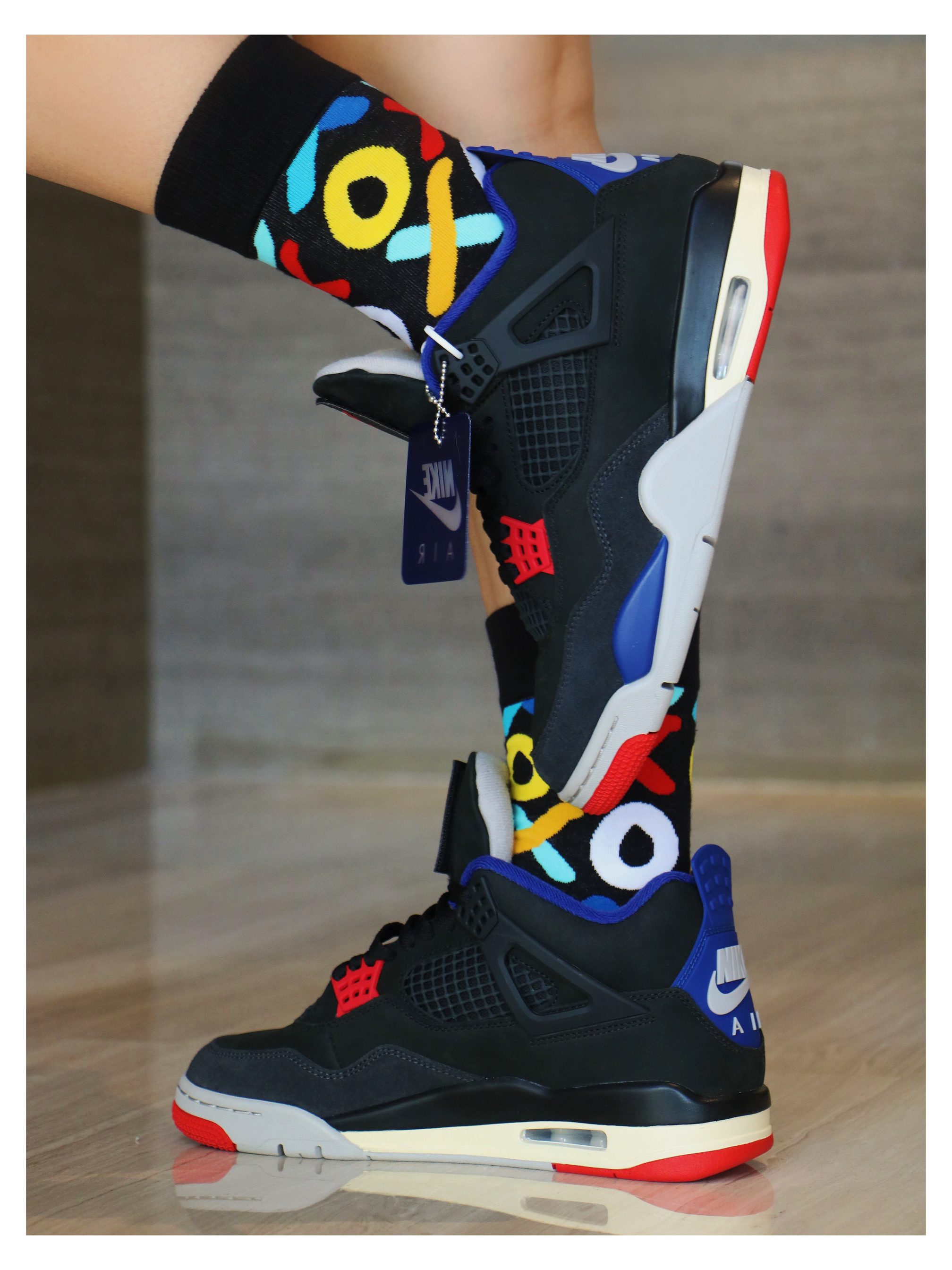 经典复古篮球鞋 air jordan 4 此次鞋款以黑 蓝 为主色调 结合红色点赞 翻毛皮质感舒适、中底缓震回弹 大底面橡胶耐磨防滑 尺码选择上正常即可,通勤出街 搭配多巴胺色系中筒袜,舒适高级 太帅了