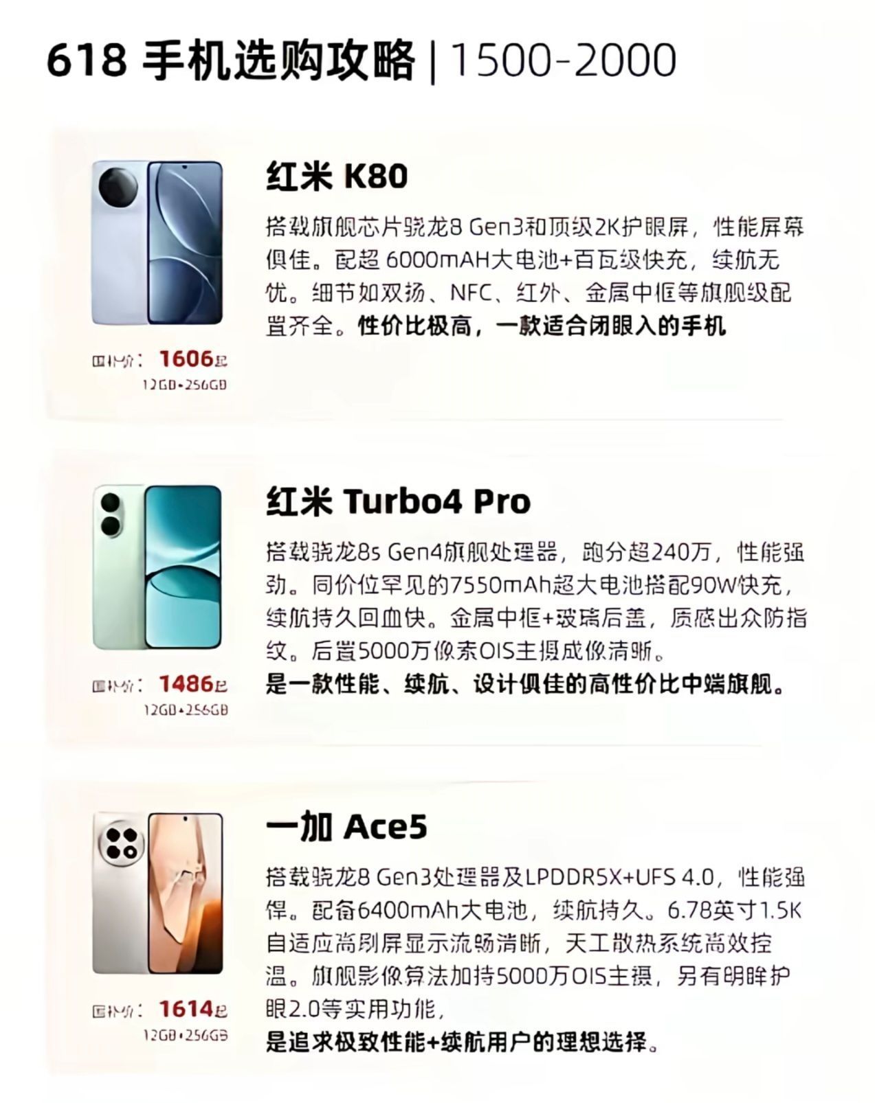 2000元以内 红米Turbo 3:价格为12+256G,1539元;12+512G,1739元。搭载骁龙8s Gen3芯片,性能强劲,配合4800mm²循环冷泵散热系统,游戏体验较好。机身轻薄,厚7.8mm,重179g,还搭载5000mAh电池+90W有线快充,屏幕素质也不错。 一加Ace 3V:售价12+256G,1749元;12+512G,2049元。首发骁龙7+ Gen3芯片,搭配超...