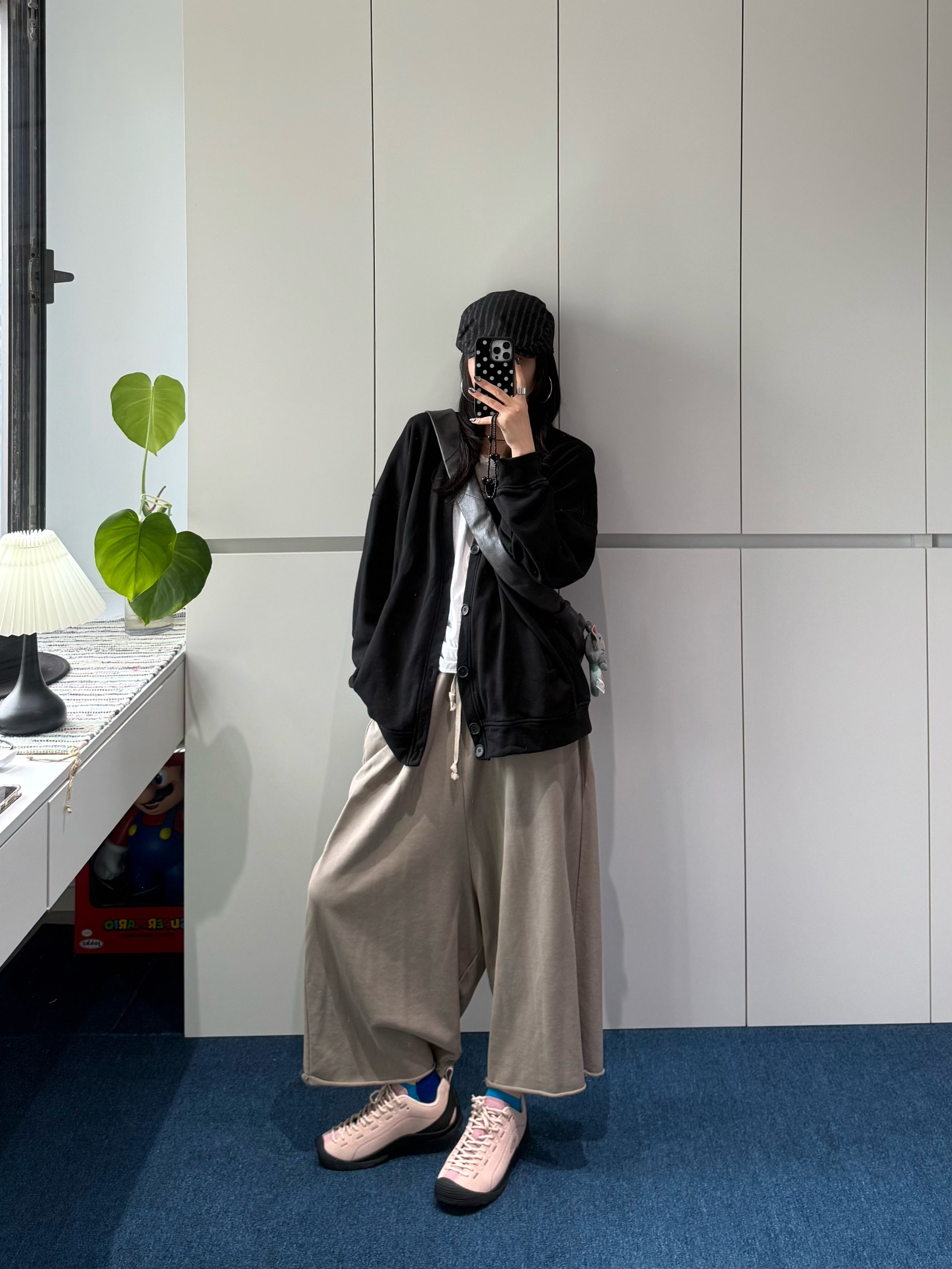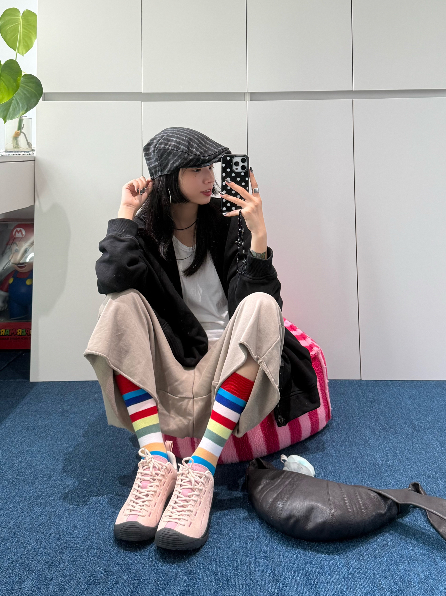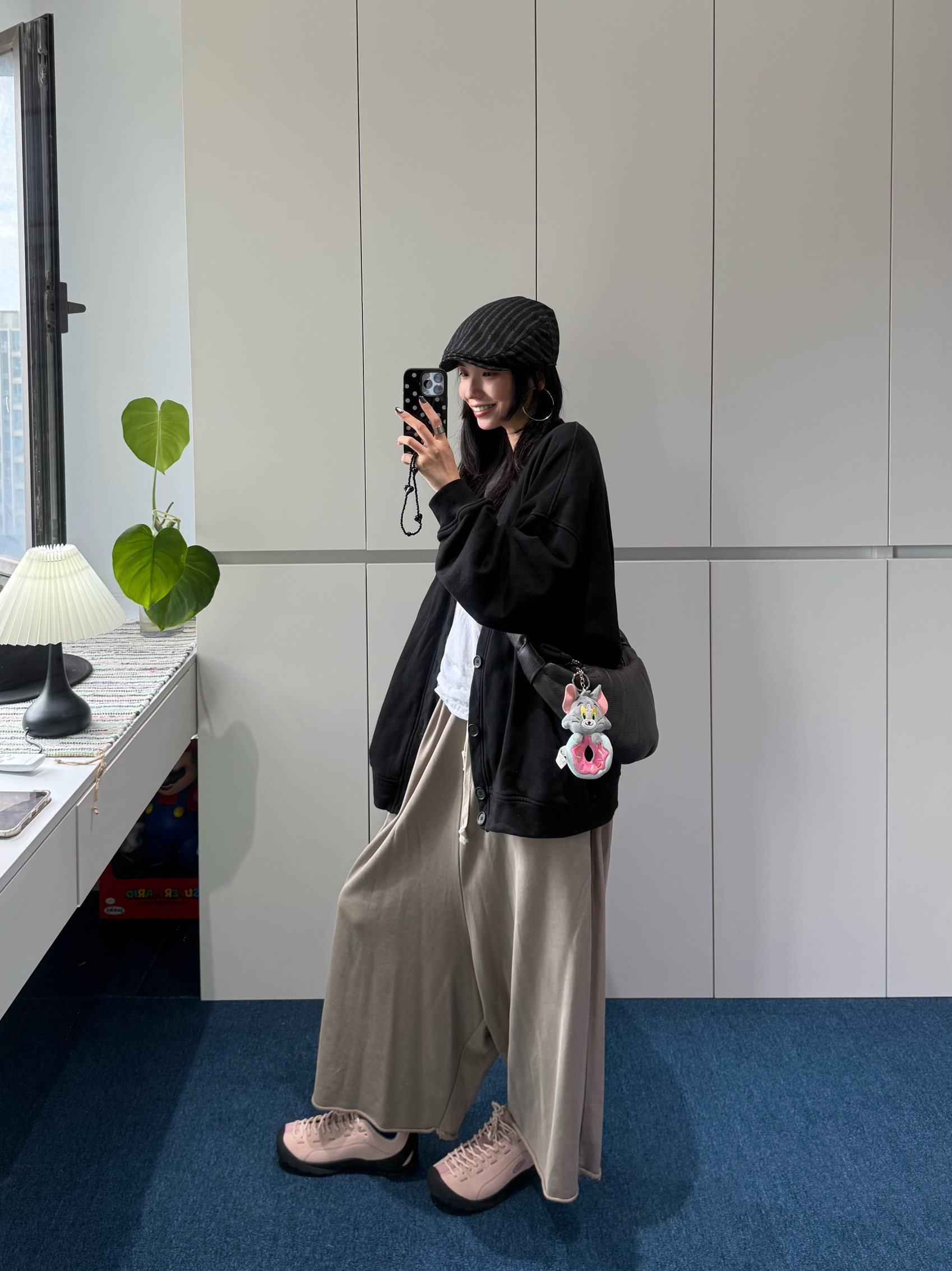 黑色开衫版型宽松,内搭基础白T,简约却很有层次 重点是这条卡其色阔腿裤,裤型太绝了,垂坠感拉满,不仅藏肉还能穿出大长腿 脚上的粉色运动鞋+彩色条纹袜,瞬间让造型有了亮点 复古报童帽一戴,街头感和复古感直接拉满, 日常出街吸睛度爆棚,妥妥的个性时髦精look~