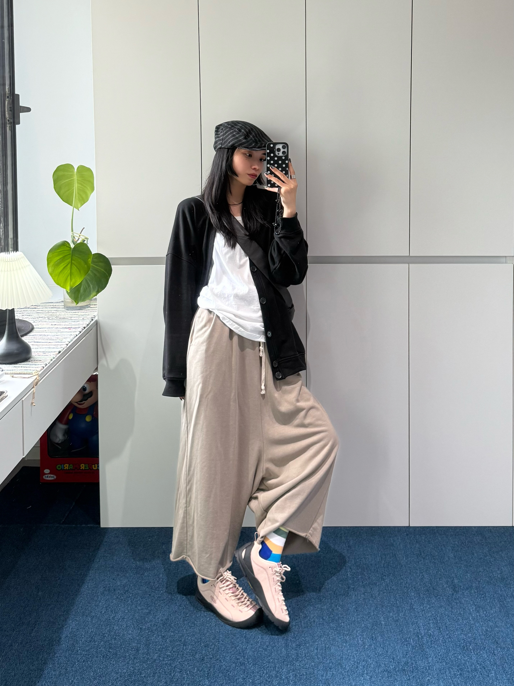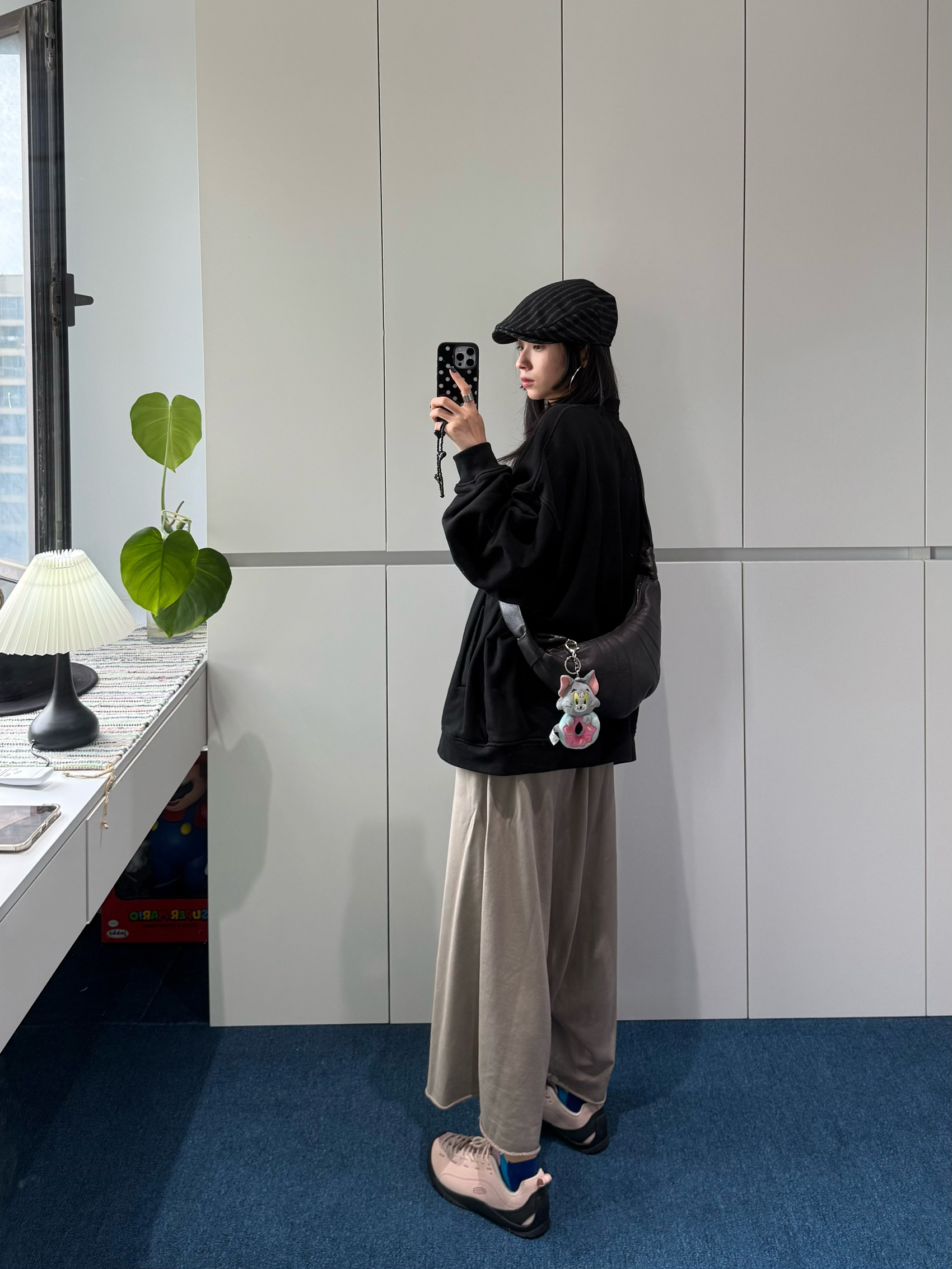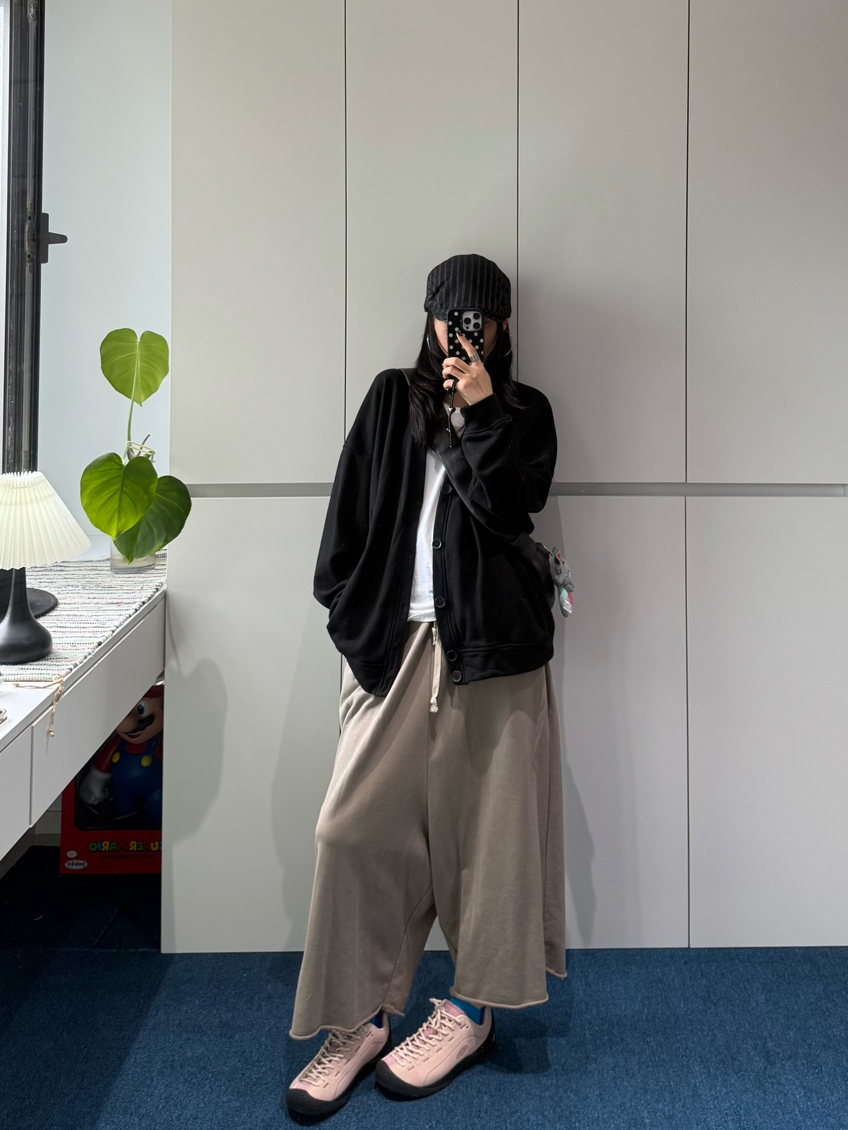 黑色开衫版型宽松,内搭基础白T,简约却很有层次 重点是这条卡其色阔腿裤,裤型太绝了,垂坠感拉满,不仅藏肉还能穿出大长腿 脚上的粉色运动鞋+彩色条纹袜,瞬间让造型有了亮点 复古报童帽一戴,街头感和复古感直接拉满, 日常出街吸睛度爆棚,妥妥的个性时髦精look~