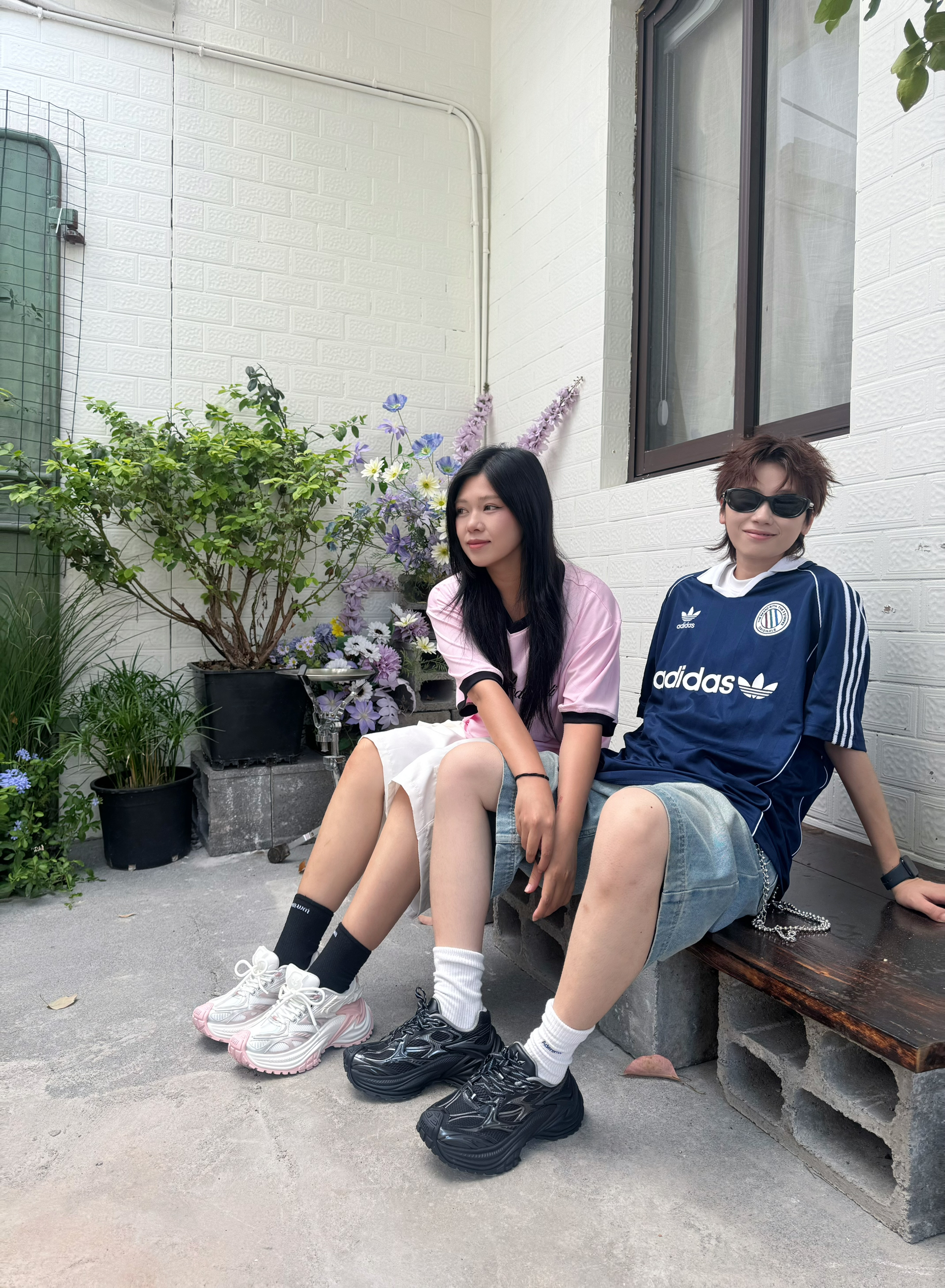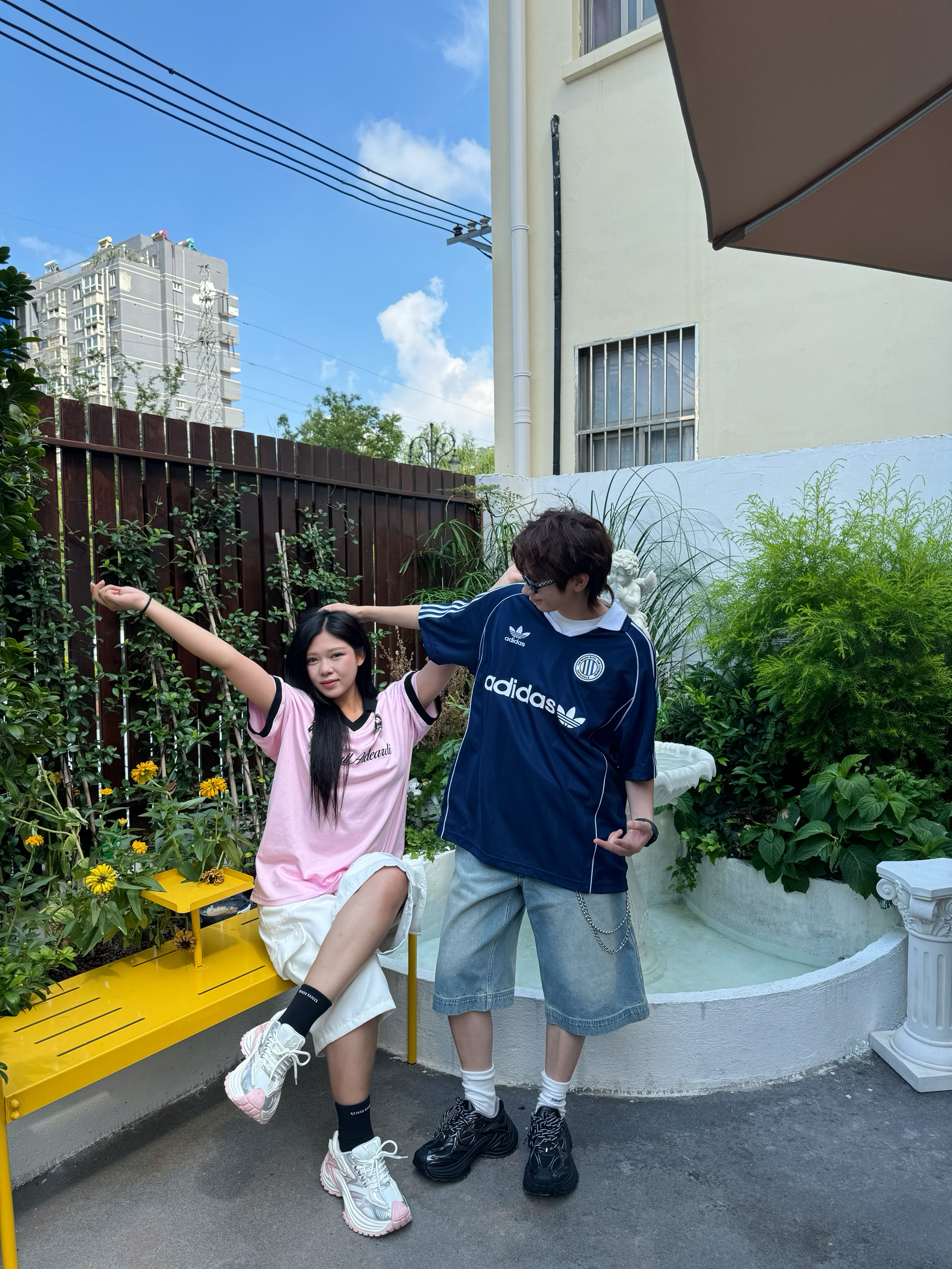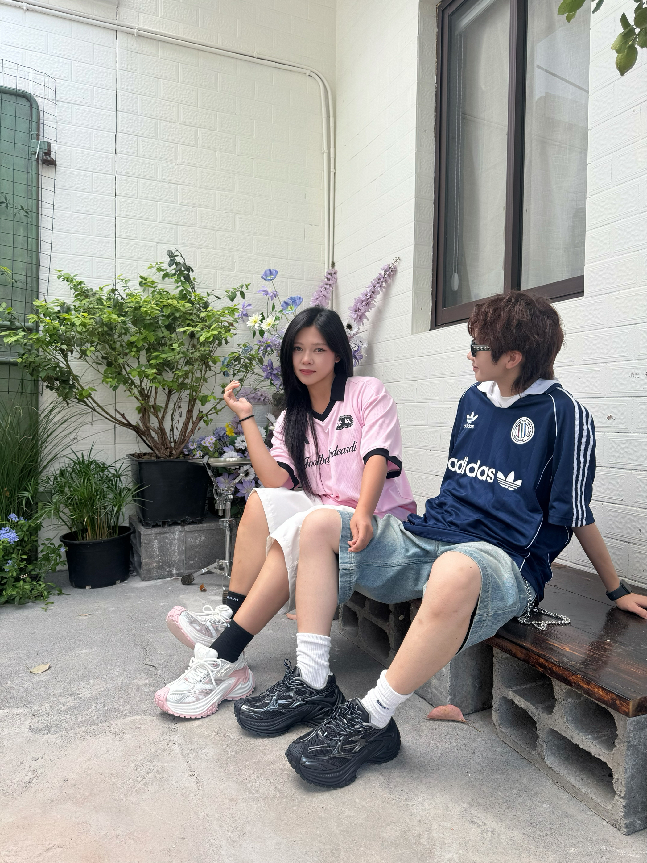今天来一套适合七夕约会的blokecore风情侣穿搭 🙇🏻:藏青色的阿迪球衣短袖➕浅蓝色做旧五分牛仔短裤➕黑色老爹鞋 🙇🏻♀️:粉色V领球衣➕白色七分工装裤➕粉色老爹鞋 两个人身高都不太够,只能靠老爹鞋外挂增高了 差不多能增高6cm左右↔️ 网眼透气鞋面,告别笨重闷脚 立体机甲风的外观,男生女生穿都很好看