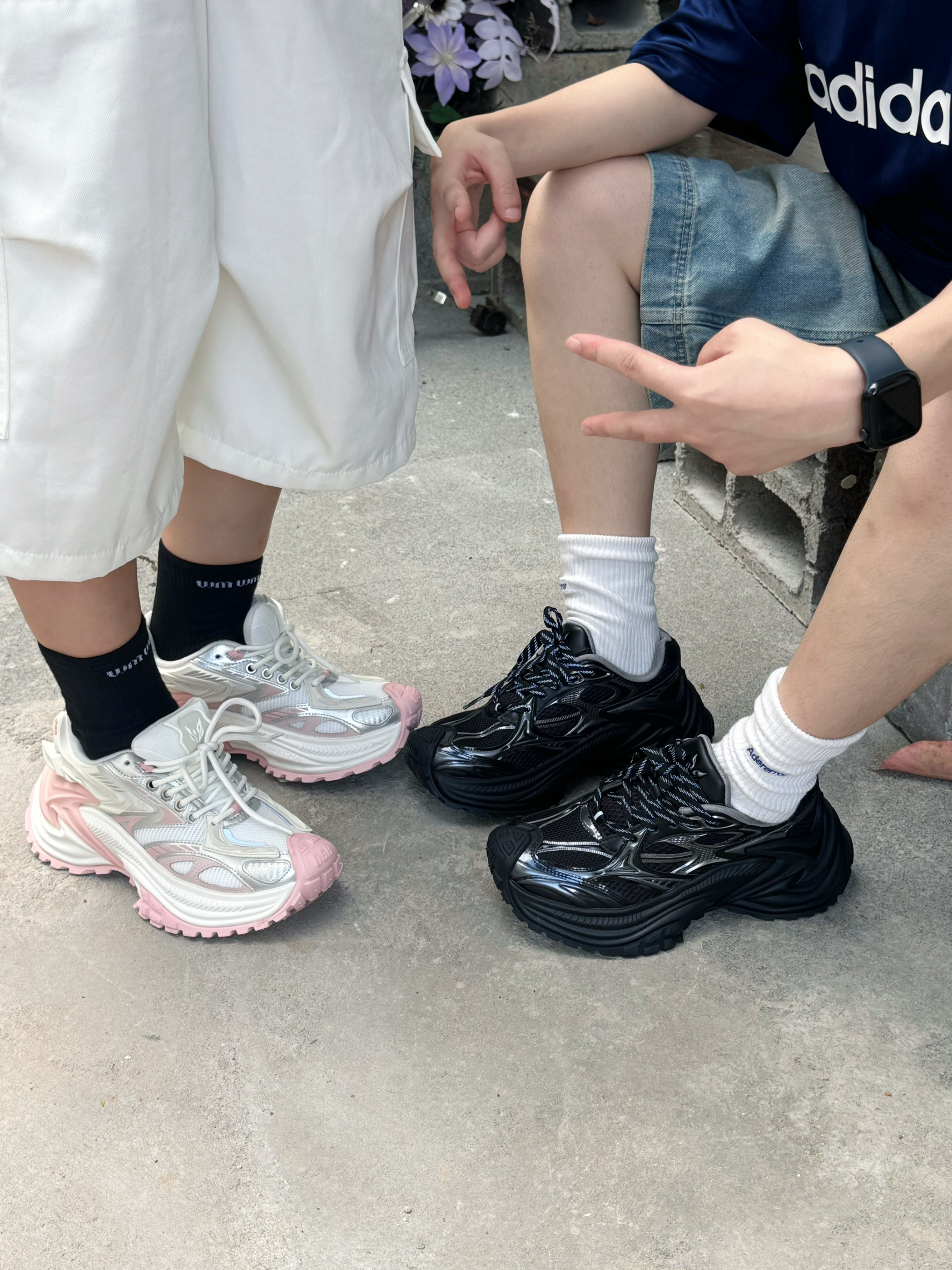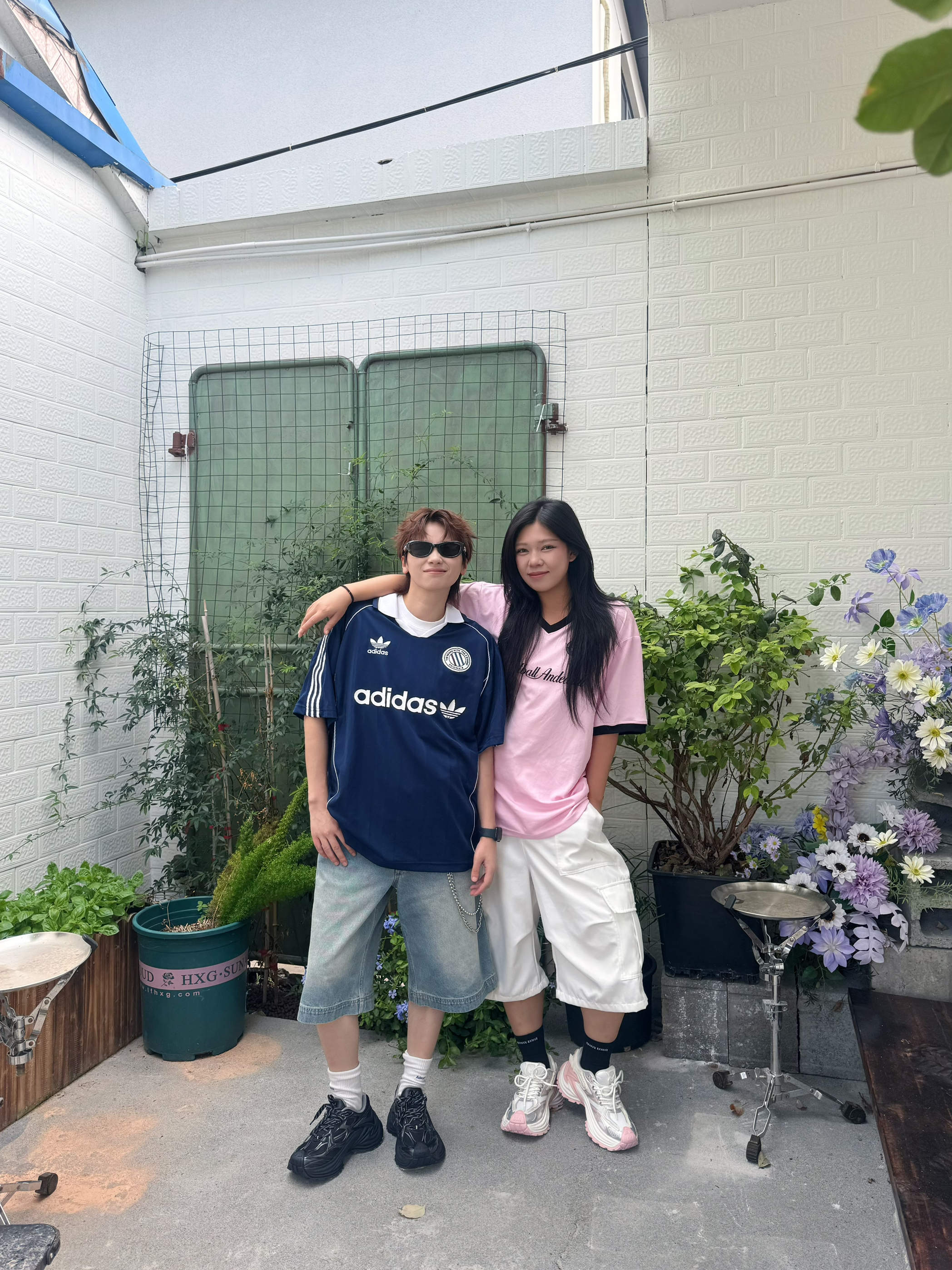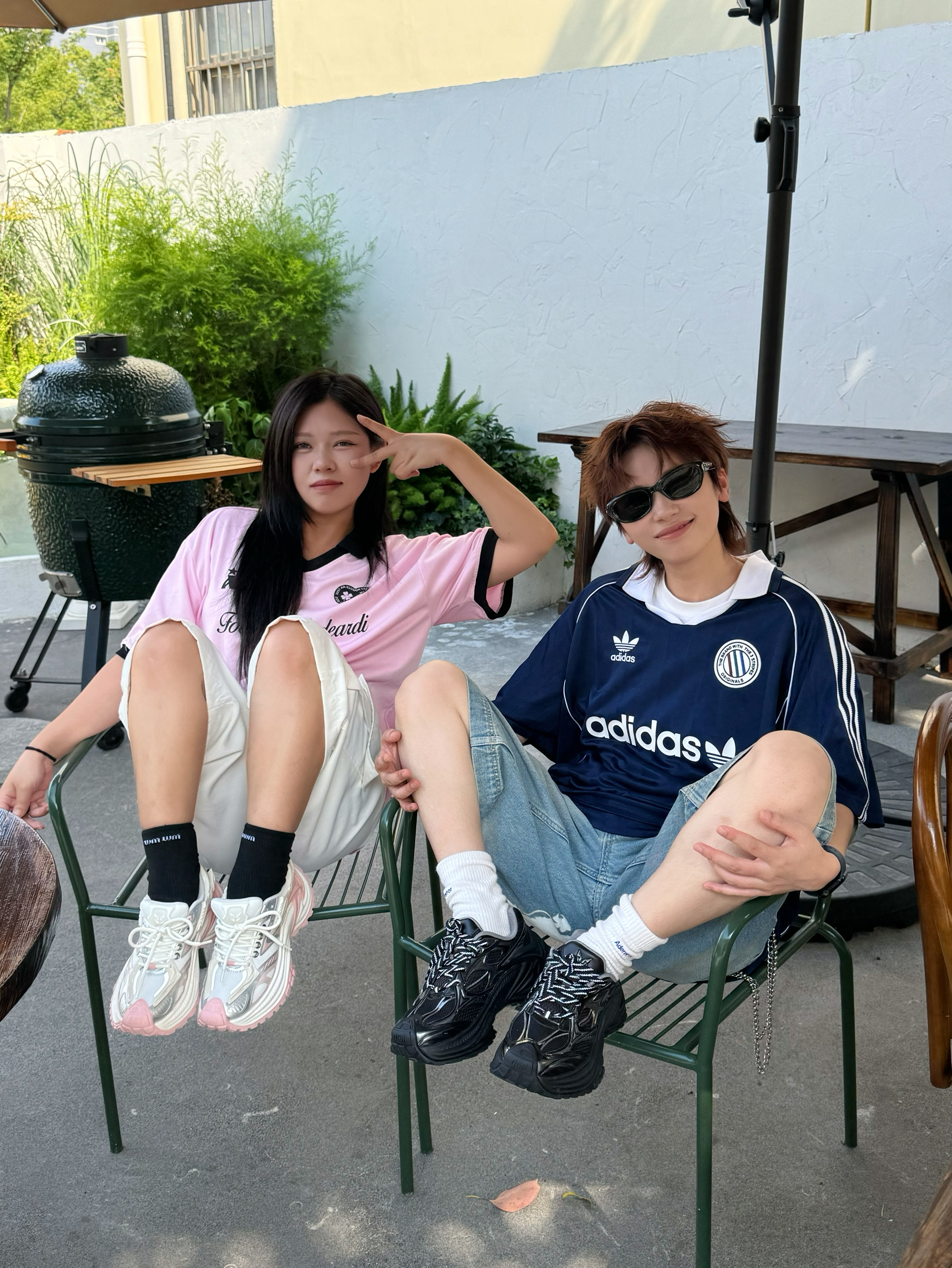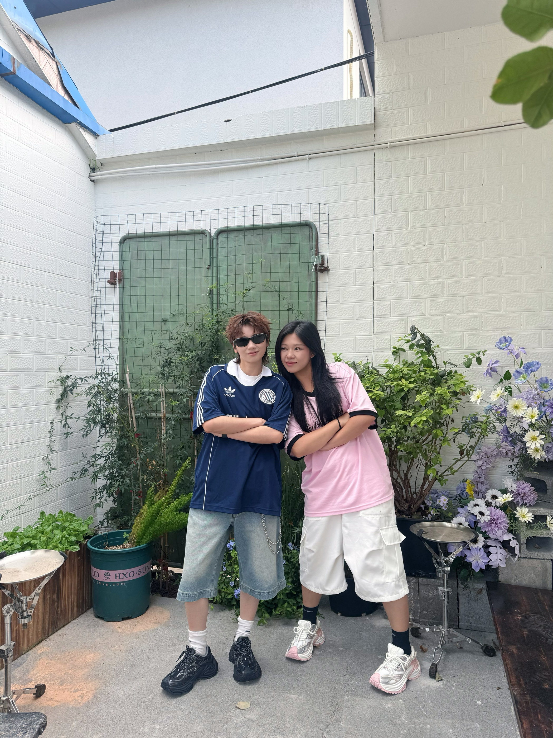 今天来一套适合七夕约会的blokecore风情侣穿搭 🙇🏻:藏青色的阿迪球衣短袖➕浅蓝色做旧五分牛仔短裤➕黑色老爹鞋 🙇🏻♀️:粉色V领球衣➕白色七分工装裤➕粉色老爹鞋 两个人身高都不太够,只能靠老爹鞋外挂增高了 差不多能增高6cm左右↔️ 网眼透气鞋面,告别笨重闷脚 立体机甲风的外观,男生女生穿都很好看