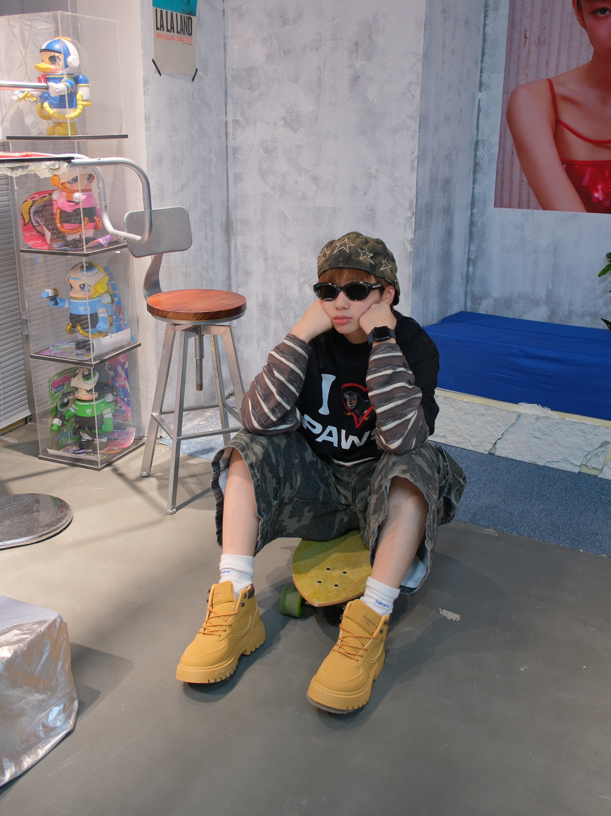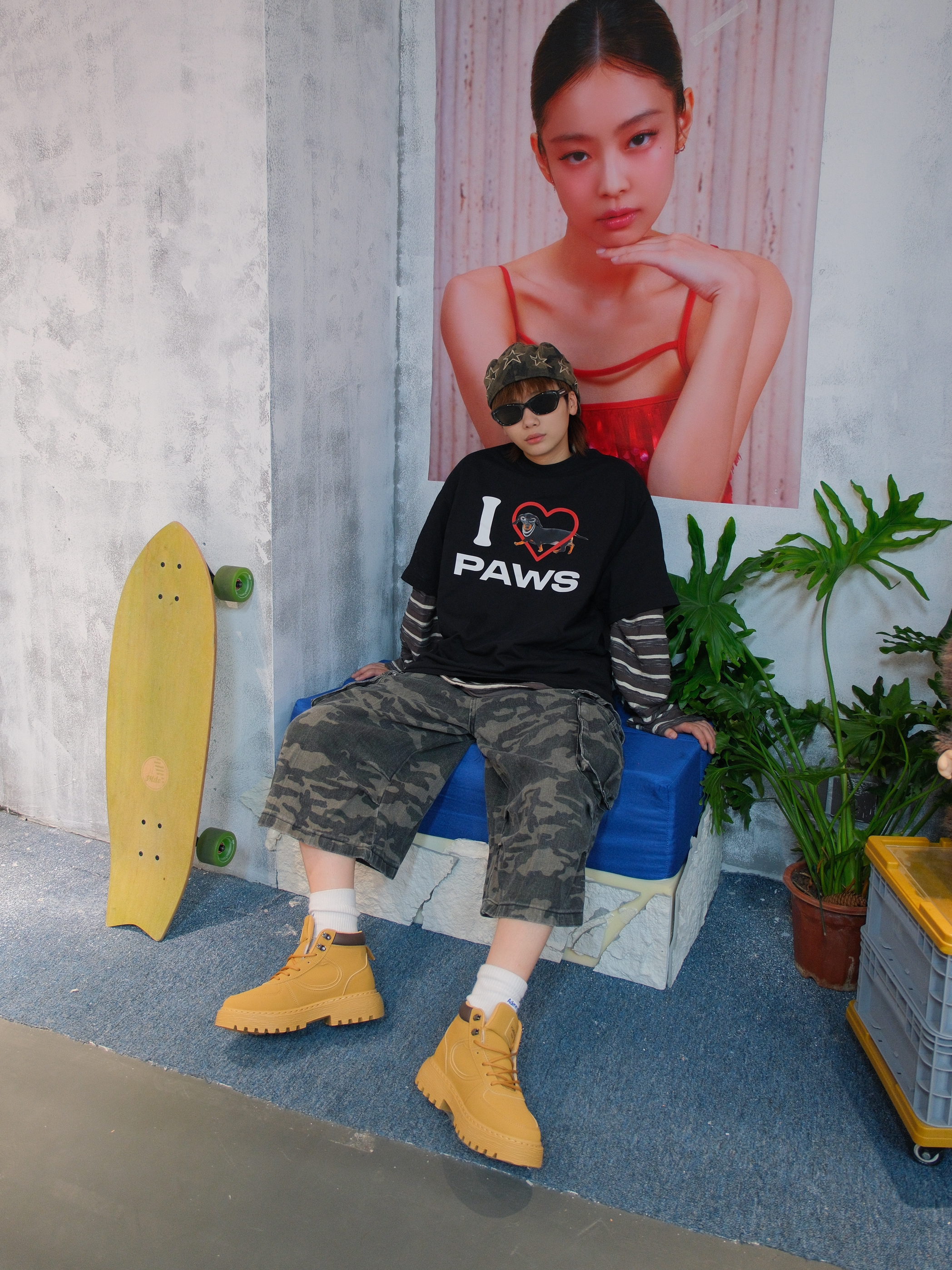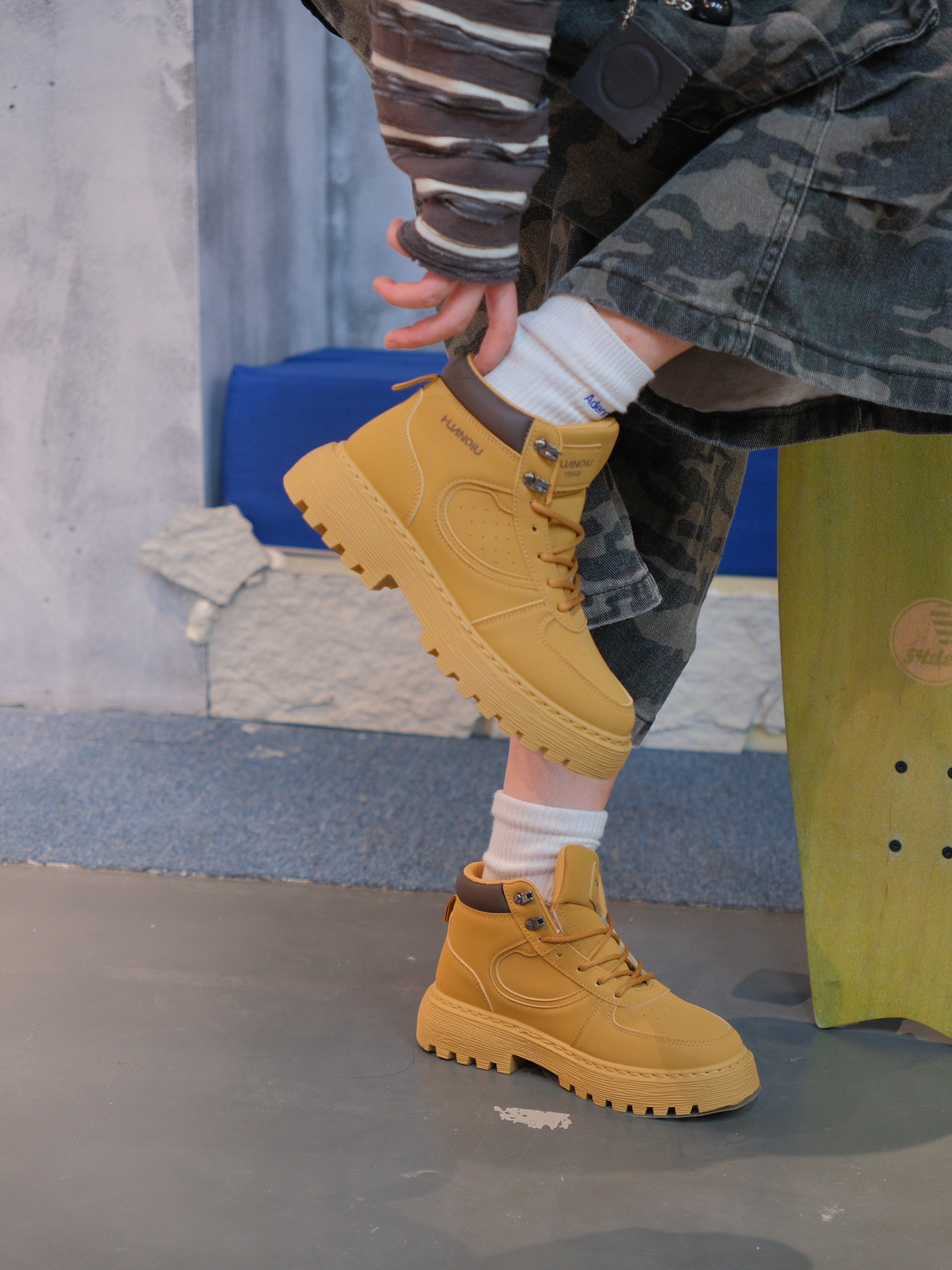 迷彩裤和大黄靴的组合,不亚于红蓝CP 适配度💯 最近有点喜欢叠叠le 上衣用一件条纹长袖叠穿黑色小狗T恤 搭配迷彩工装七分裤 再来一双大黄靴 就很有美式街头的氛围 中底差不多3cm左右,带点增高效果还显腿细 鞋面皮质也挺抗造的 上脚非常轻便