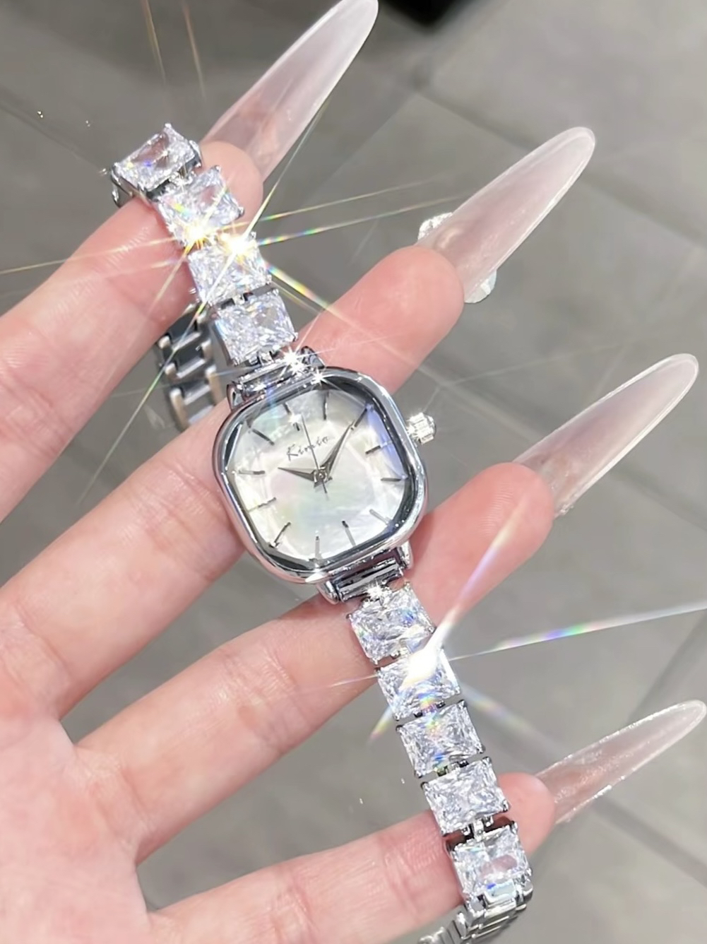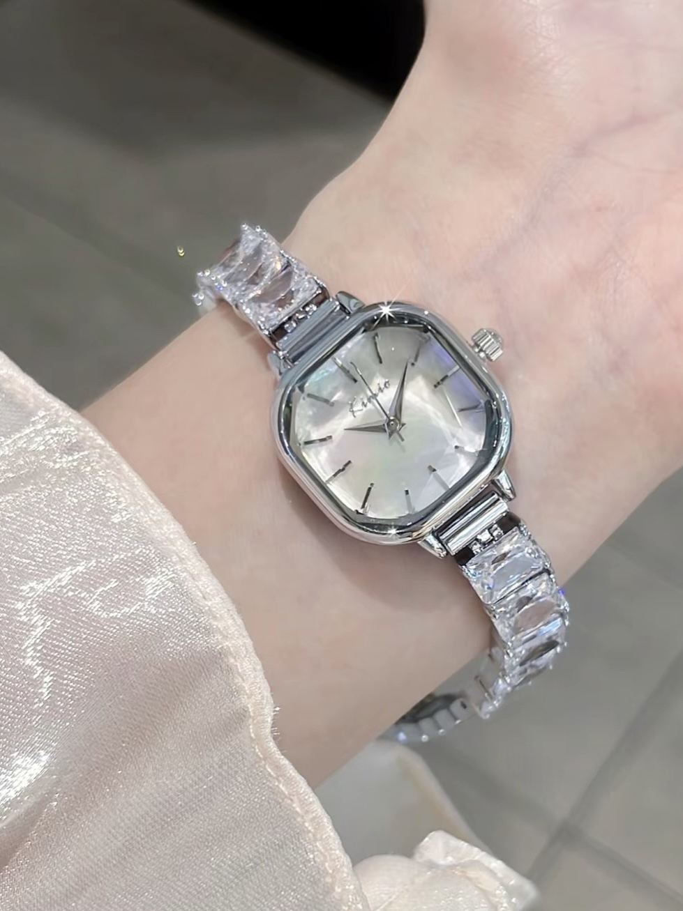 我勒个豆!清冷感直接拿捏住了!! 这个小方糖我是真的喜欢 我喜欢满钻表带爆闪的感觉 妥妥的清冷气质学姐调调耶 就很有气质 我日常通勤都戴它 不叠加其他配饰也已经足够加分~