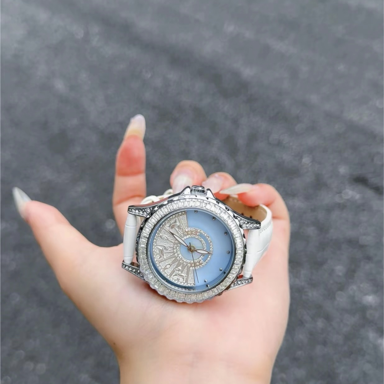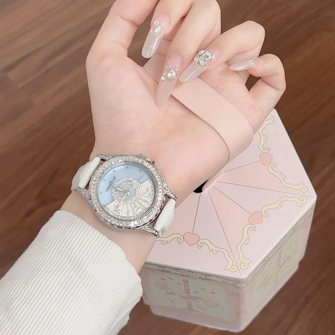 七夕要到啦,还在愁送什么礼物? 这款手表,简直是为浪漫氛围量身定制! 它的表盘设计精致又梦幻,浅蓝主色调像夏日晴空,搭配闪耀的水钻,blingbling的超吸睛,仿佛把星河都凝聚在了腕间。白色表带简约又优雅,不管是日常通勤还是约会小聚,都能轻松搭配,为穿搭增色不少。 再看这包装,精致的六边形礼盒,印着可爱的旋转木马图案,满满的少女心,打开的瞬间就仪式感拉满。把时间的浪漫与这份精致结合,送给心...