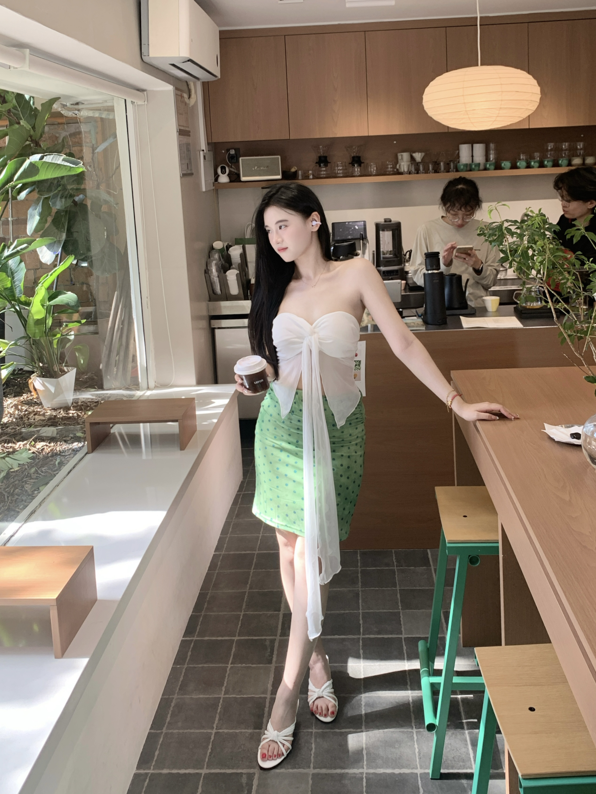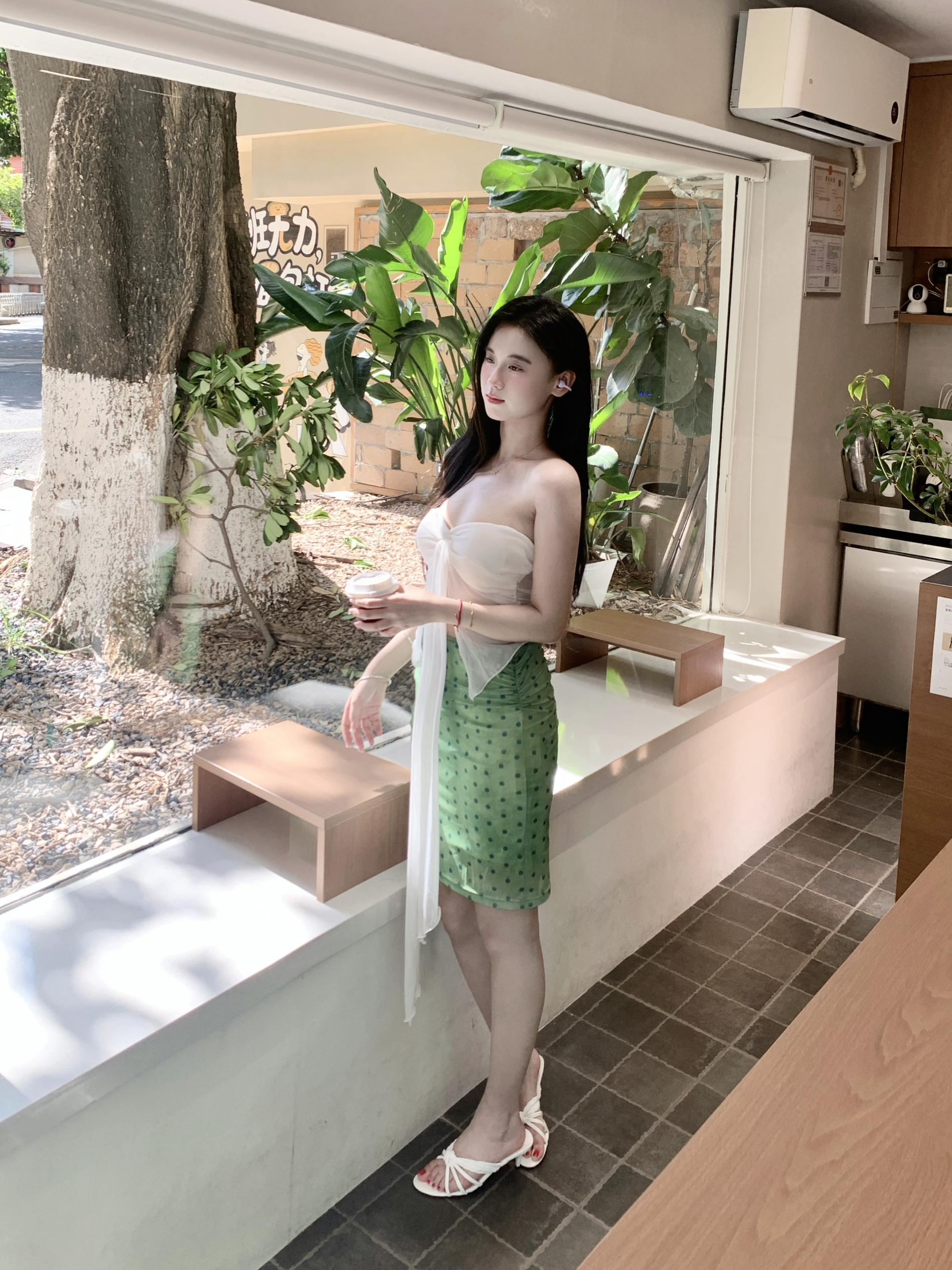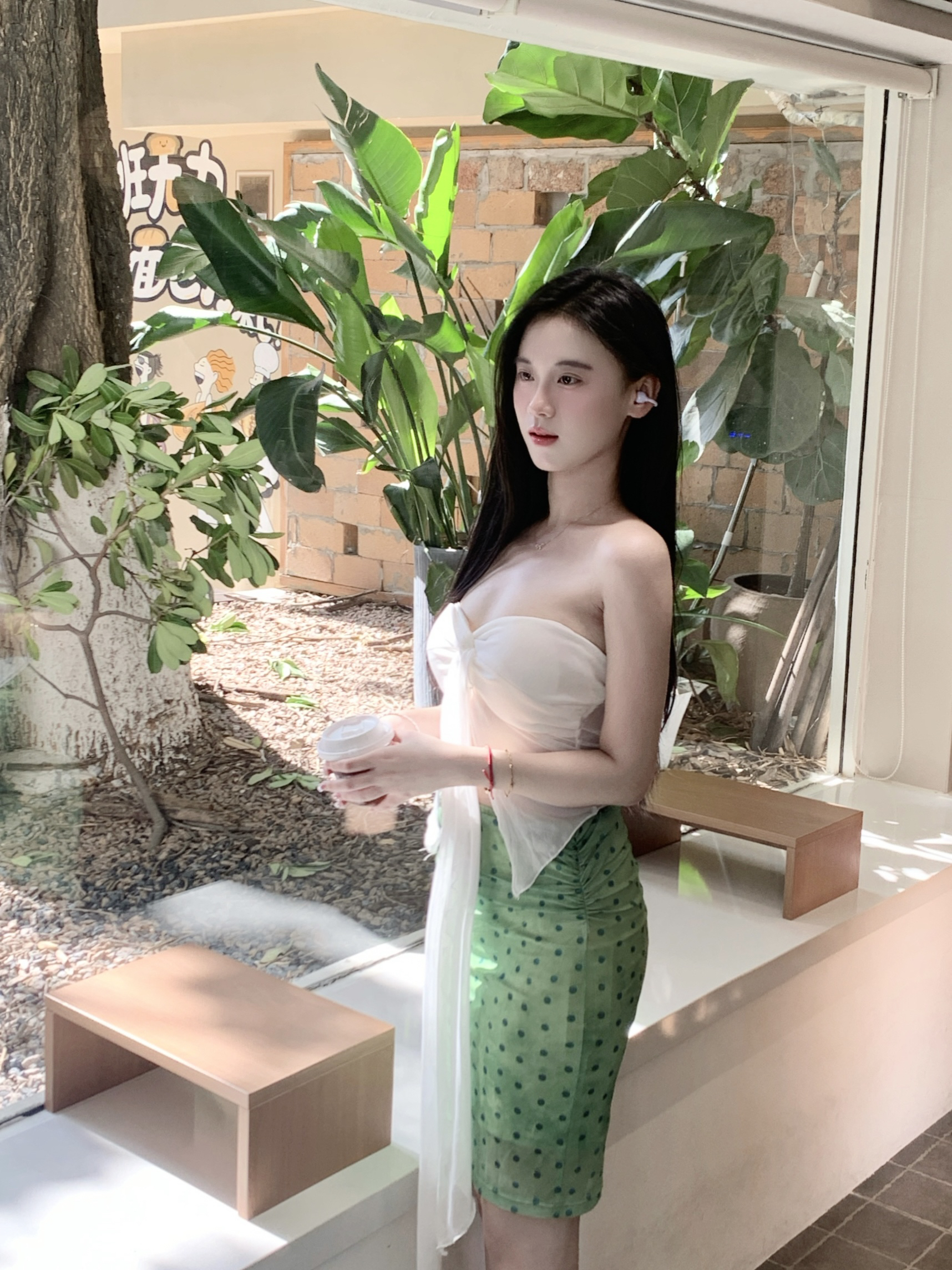 白色抹胸上衣十绿色中裙十白色高跟凉鞋 整套穿搭特别有南法度假风情的感觉!给人一种夏天清新感!出去拍照的时候搭上了最近新买的联想耳机!外观紫色的很温柔的配色,七夕送礼这个也很合适!