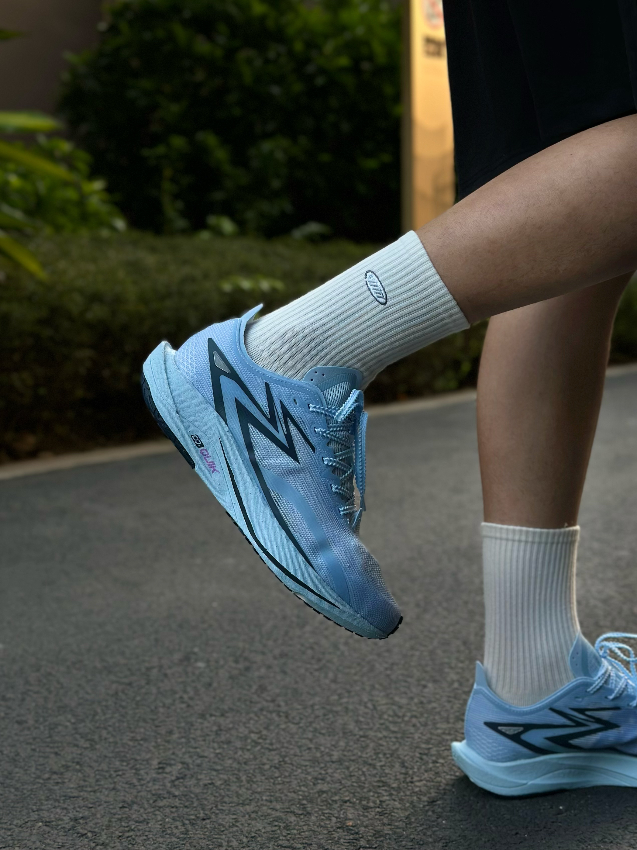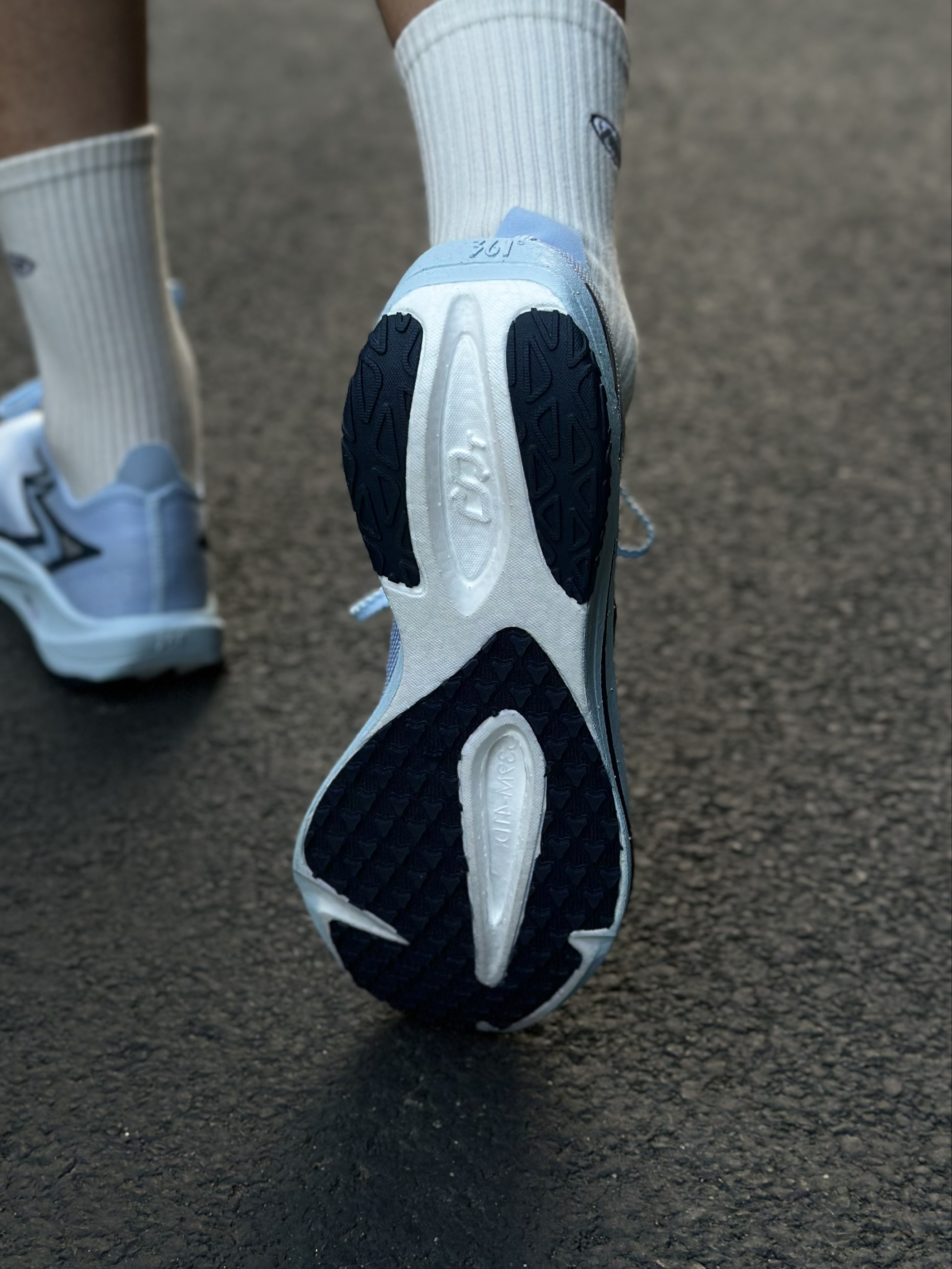 体测、竞训到日常通勤无缝切换的跑步鞋我找到啦!就是这双我最近常穿的361° 飙速Team 天空之境 场地训练跑鞋,冰蓝色🧊的鞋身自带清爽降温Buff,还蛮适合夏天的~ 一体织梭织鞋面搭配上轻量化的鞋身设计,上脚轻便透气跑起来没有什么负担,我这双是42码单只重量大概在190g左右。 前后掌6mm的坡差,跑动落地更加流畅,而它的中底则是搭载了全掌CQT QUIK科技,回弹反馈明显,脚感踩起来也很舒...