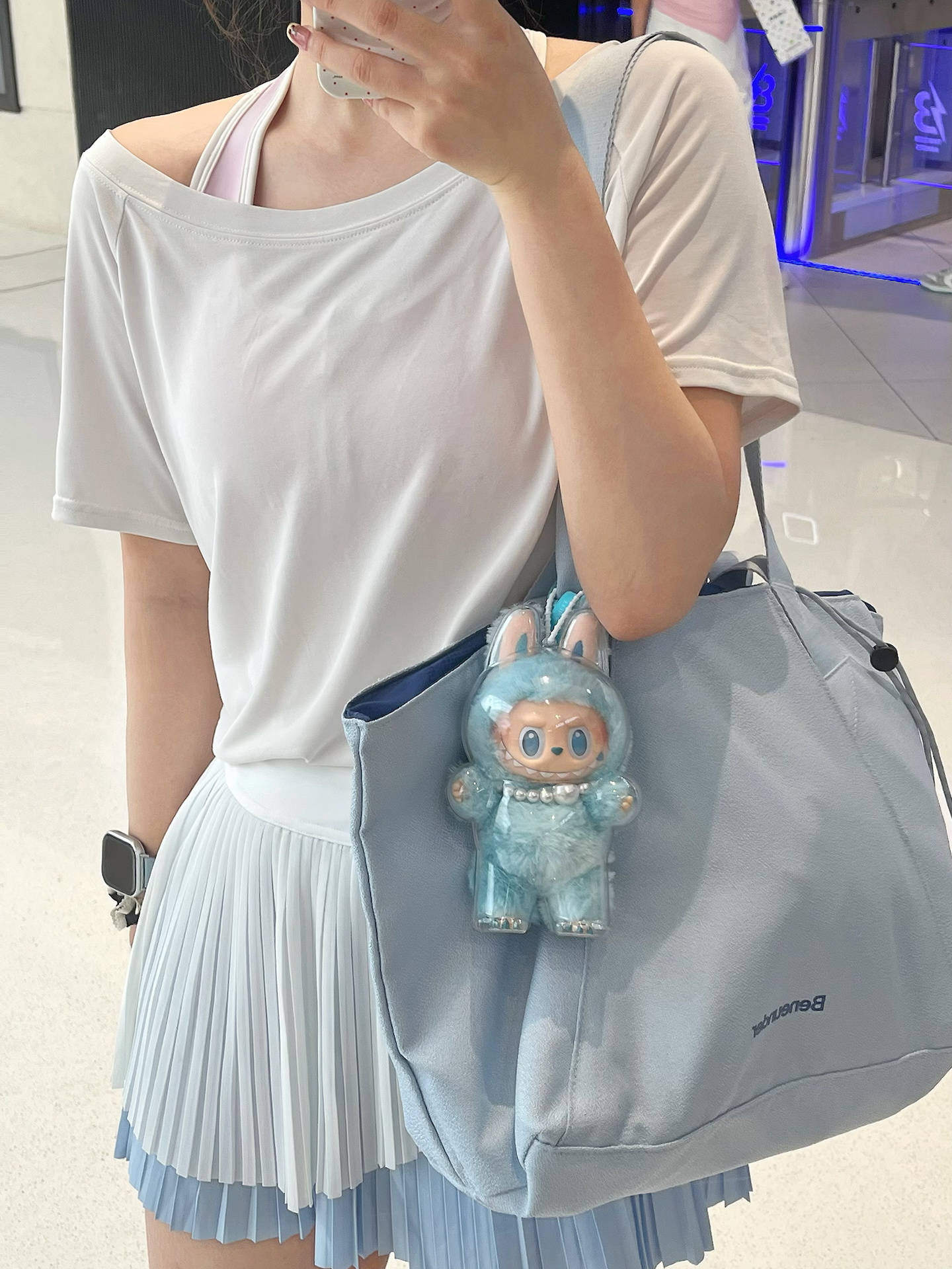 家人们谁懂啊!我发现了一款超可的托特包👜。我搭配了泡泡玛特拉布布挂件,简直萌化了~日常通勤、健身出行背着都很合适。尼龙材质轻便又耐用,就是没有夹层这点,对我这种喜欢分区收纳的人来说有点小困扰。但整体颜值太让我心动啦💓。