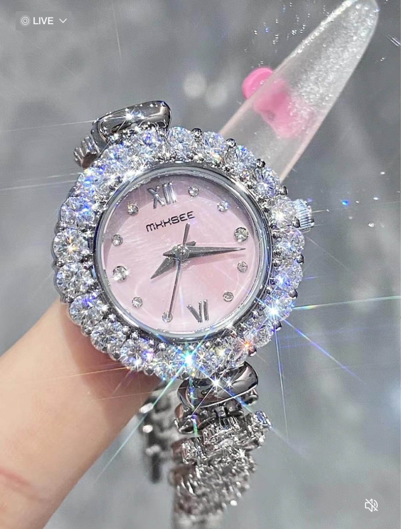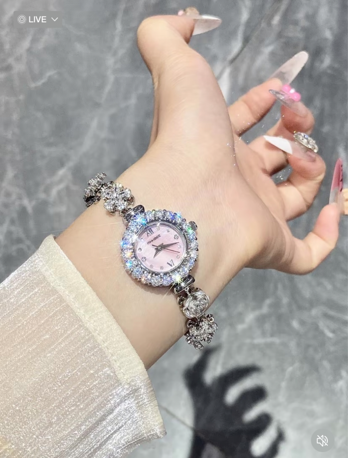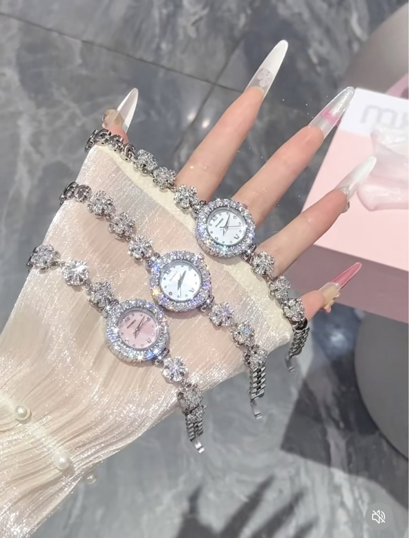 这三款手表好bulingbuling的 而且三款的表链都是可以转动的小雪花器设计 粉色表盘 感觉比较甜美 贝母表盘 比较梦幻 白色表盘 比较简约 质感都蛮不错的~ 唯一 的缺点就是小雪花然容易勾线 而而且戴上个人感觉也比较精致