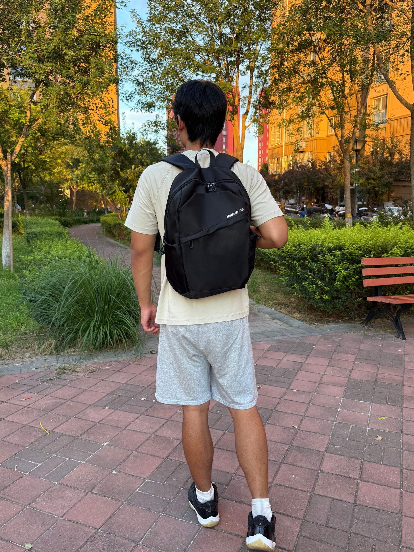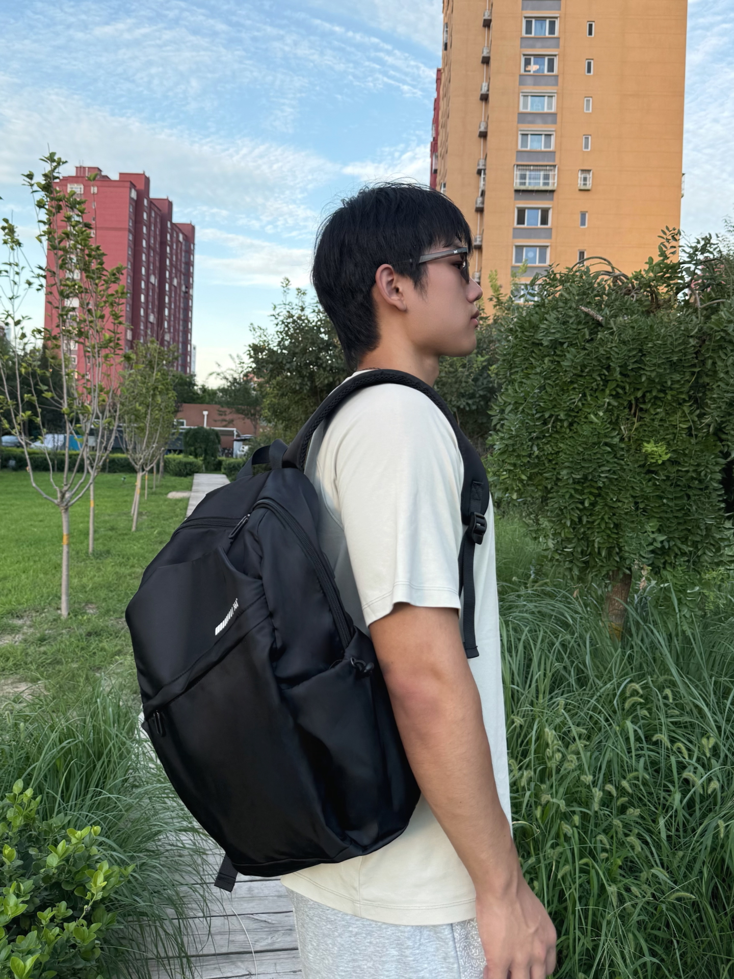 双肩包真的是学生党和通勤族标配啦~我最近背的这款包真的爱了🥰。黑色配白色logo经典又百搭👍,颜值很高。它容量超大,我的16寸笔记本放进去毫无压力,还有很多夹层方便收纳书本、电子产品👏。而且有数据线预留口很贴心~就是它面料厚实,夏天背可能有点热,不过整体真的很实用,上学上班背着都合适!