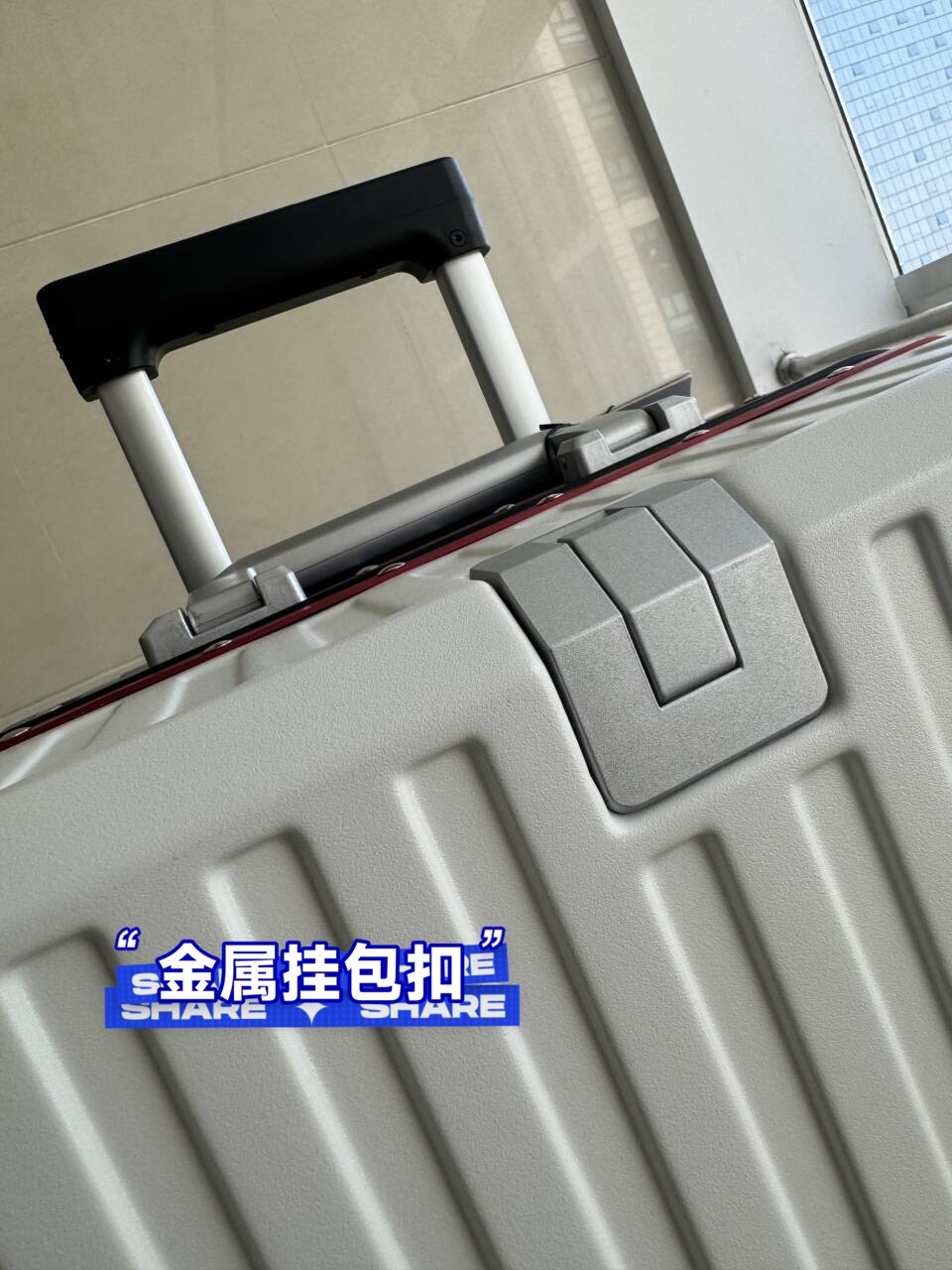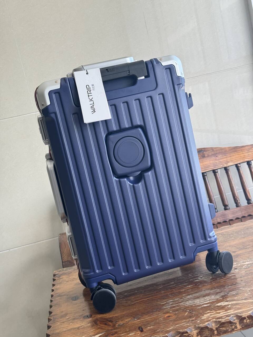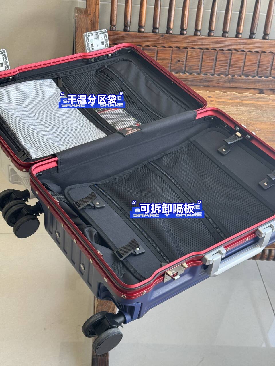 我终于找到了超心水的行李箱😍!白蓝撞色搭配,还有铝合金边框和金属防撞包角,颜值和耐用度都在线~功能也超丰富,水杯架、USB充电口都有,还有手机支架,候机时追剧超方便。内饰干湿分区很贴心,唯一不足是自重稍有点沉,但也能接受啦!