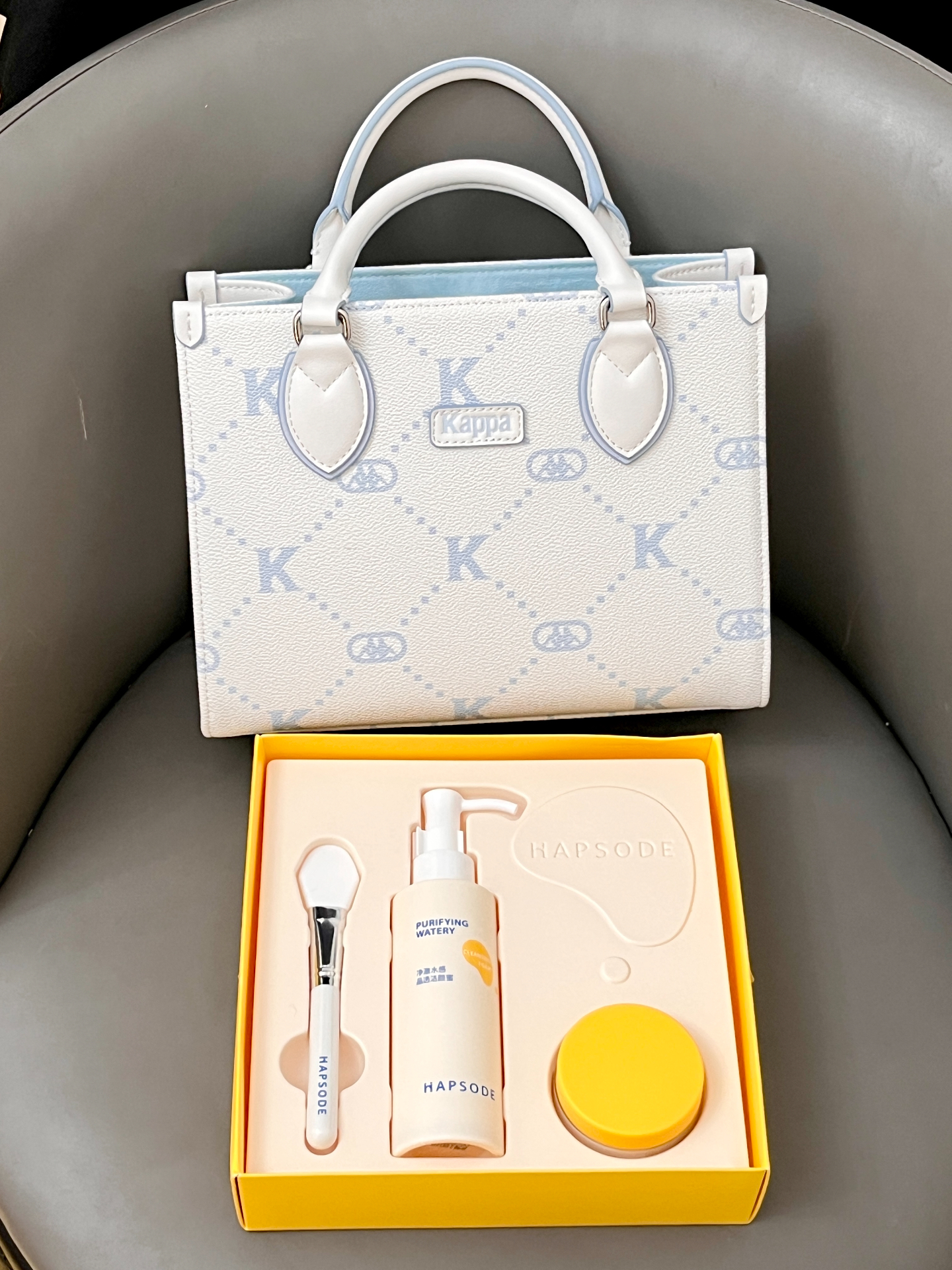 我的海盐托特包好喜欢哇 它的容量也挺大的 可以装得下我这套悦芙媞清洁护肤套装 一瓶洁颜蜜和清洁泥膜 像我这个油痘肌用起来刚刚好 这一大瓶洁颜蜜够我用一学期了 水感质地 搭配送的起泡网起泡特别丰富 我觉得洗完脸蛋清清爽爽的特别舒服 还有这个泥膜 酸奶质地很好推开 清理黑头效果很明显 上脸也不拔干…蛮舒适的 还送了两个旅行装出门携带刚好 这一套放在我的包包里跨年夜出去玩好方便