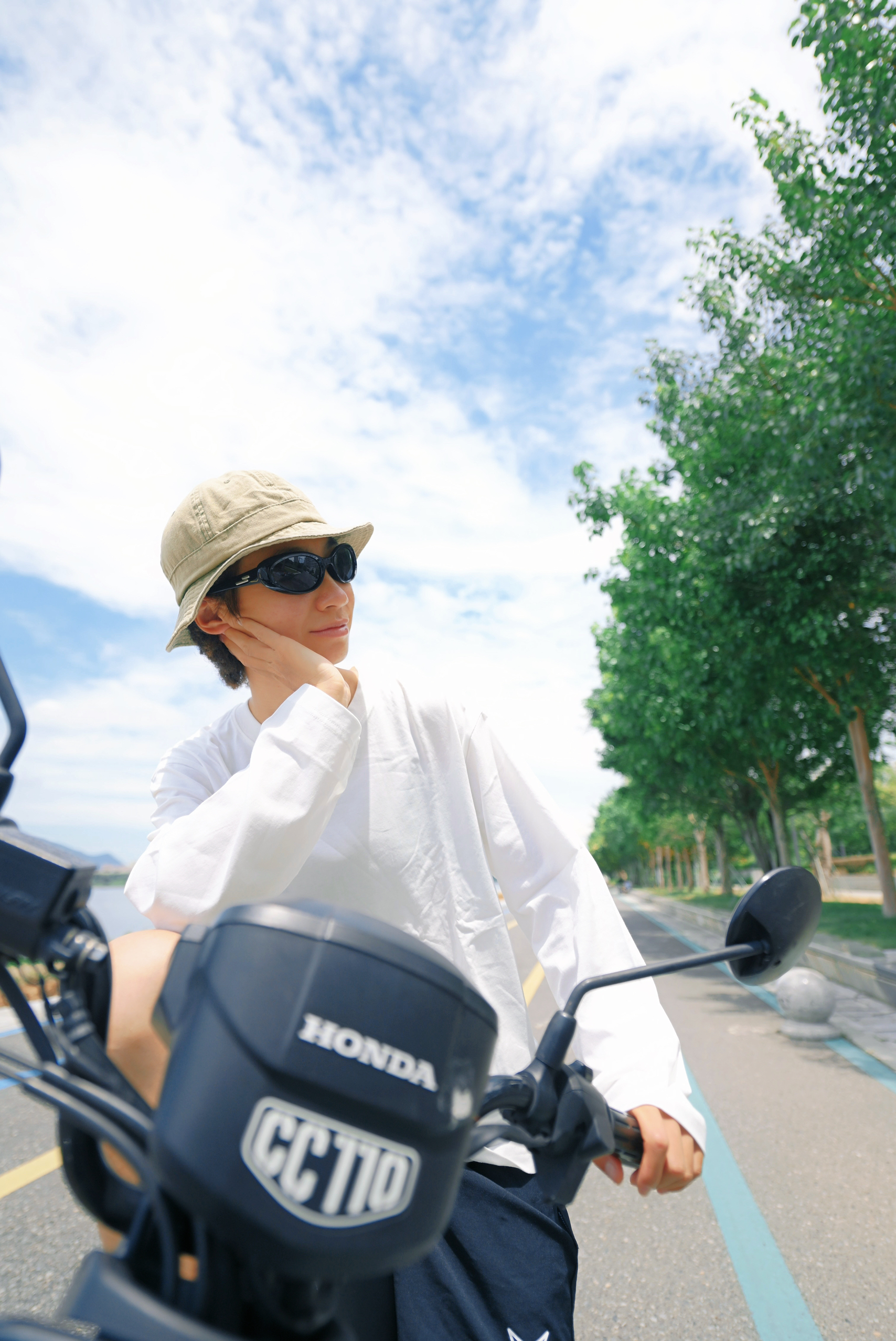 欢迎进入无敌小圆哇子的穿搭分享频道 172CM|55KG 👔:m👖:m|👟:39码 夏日的湖边骑行 上身森马中性白长袖T恤打底 纯棉透气不闷汗 宽松剪裁自带慵懒感 搭配黑色短裤形成经典撞色 视觉清爽又利落 脚踩黑色萨洛蒙运动鞋呼应裤装 军绿色渔夫帽点睛整体,注入户外机能风 Gogogo 摩托佬出发!
