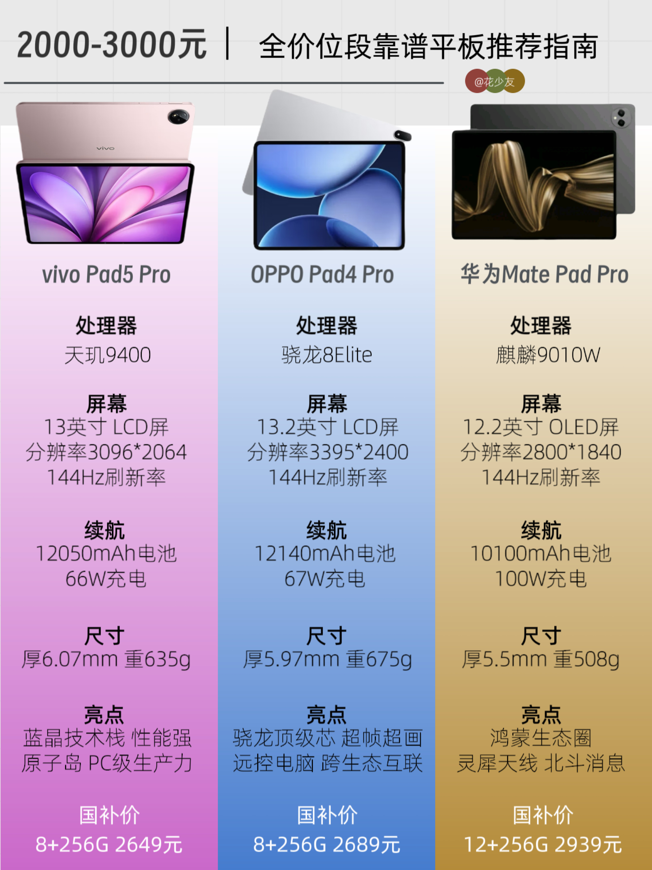 OPPO pad4pro:13.2英寸3.4K 144Hz超清原彩屏,屏幕素质高。骁龙8至尊处理器,性能释放强劲,重载手游实现超帧超画流畅运行。超大电池续航持久,跨生态互联以及办公体验出色。