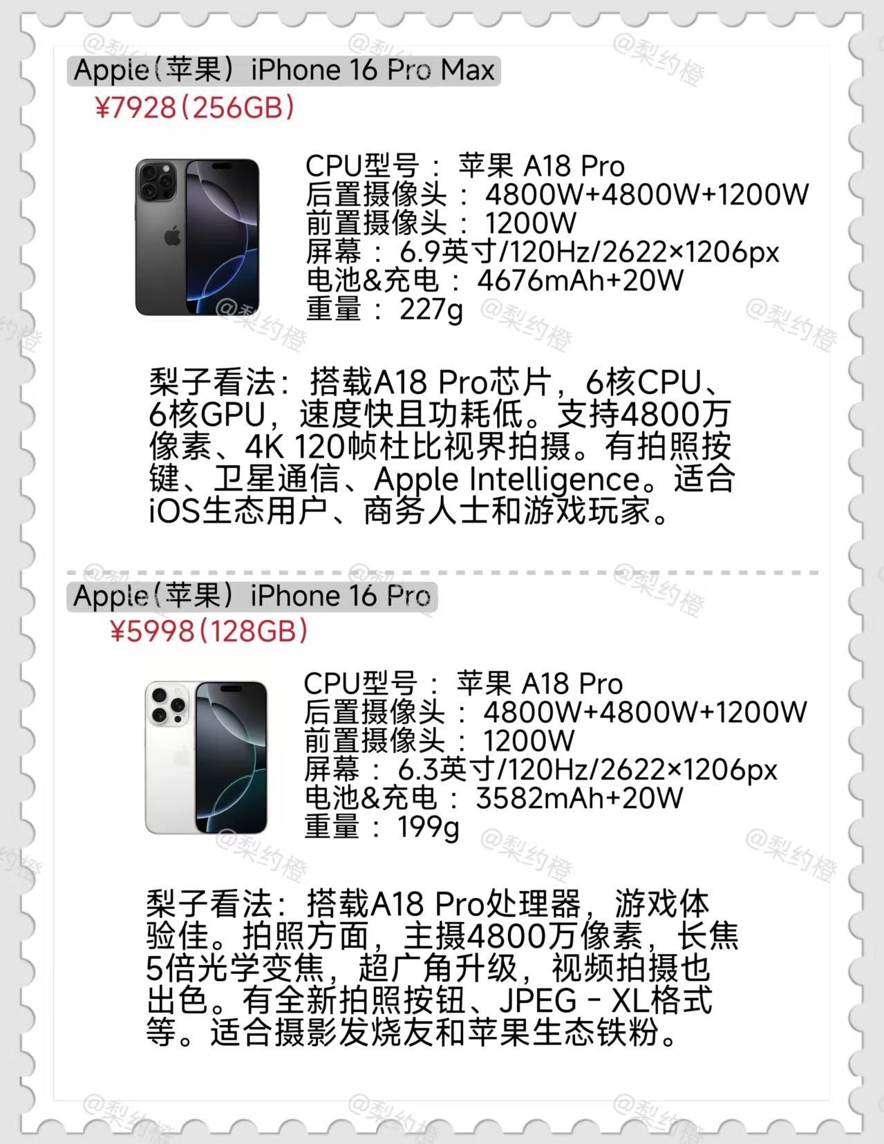 iPhone 16 Pro Max:性能堪称顶级,搭载强大芯片,运行流畅度无可挑剔。拍照方面,高像素与先进算法让画面细节纤毫毕现。适合追求极致体验、对摄影创作有高要求的专业人士。 _ iPhone 16 Pro:性能强劲,多任务处理轻松应对。拍照具备出色色彩还原和夜景表现。特色在于专业的摄影功能和便捷的操作体验。适合摄影爱好者和对手机性能有较高需求的商务人士。 _ iPhone 16:性能稳定,能...