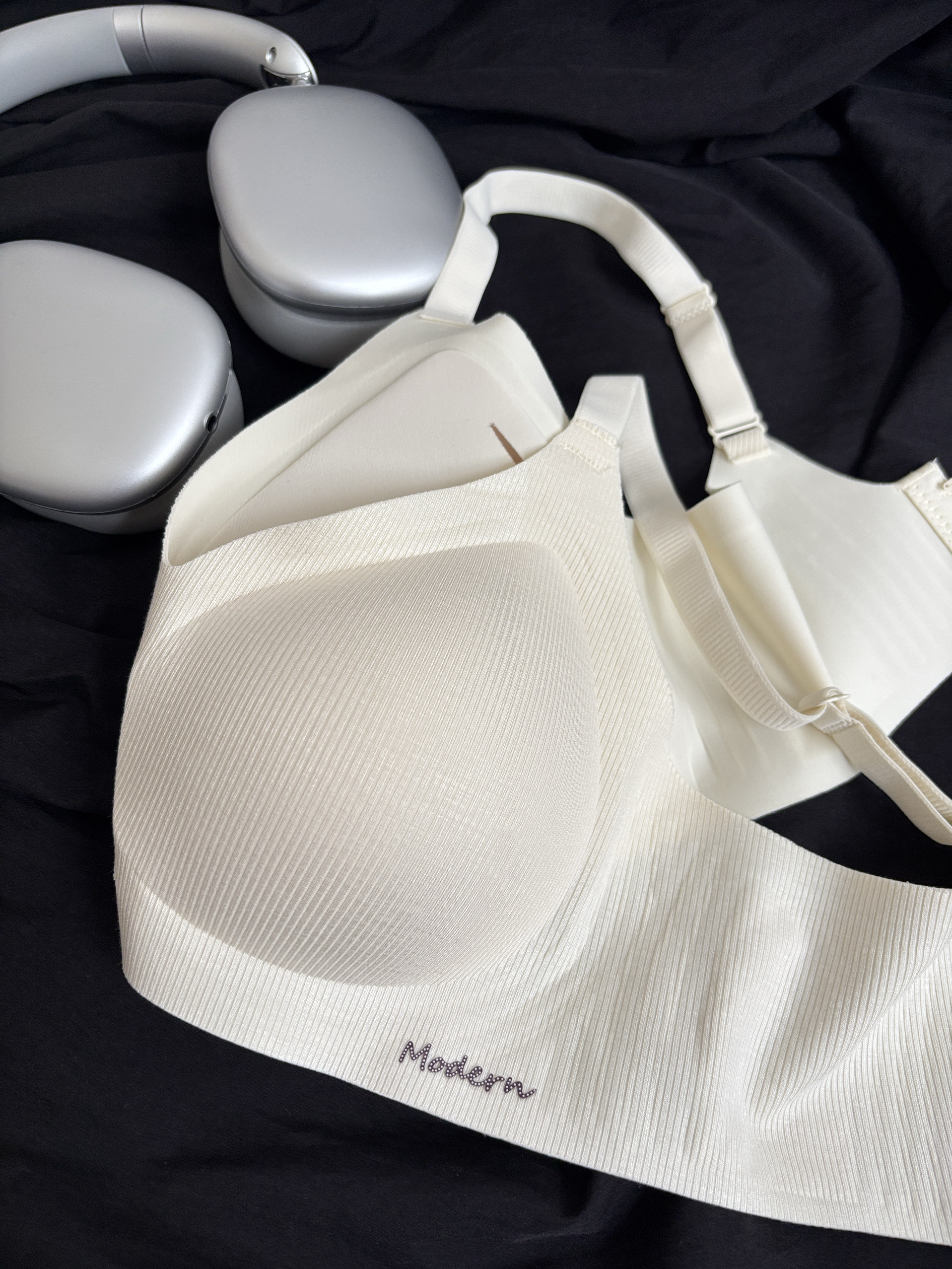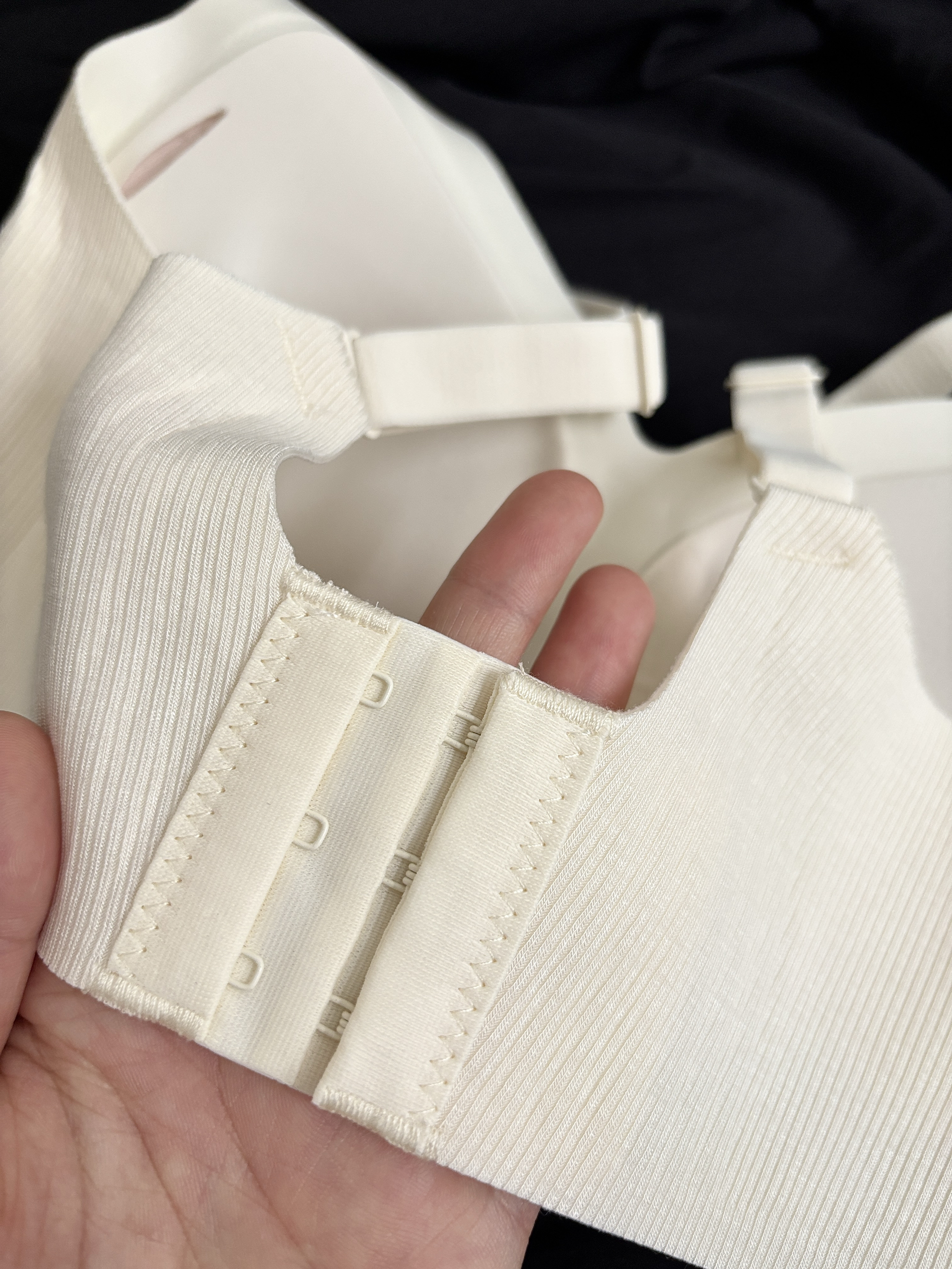 介个薄款软支撑无痕内衣 暗纹肌理条纹简单舒适又透气 内里是果冻胶条和水滴型胸垫不跑杯空杯 胸垫是可拆卸的清洗方便👌 肩带可调节整体微微的弹力不勒穿着很舒服 穿它搭配罩衫T恤都可舒适感满满 我日常穿或当内搭都舒服😌