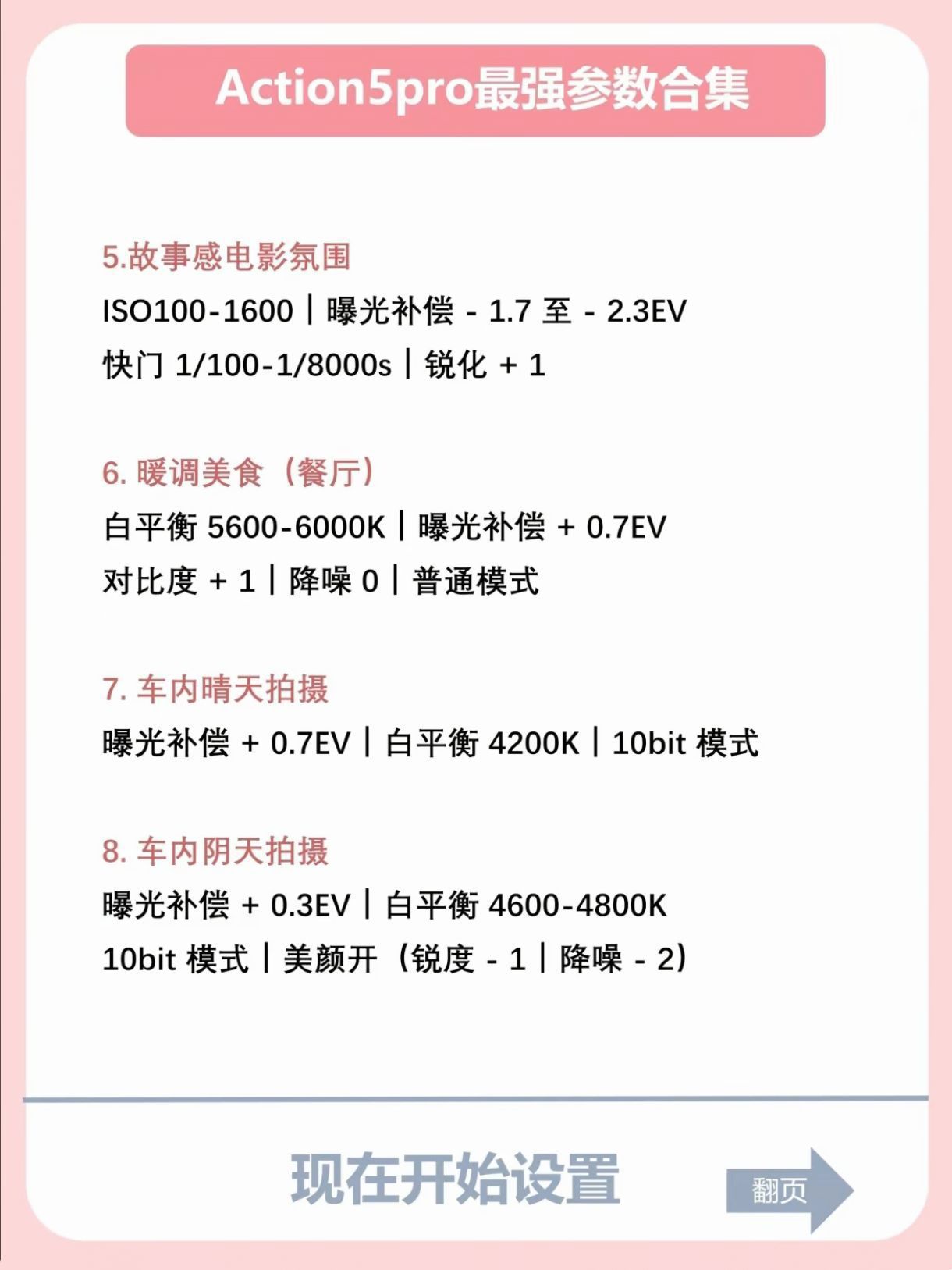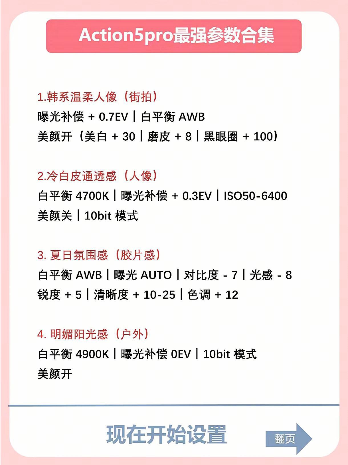 🚀 新入的Action 5 Pro真香!但参数不调好,拍出来总差点意思?花时间整理了一波超实用的参数设置合集,整整15组!覆盖了日常/旅行/运动各种需求: ✨ 人像党福利: 韩系温柔街拍(+0.7EV / AWB / 美颜开) - 谁拍谁温柔 冷白皮通透感(4700K / +0.3EV / 美颜关 / 10bit) - 自带美白滤镜效果! 明媚阳光感(4900K / 10bit / 美颜开...